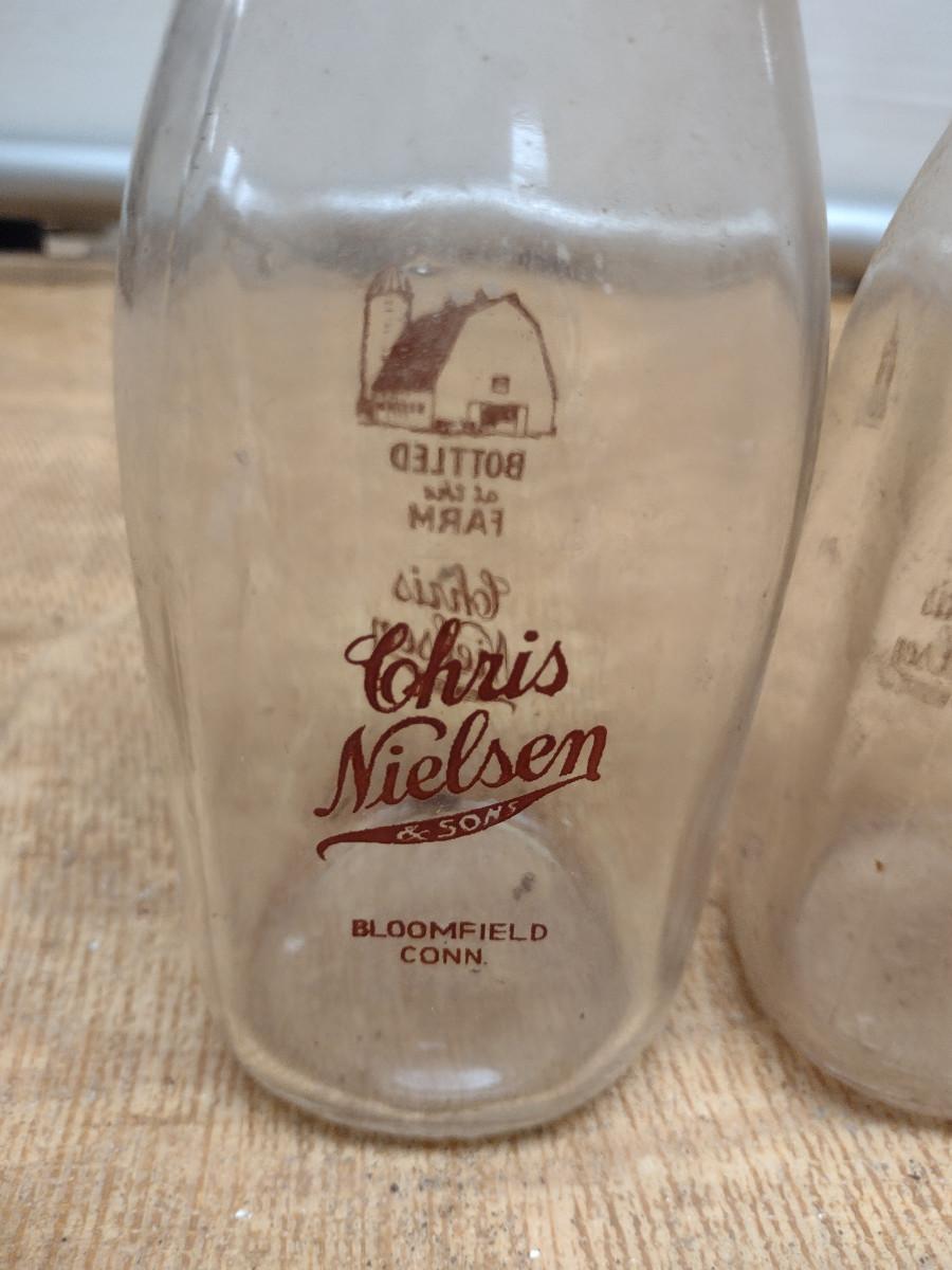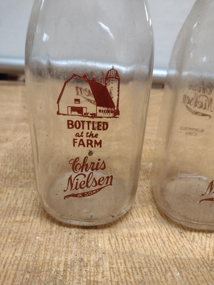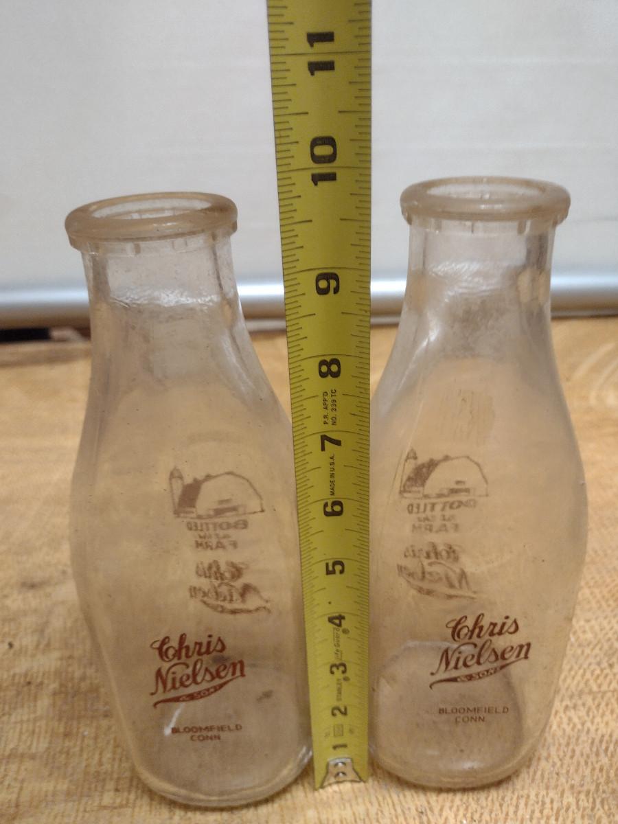 Two Quart Size Painted Milk Bottles (#5). Stored in non-climatized basement so expect item may need to be cleaned from dust, insects, etc. Shipped in as is condition