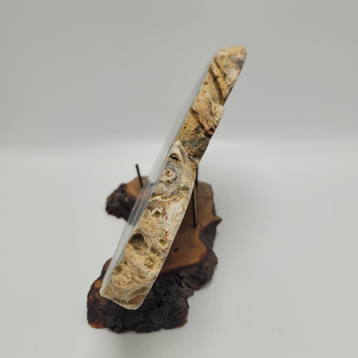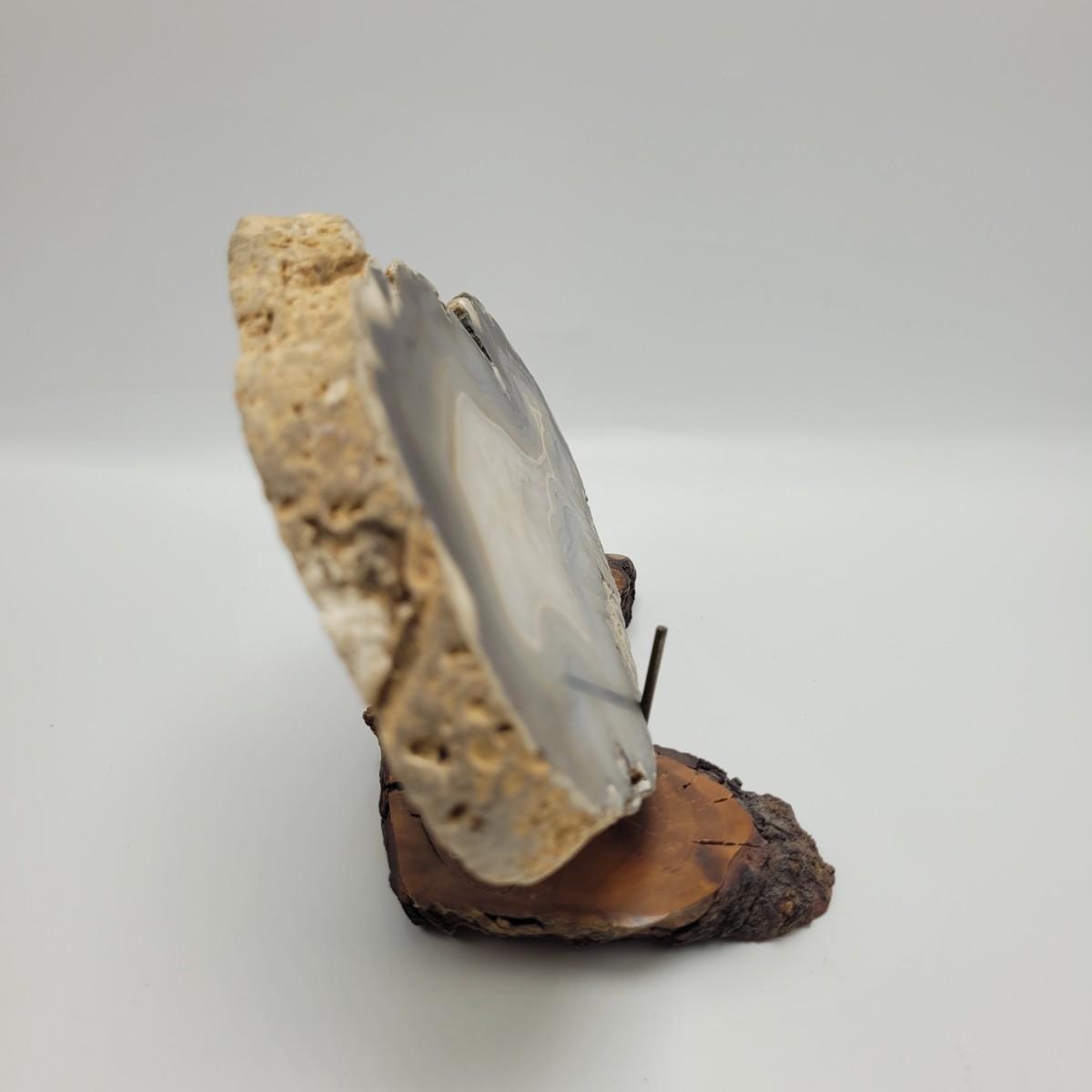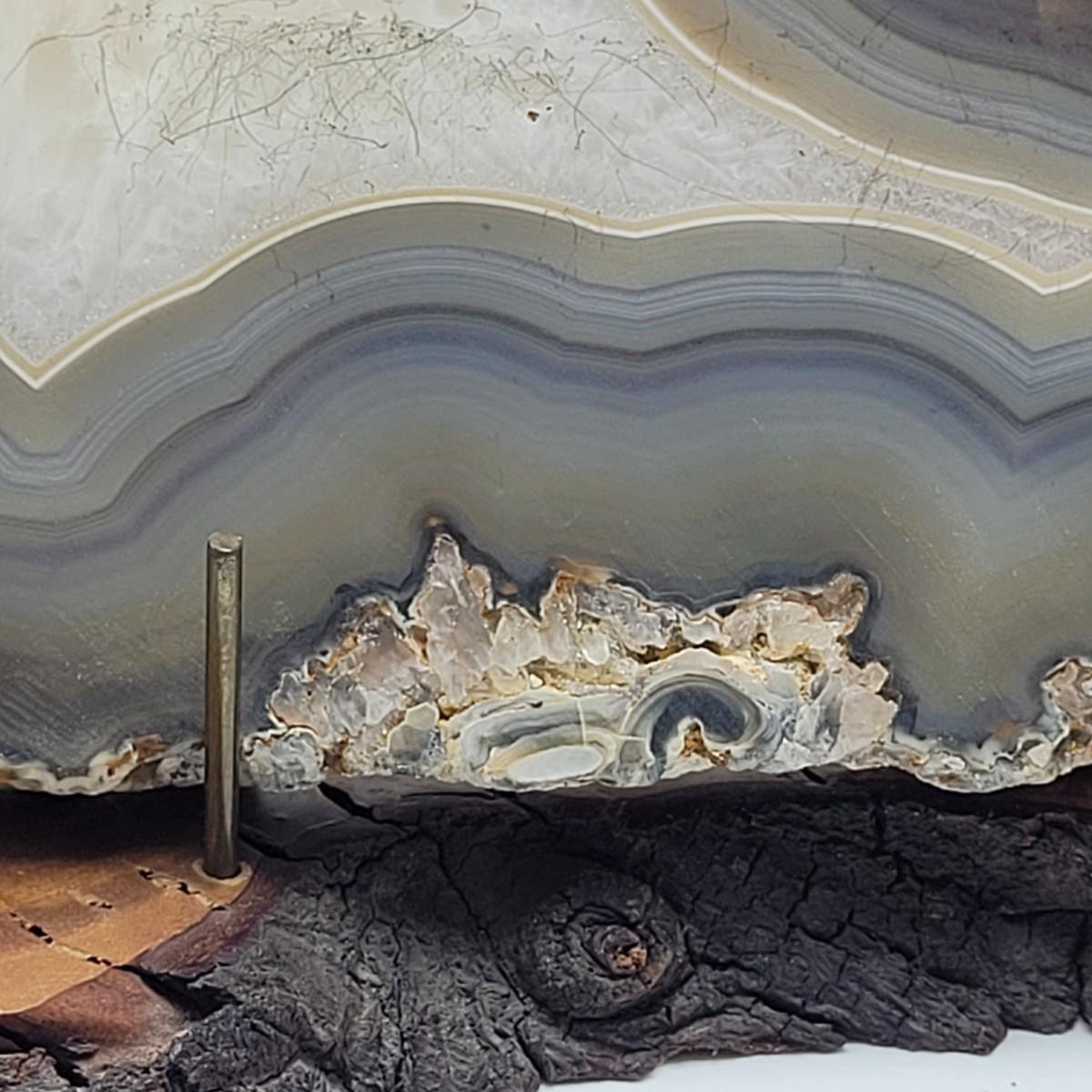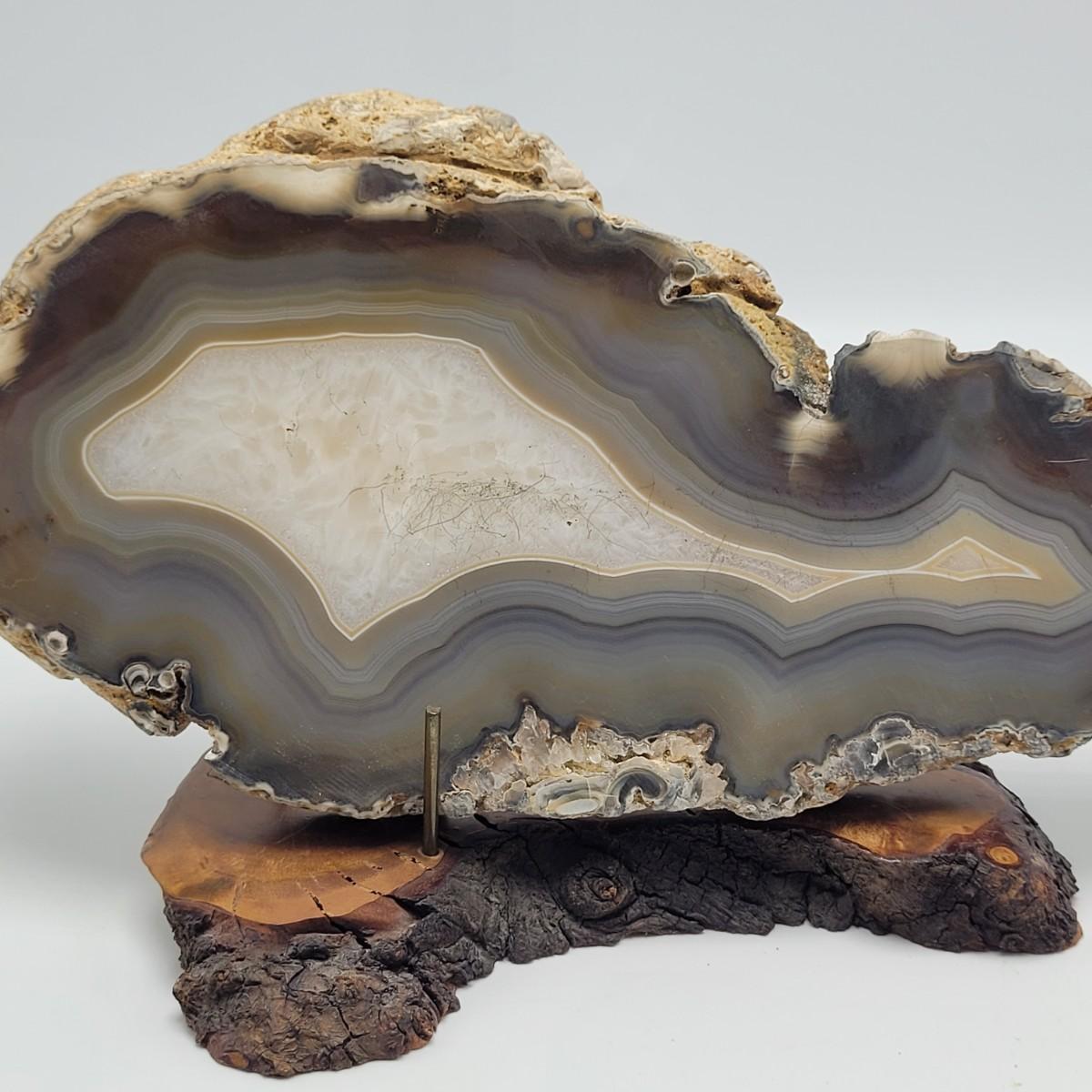 This lot includes what appears to be two quartz agate stones with wooden display stands. The first stone is a Sliced and polished geode. While sitting on its display stand, it measures 5" x 4" x 7.5"H. The second piece is a polished slice of stone revealing layers of blues and grays. While on its stand, this stone measures 8.5" x 4" x 5"H.