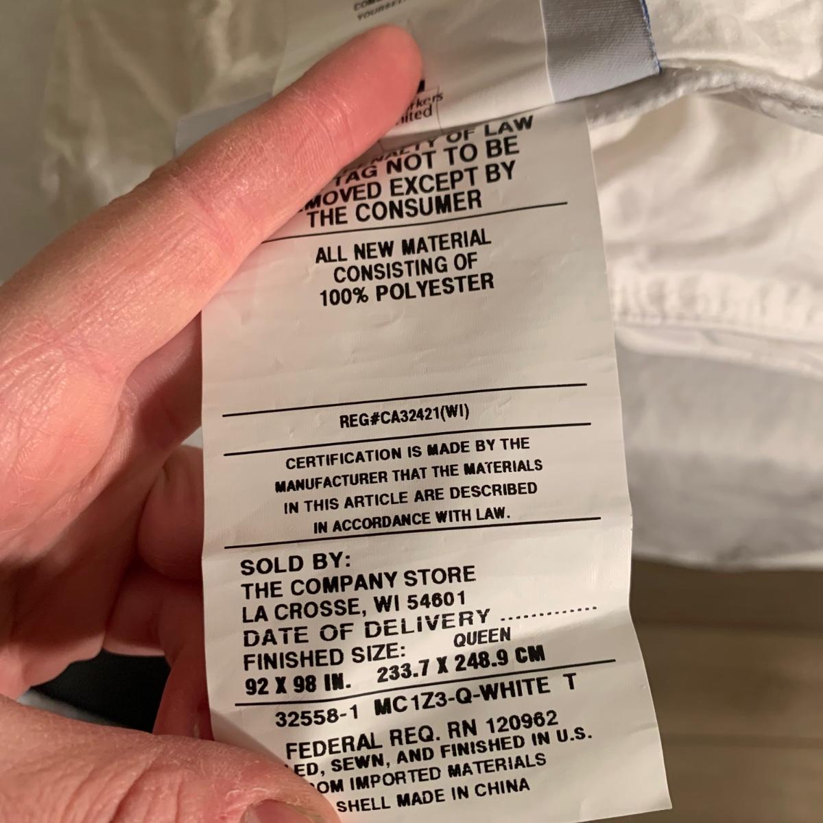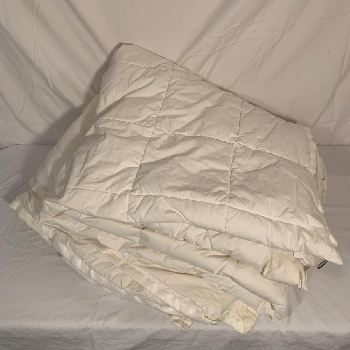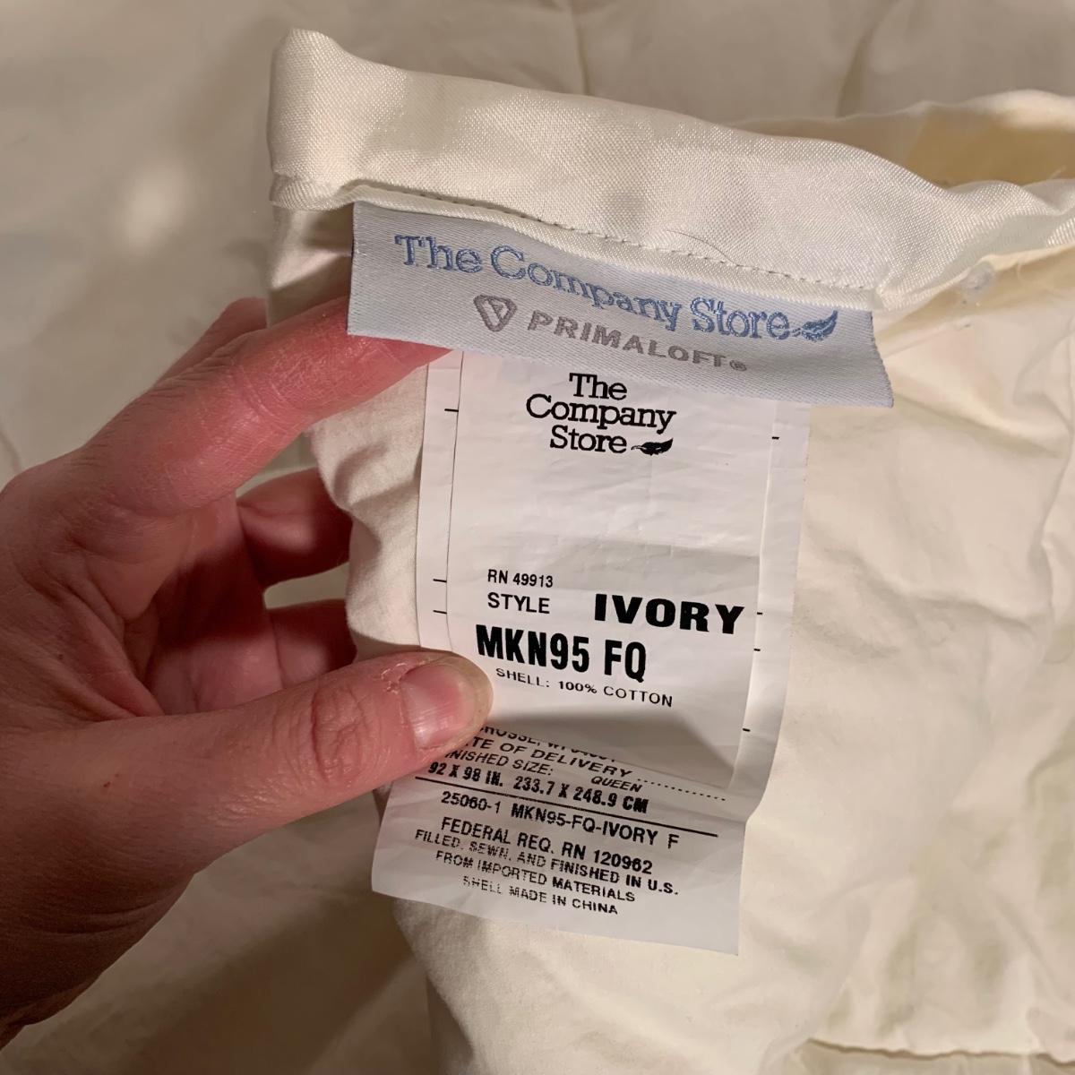 Set of two Queen size PrimaLoft alternative down duvets/comforters from The Company Store. One comes in a fabric storage bag. One is white and one is ivory. The white one has corner loops. The ivory has sateen edges.