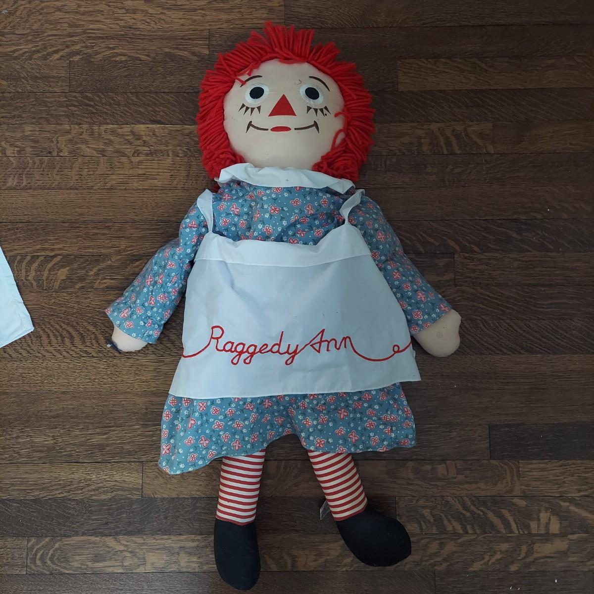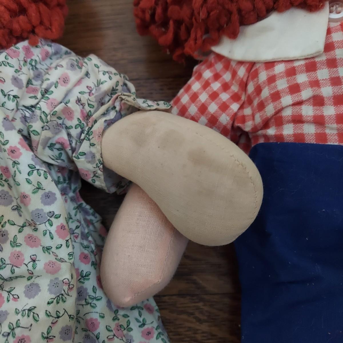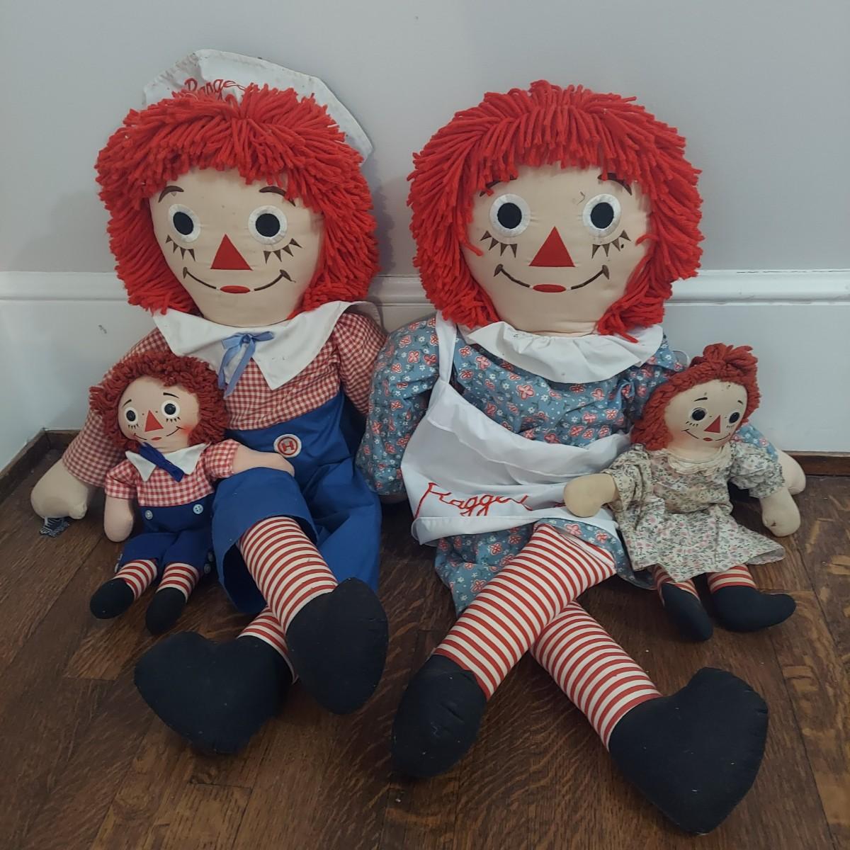 Two pairs of cloth rag dolls. The large Raggedy Ann and Andy measure approximately 33” long. The small pair is 15” long. Overall stains and wear. Please see photos for details. Shipping available