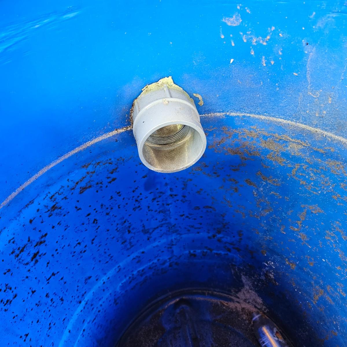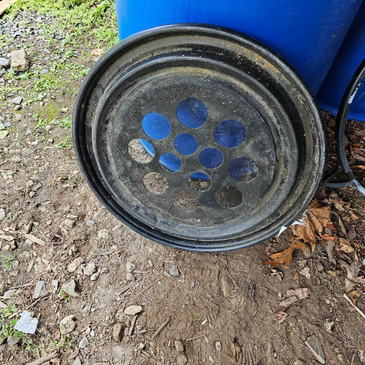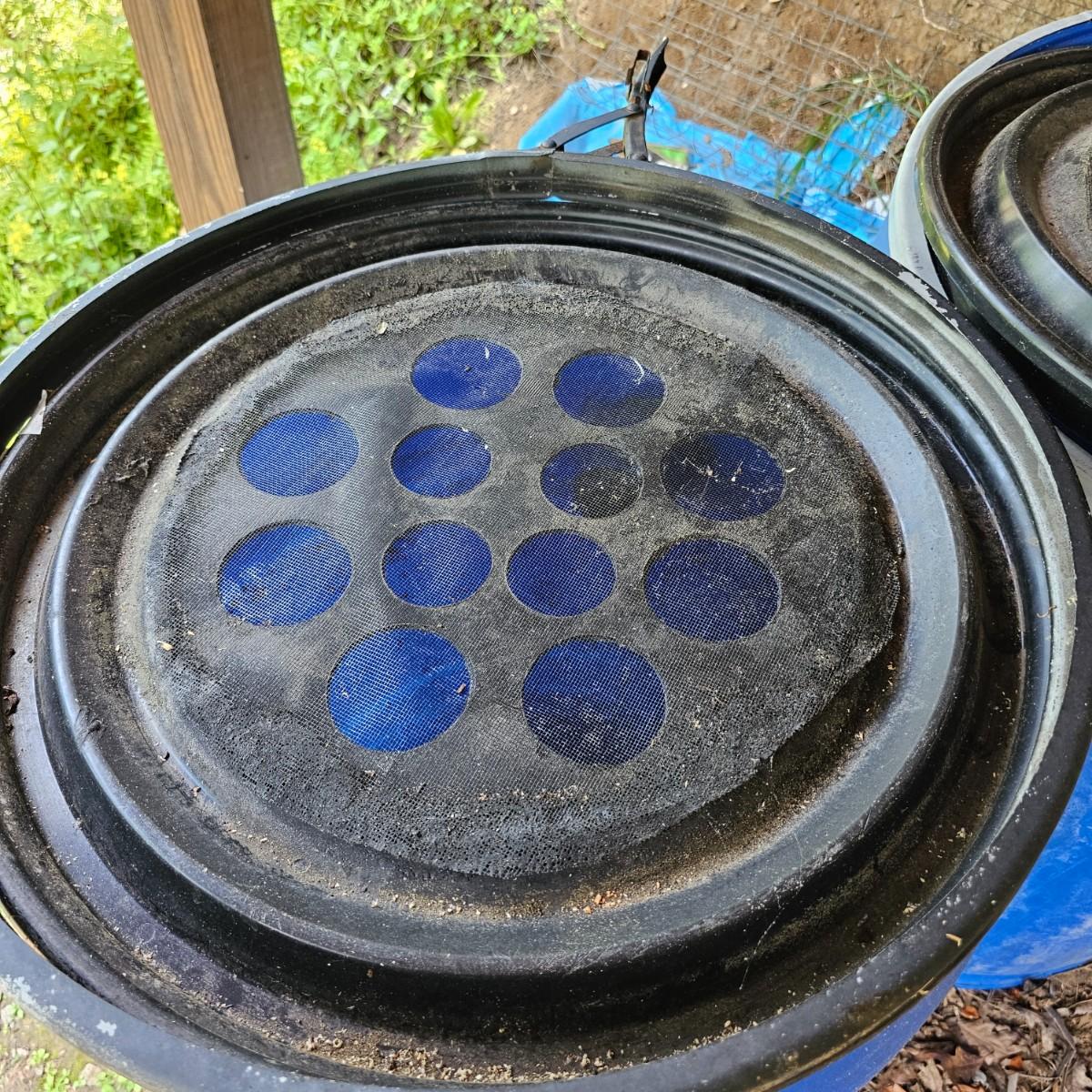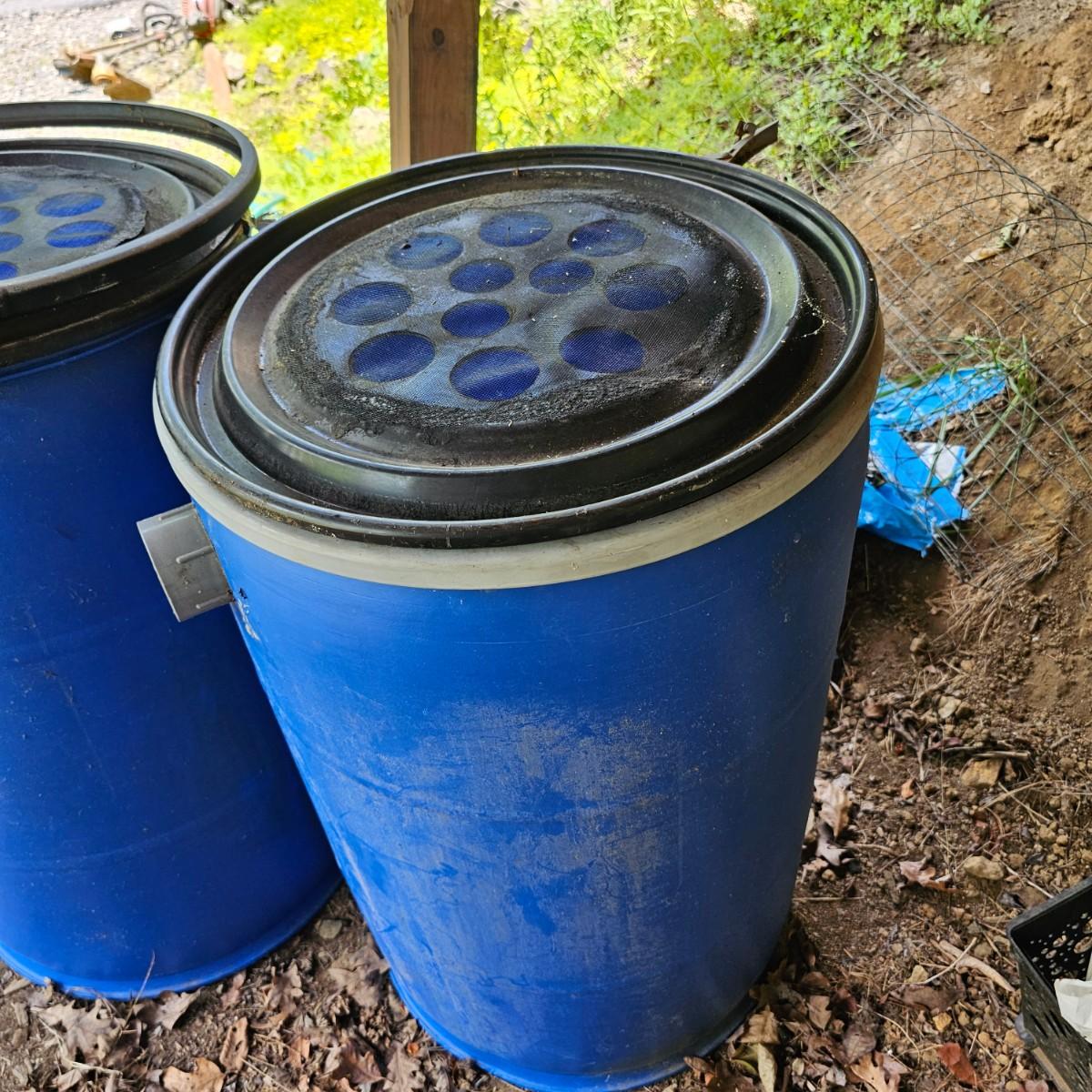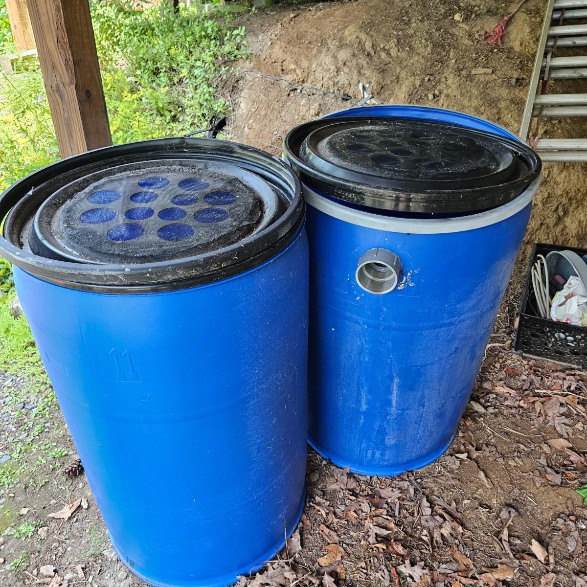 Two plastic 55 gallon drum rain barrels with screen top lids. Three inch input pipe at top and standard hose output spigot at bottom. Barrels measure 24" x 36"H. See photos for details. Local pickup only.