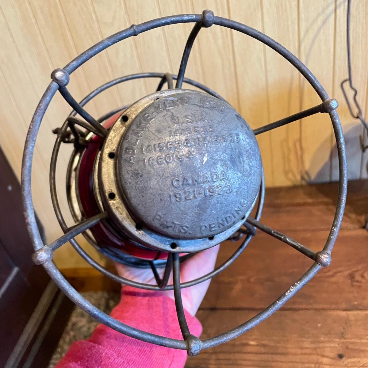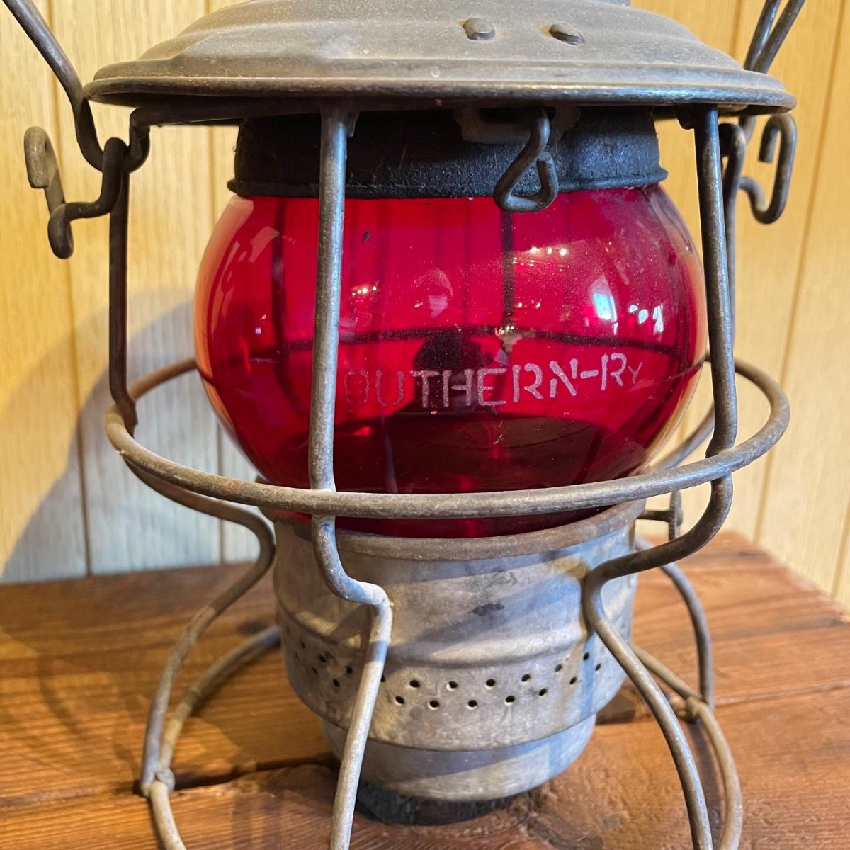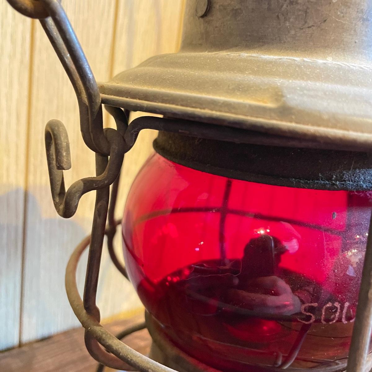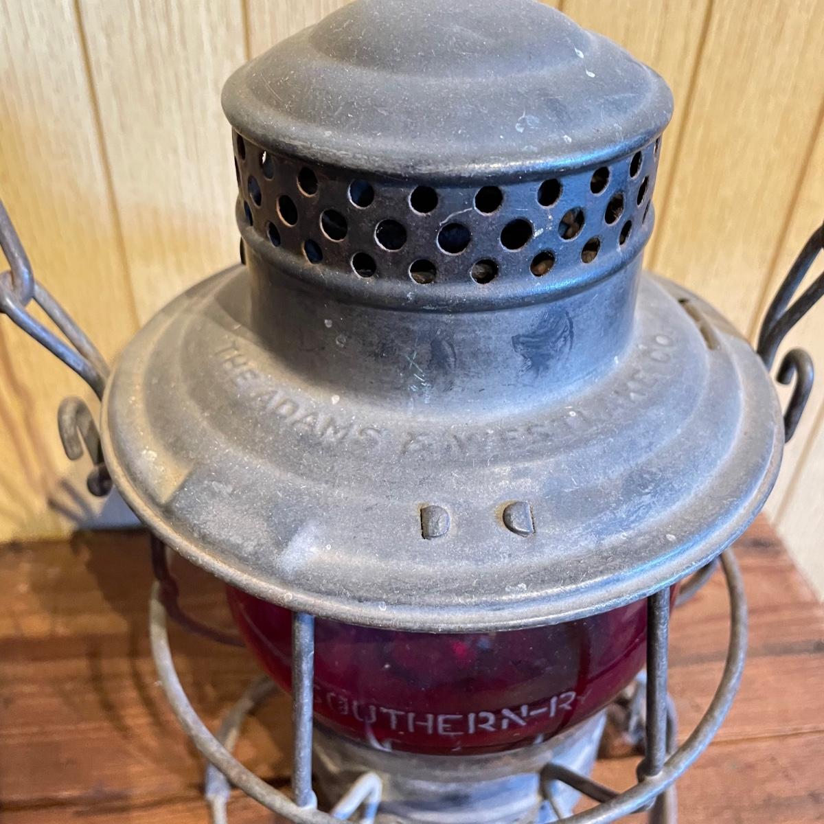 Two red globe lanterns by Adams & Westlake. Both lanterns are marked 1921-1923 Canada. The lantern on the right has Southern RY stamped on its globe. Both lanterns have a 6.5” diameter, the right’s handle is 16” high and the left is 14” high. See images. Shipping available.