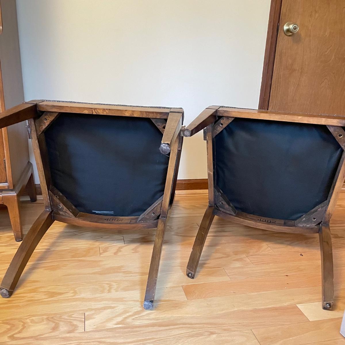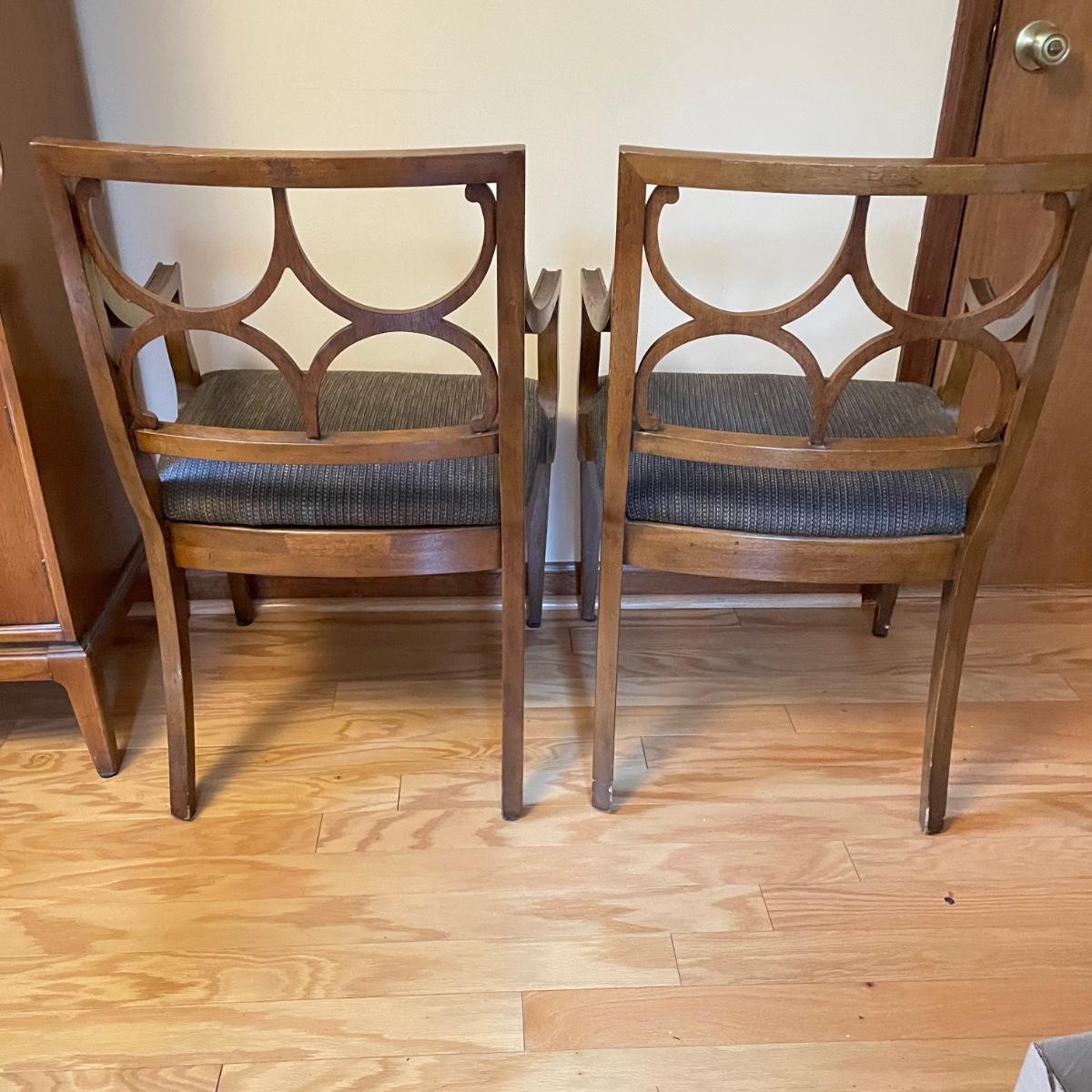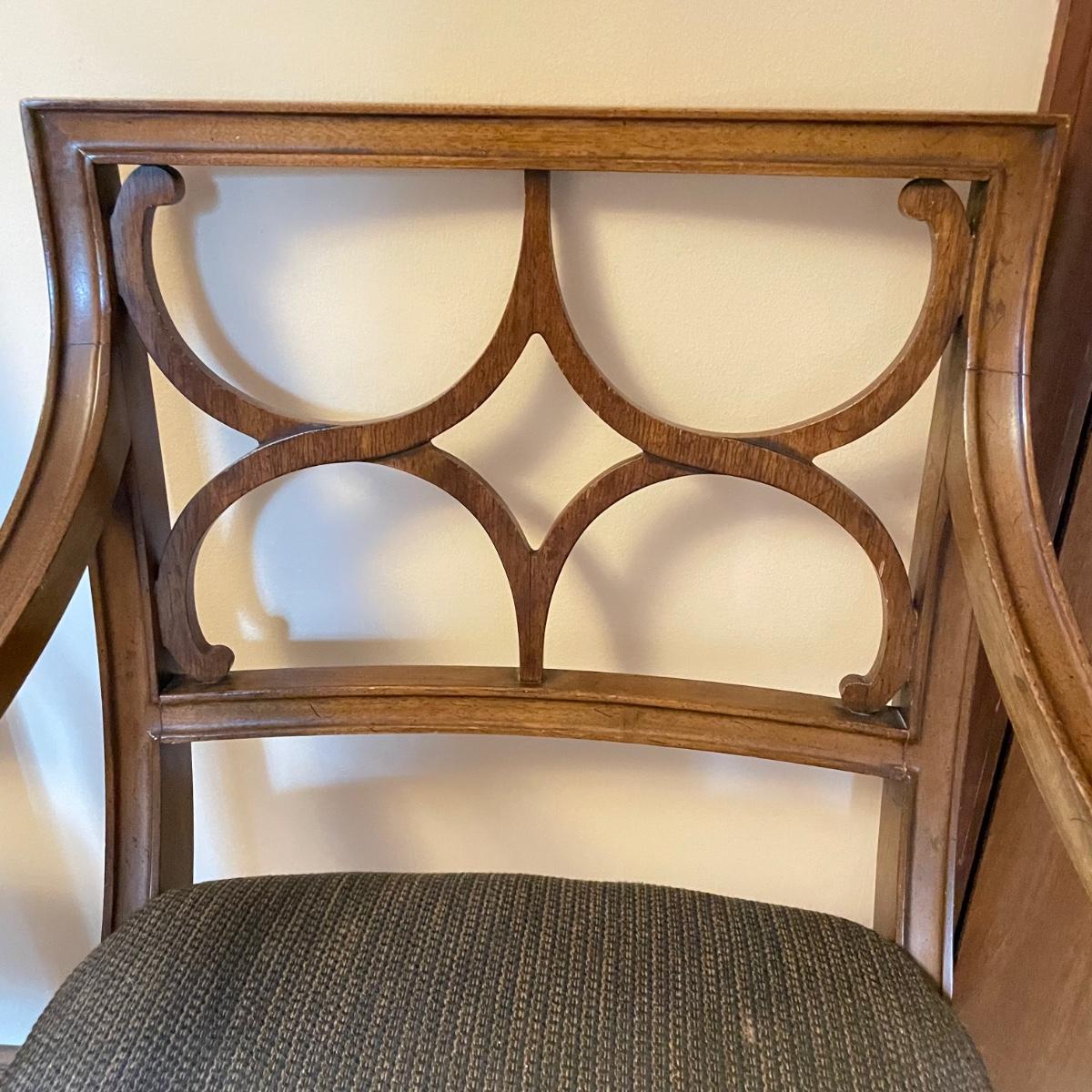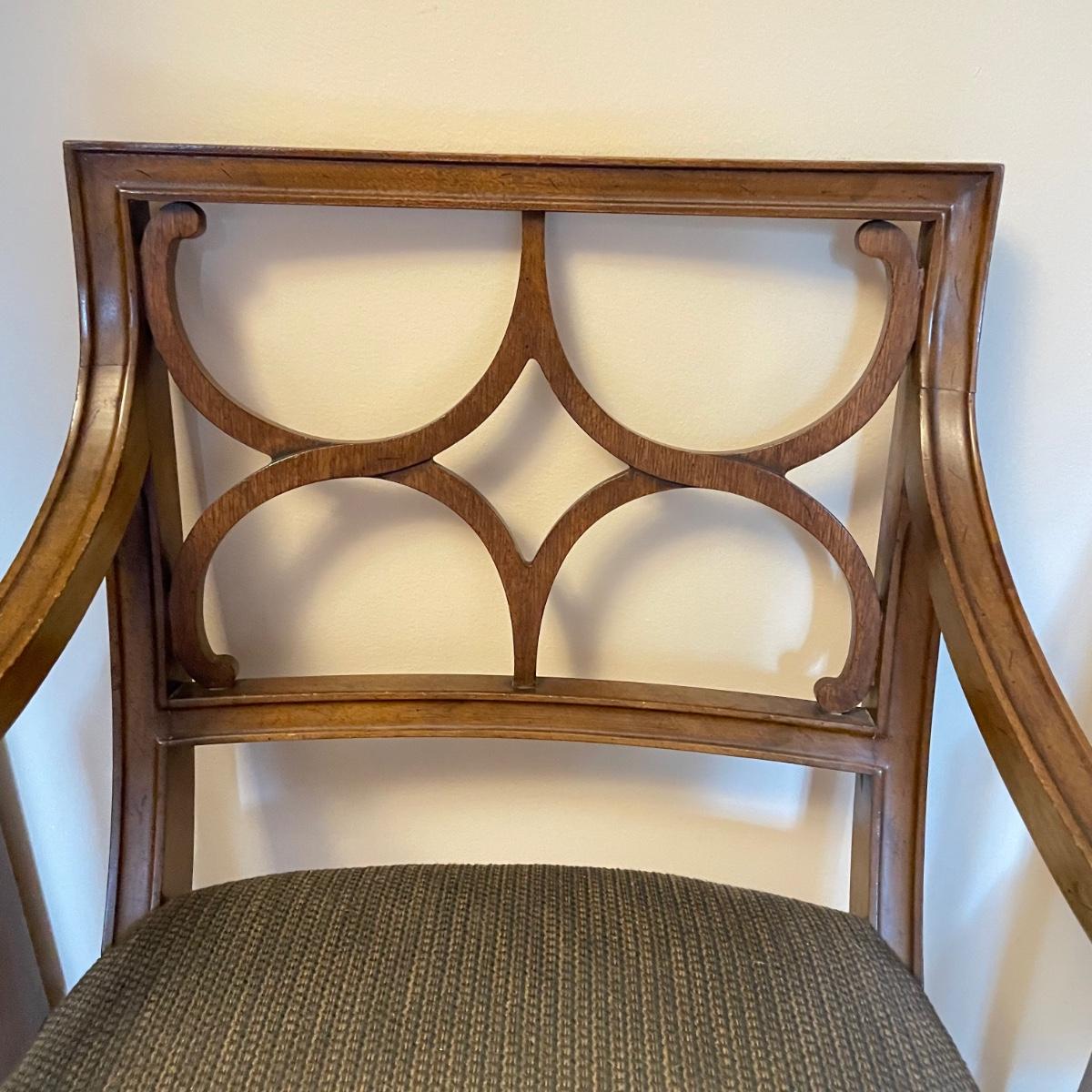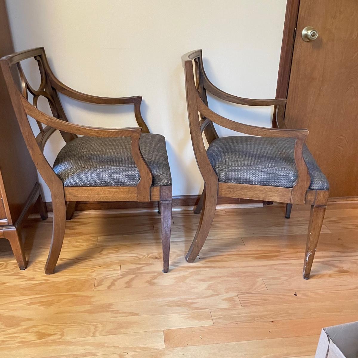 Two Regency style chairs with upholstered seats. Chairs show very little wear, known wear is noted in photos. Chairs each measure 22” x 22.5” x 34”H, with a seat height at 18”. Local pick up only.
