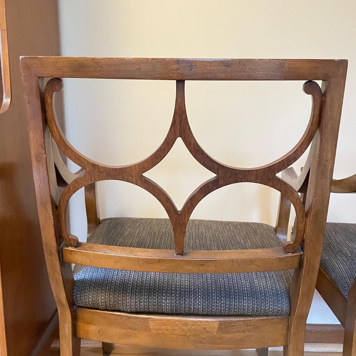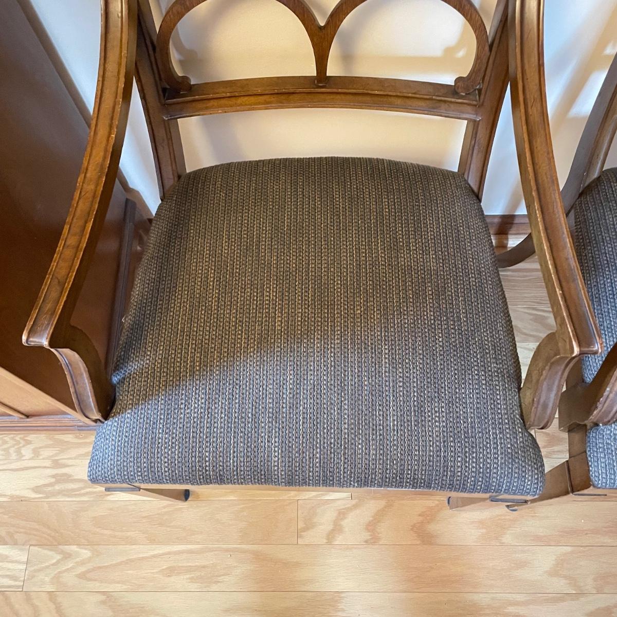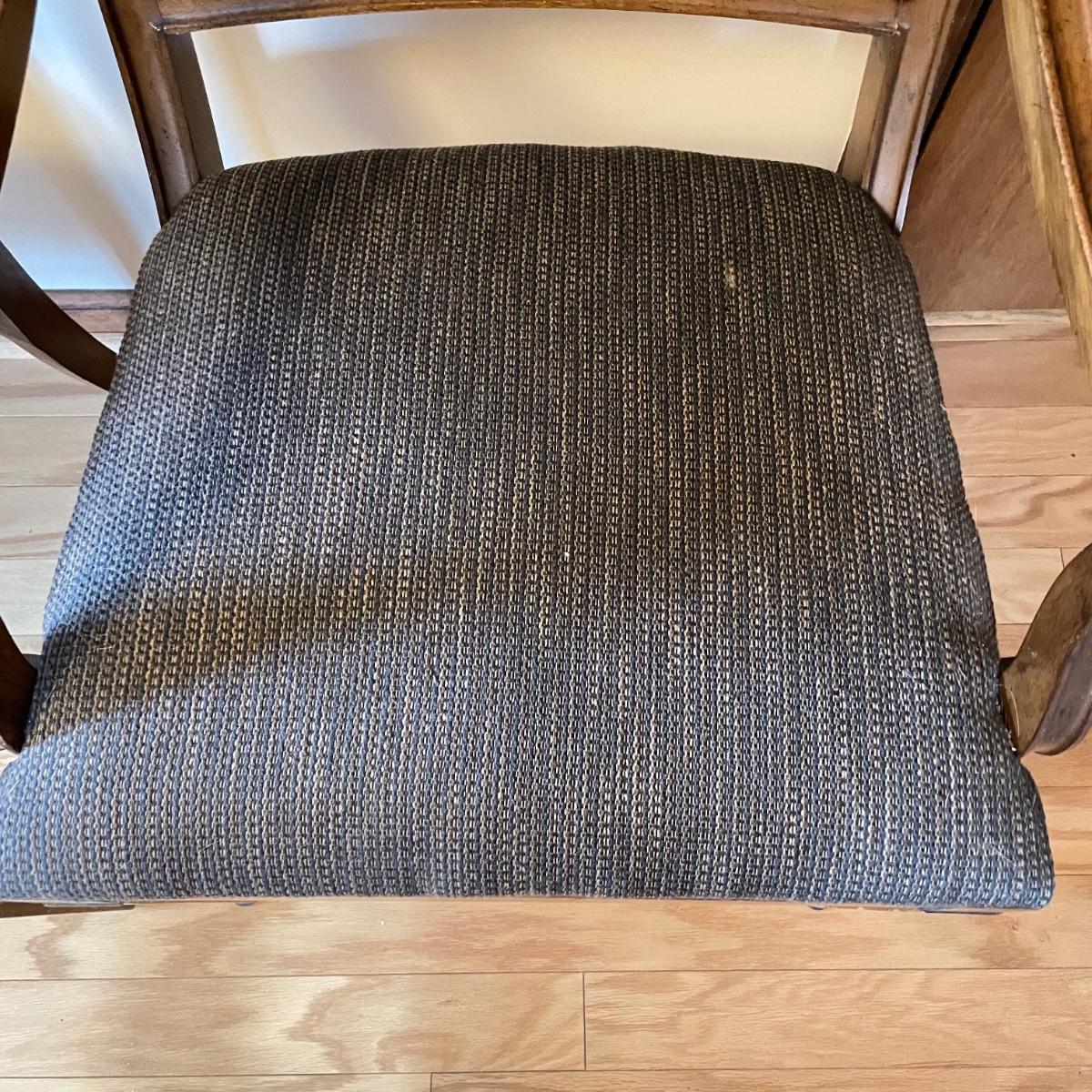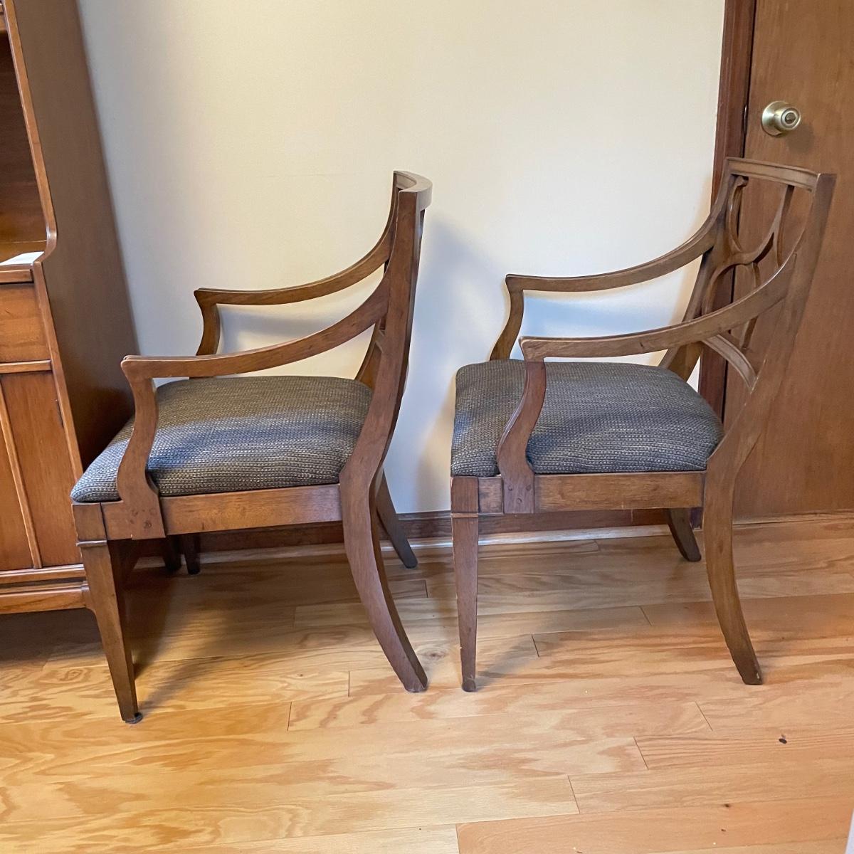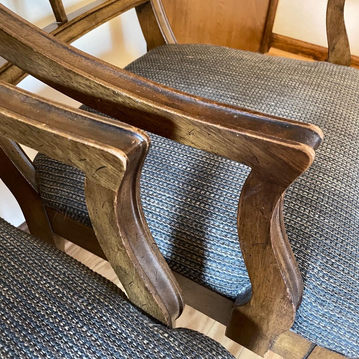 Two Regency style chairs with upholstered seats. Chairs show very little wear, known wear is noted in photos. Chairs each measure 22” x 22.5” x 34”H, with a seat height at 18”. Local pick up only.