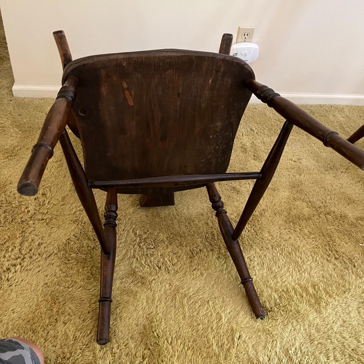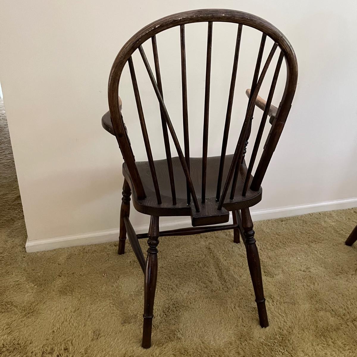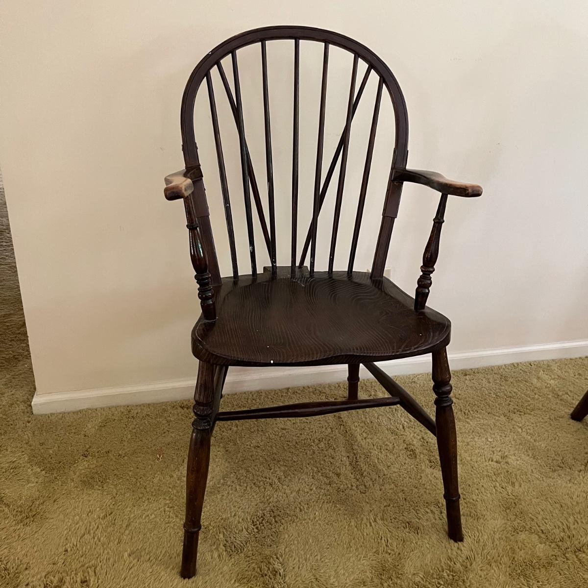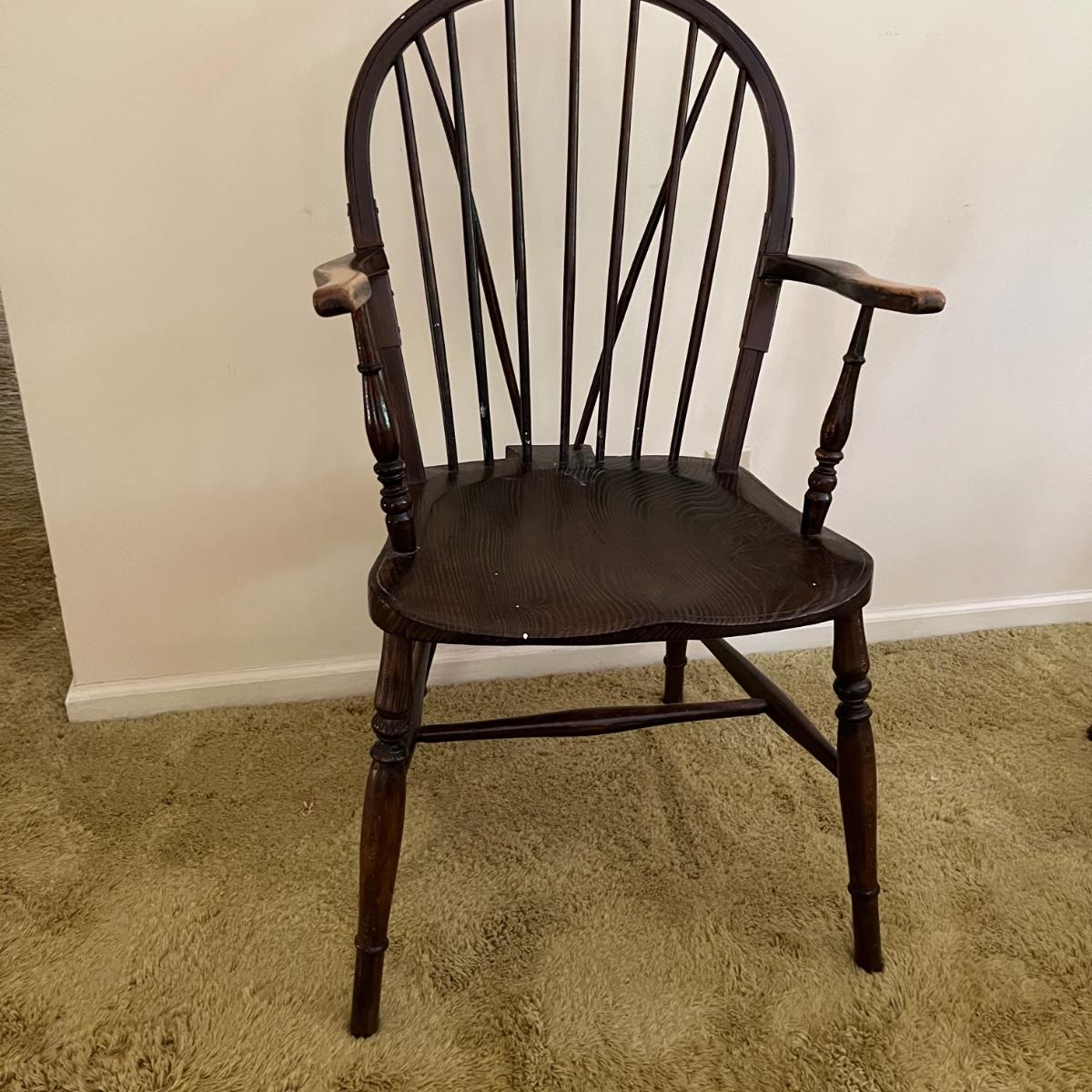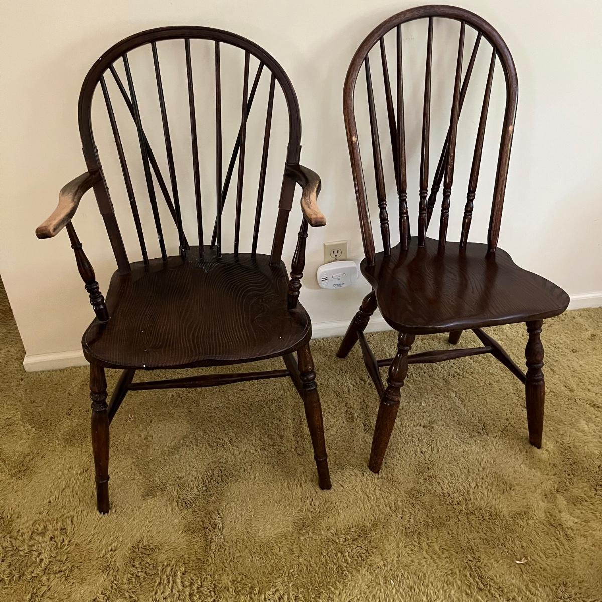 Lot contains a wooden Reproduction Windsor armchair that has a loose arm on the right and a wooden reproduction no arm Windsor chair that is not very sturdy. Armchair measures 21” x 22” x 47” with a 17.5” seat height.