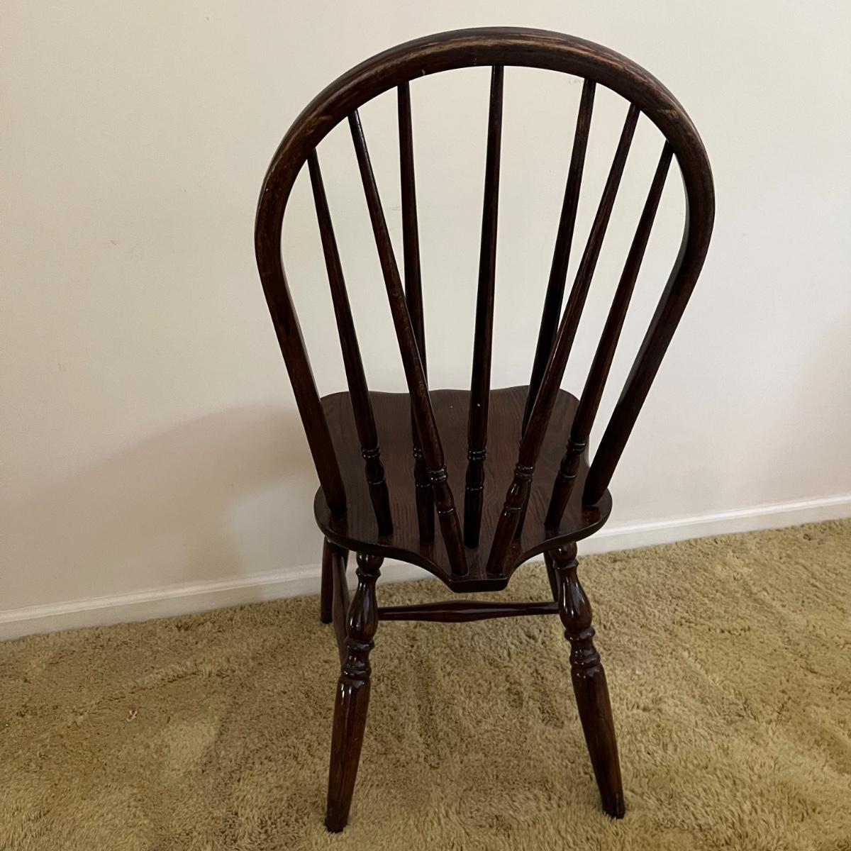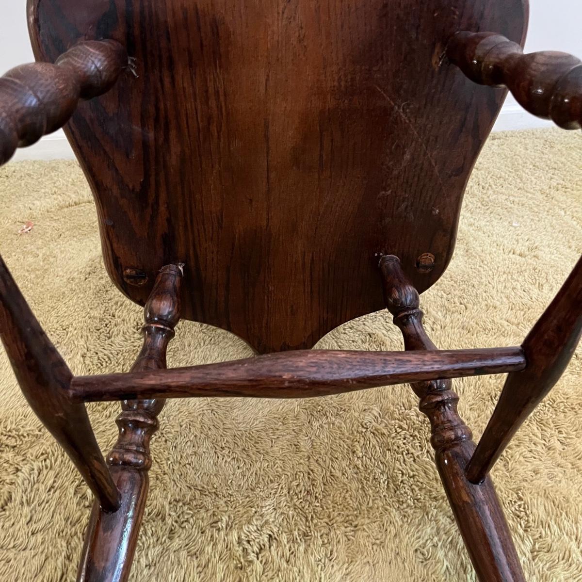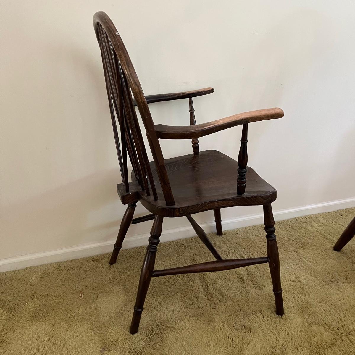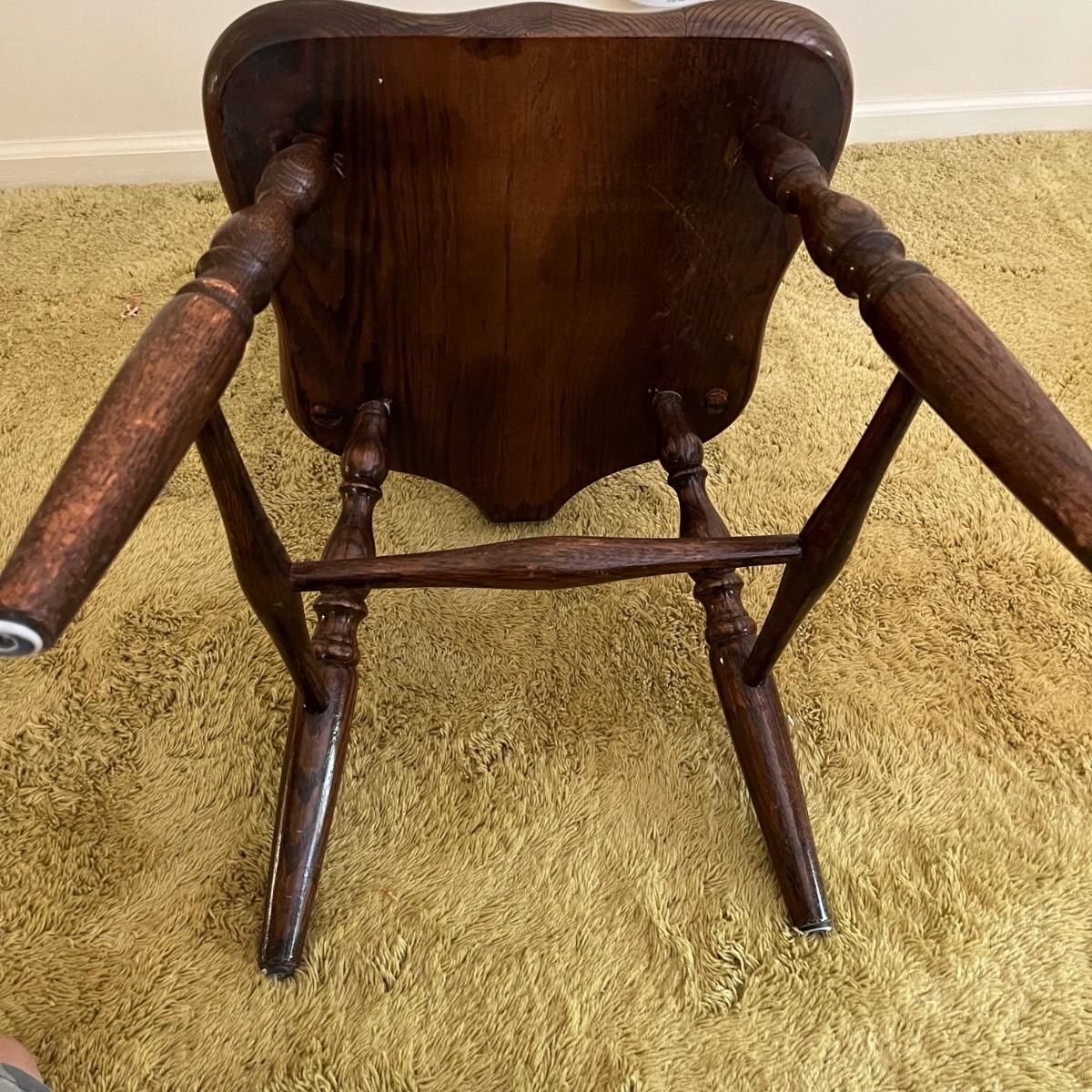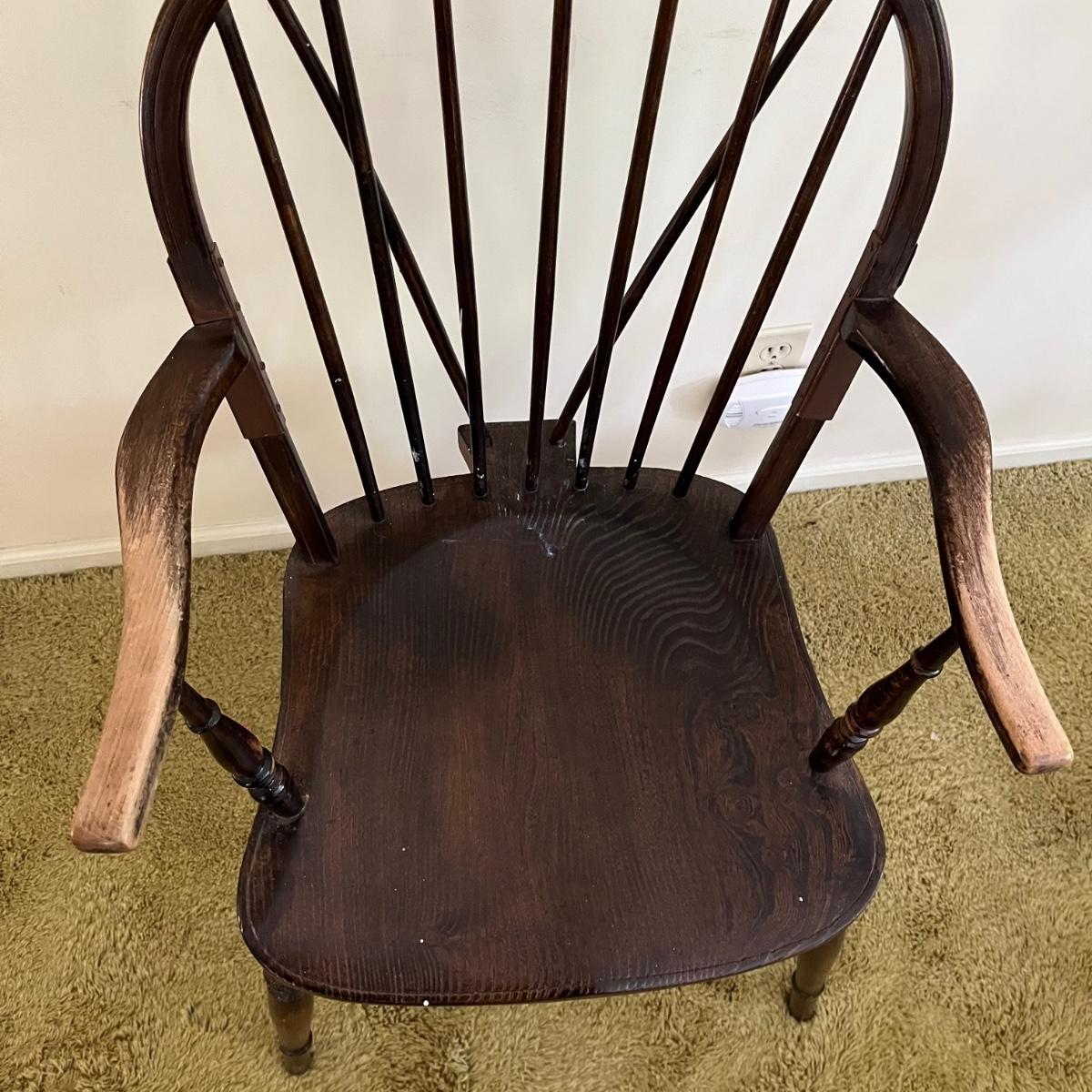 Lot contains a wooden Reproduction Windsor armchair that has a loose arm on the right and a wooden reproduction no arm Windsor chair that is not very sturdy. Armchair measures 21” x 22” x 47” with a 17.5” seat height.