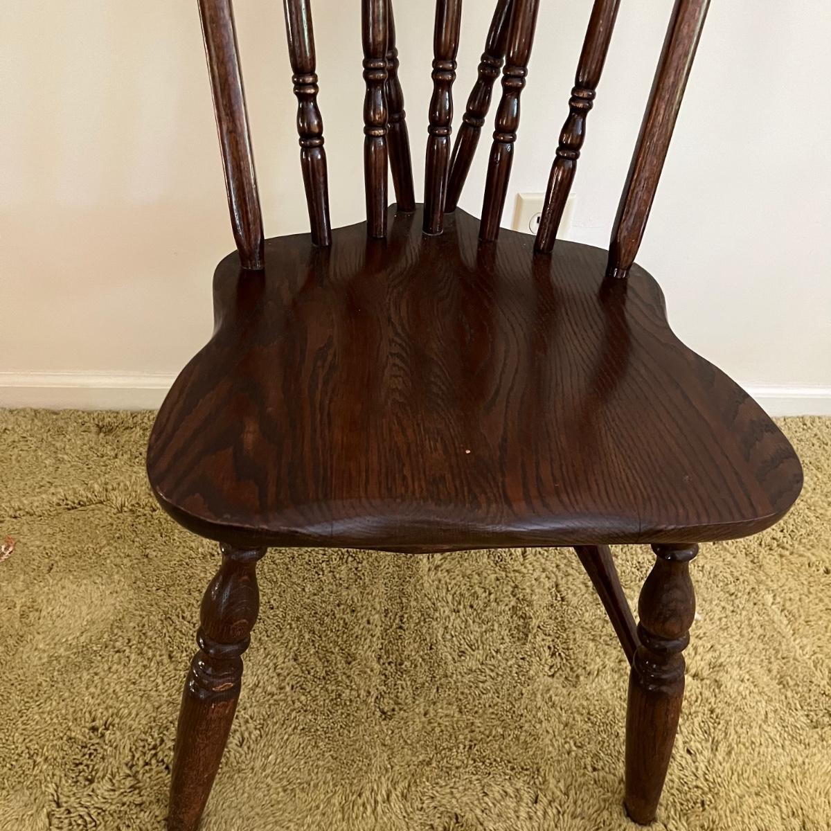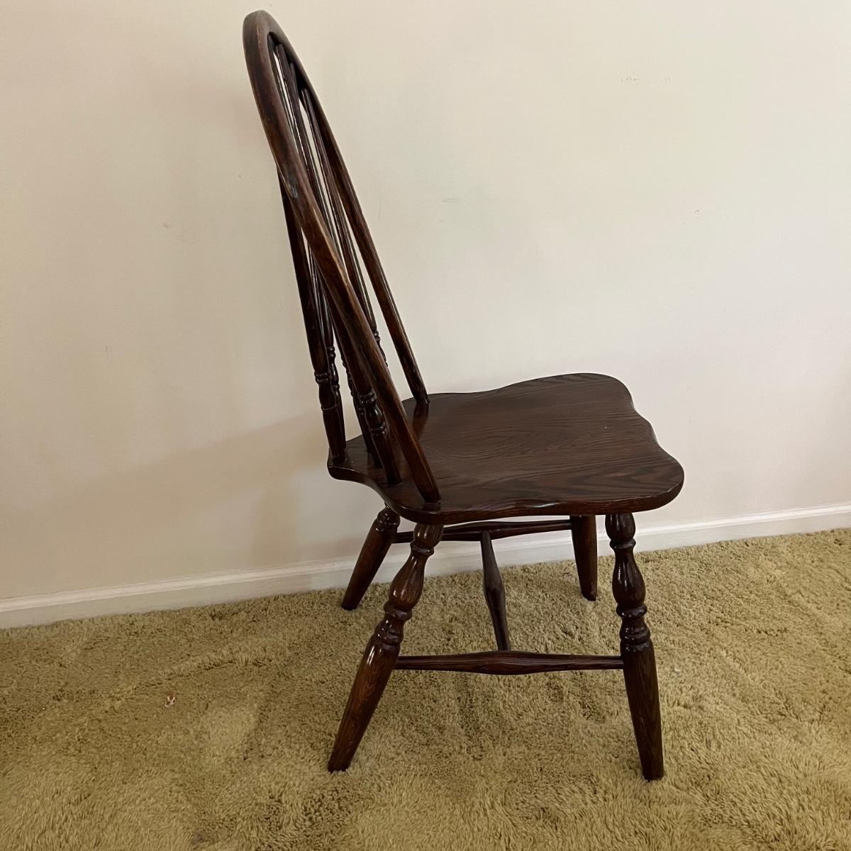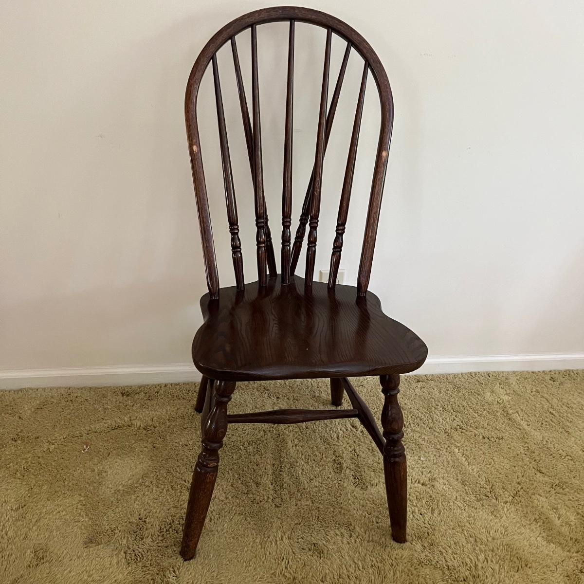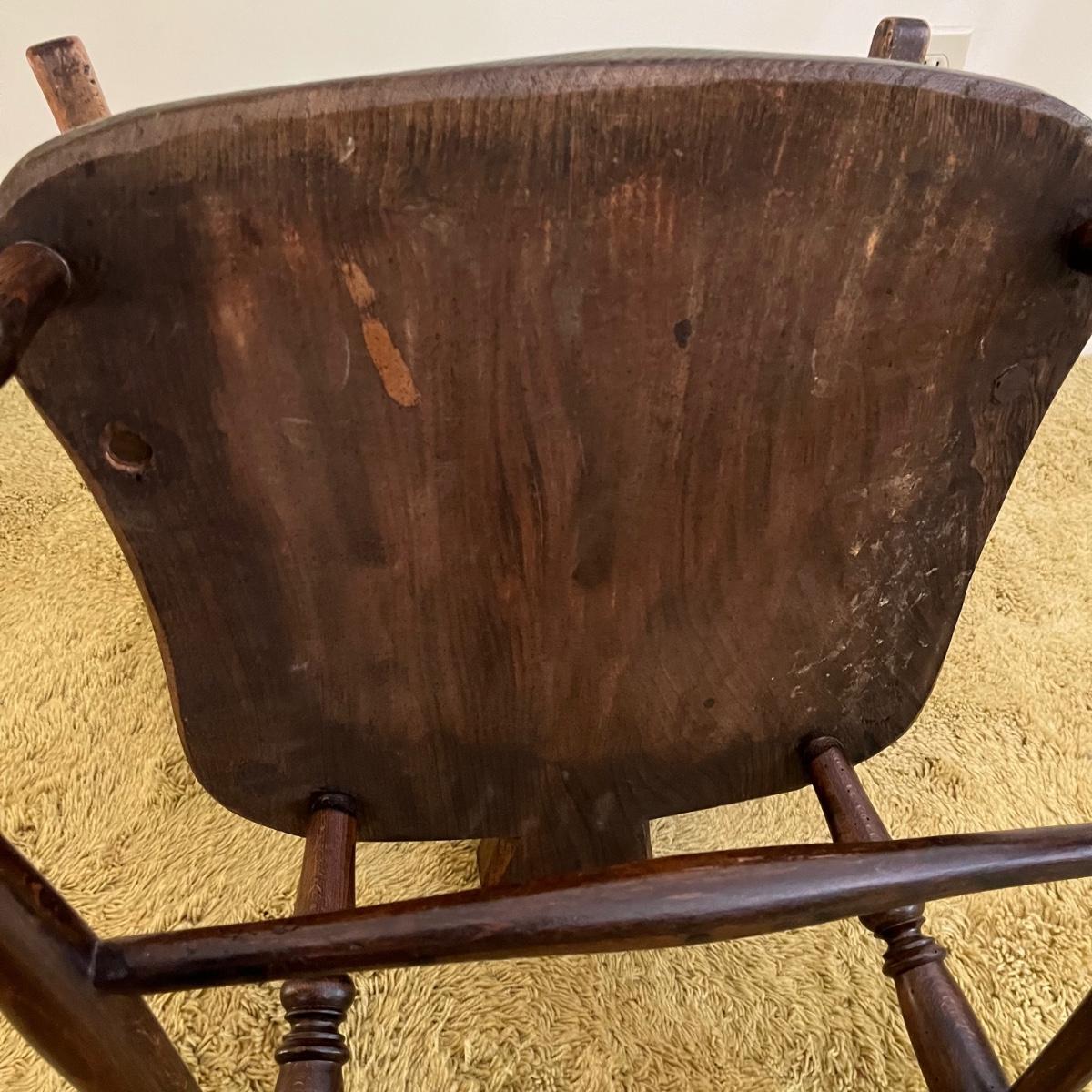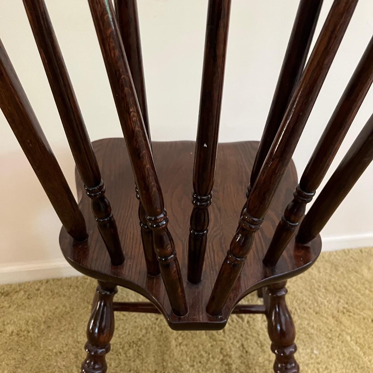 Lot contains a wooden Reproduction Windsor armchair that has a loose arm on the right and a wooden reproduction no arm Windsor chair that is not very sturdy. Armchair measures 21” x 22” x 47” with a 17.5” seat height.