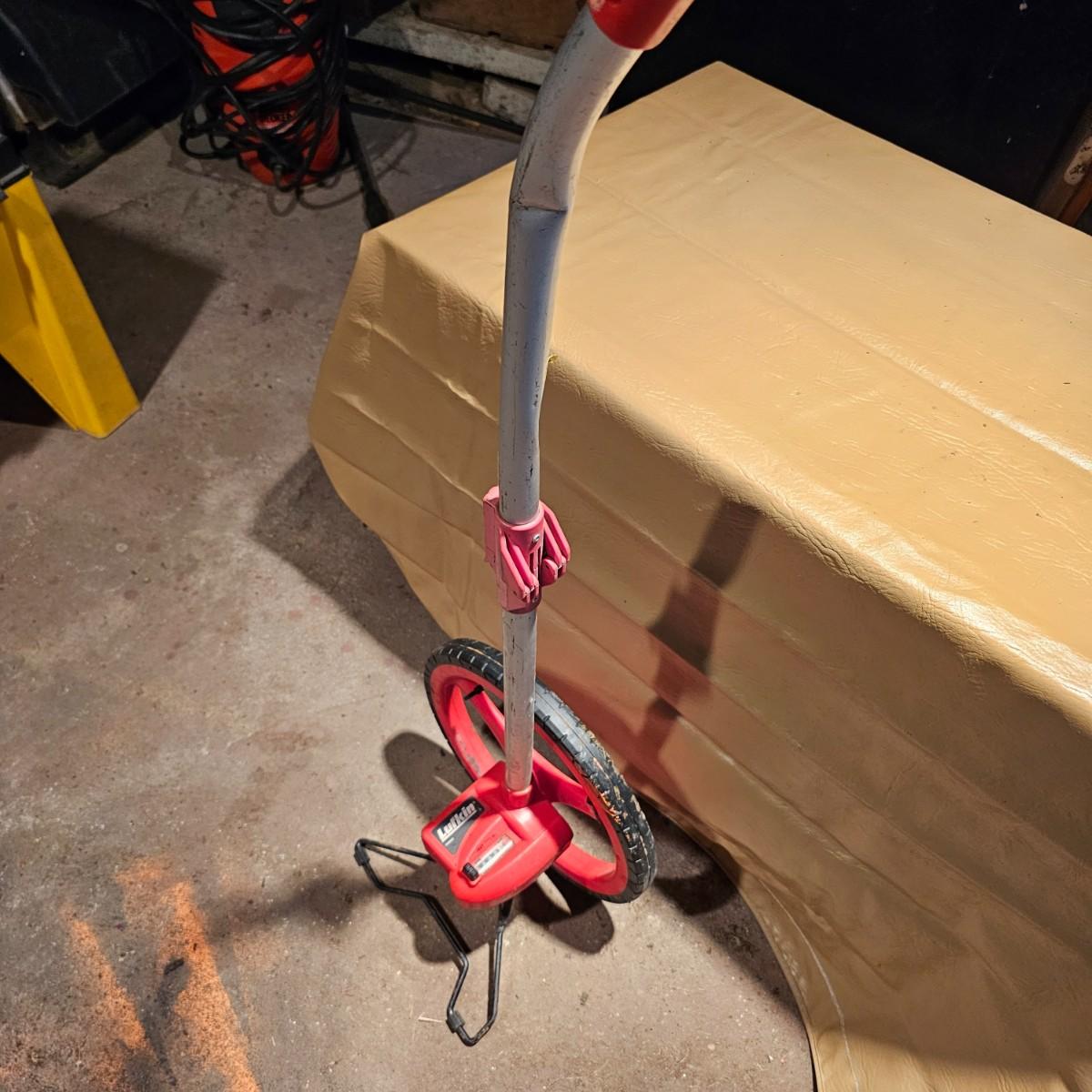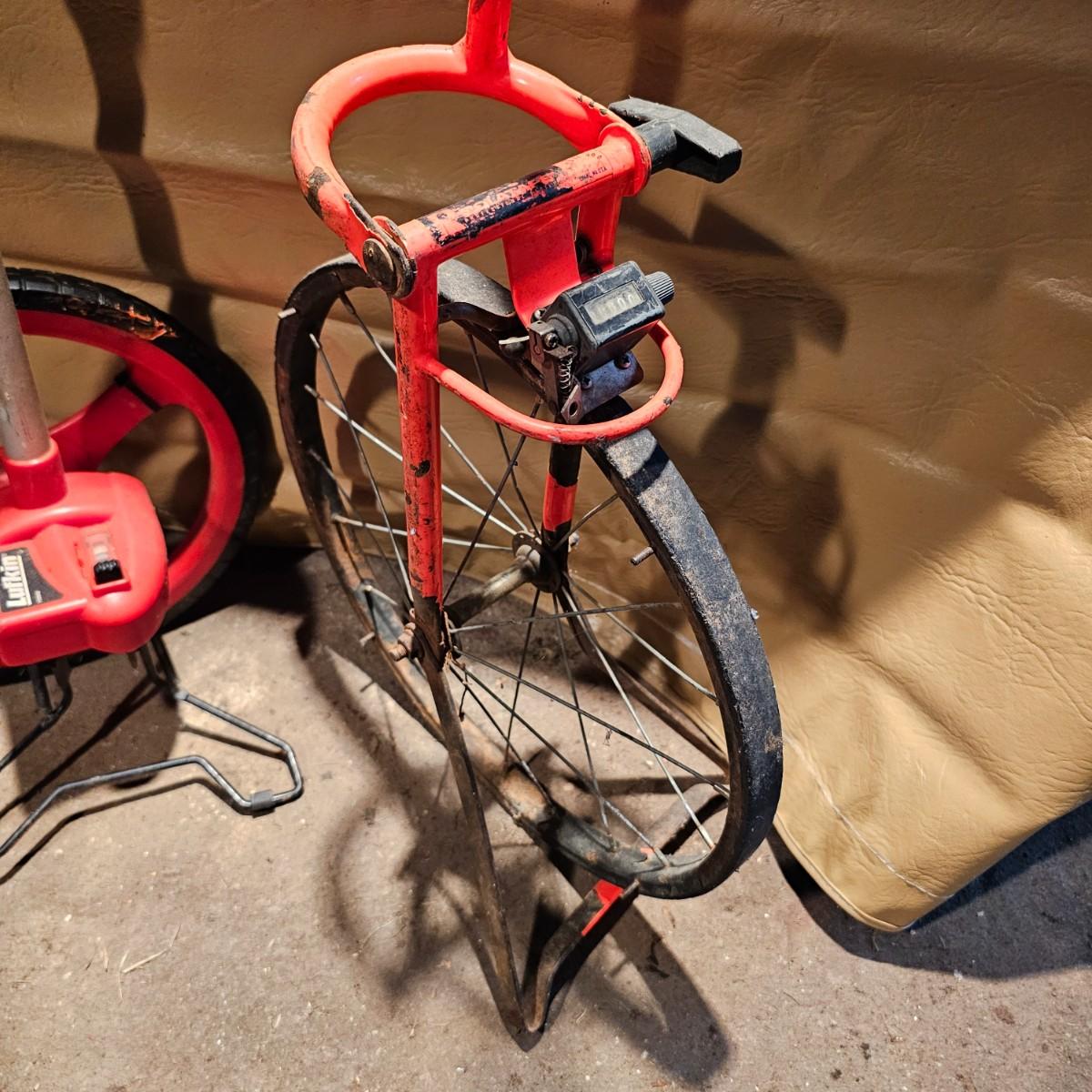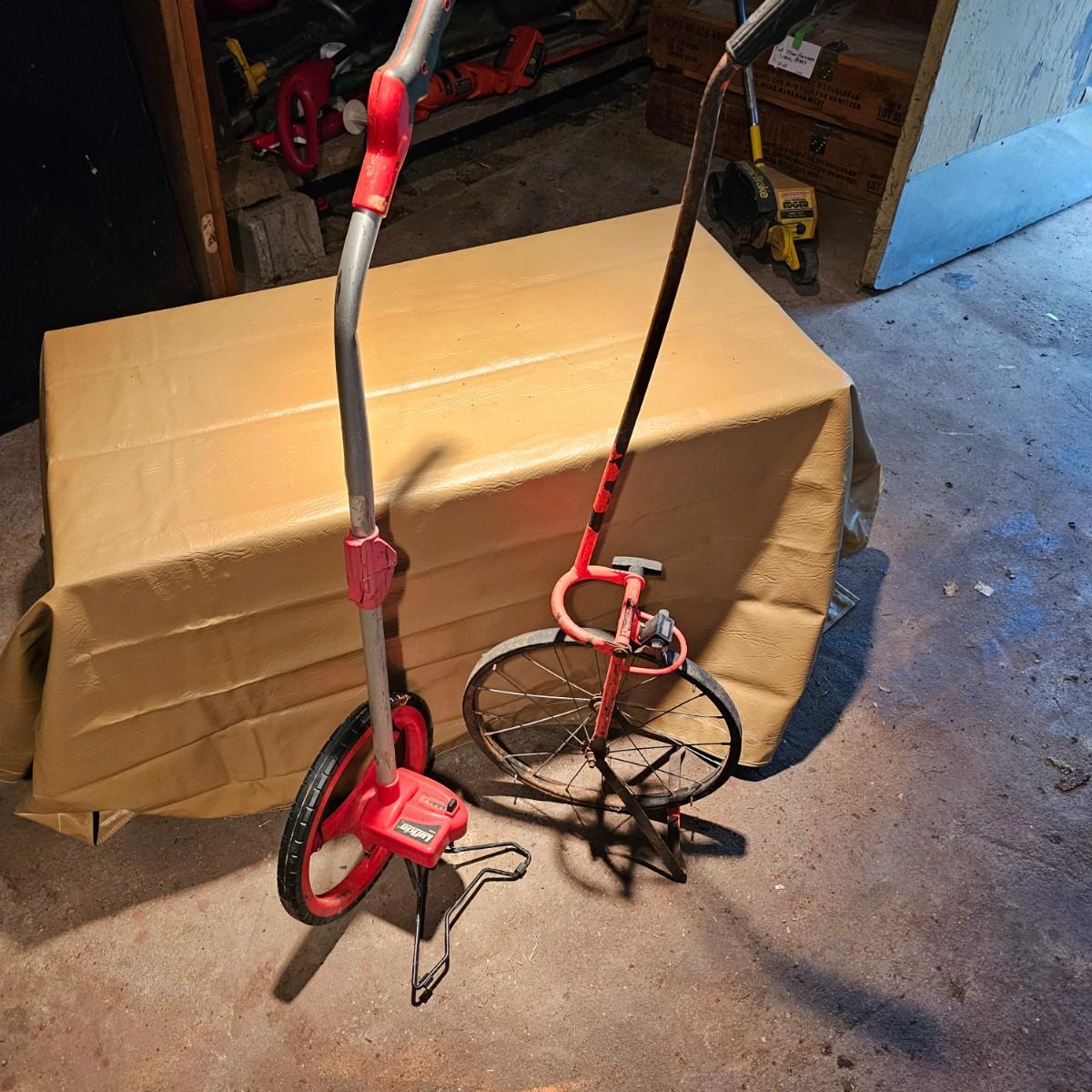 One Lufkin and one Rolatape walking style measuring wheels. Distances show in windows as you walk along, can be reset for next job. Largest item is 25" x 9" x 45"H. See photos for details. Local pickup only.