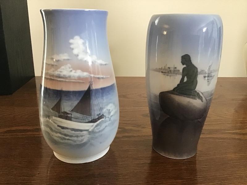 One vase has a ship and the other has a statue figurine. Pretty and in good condition. 7” High.