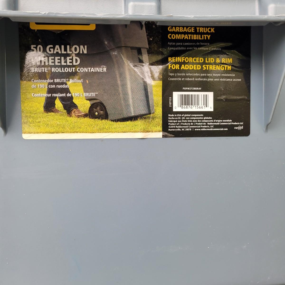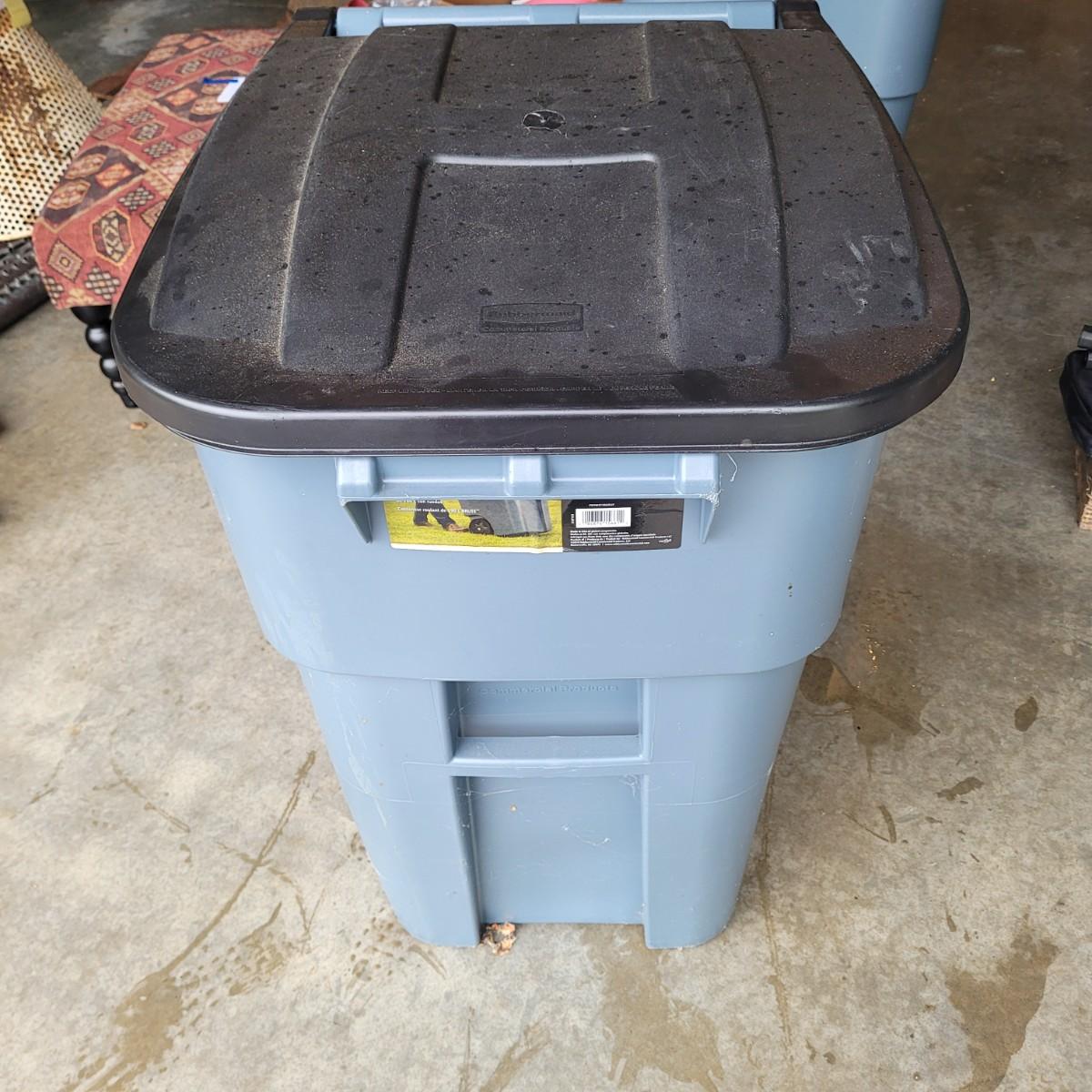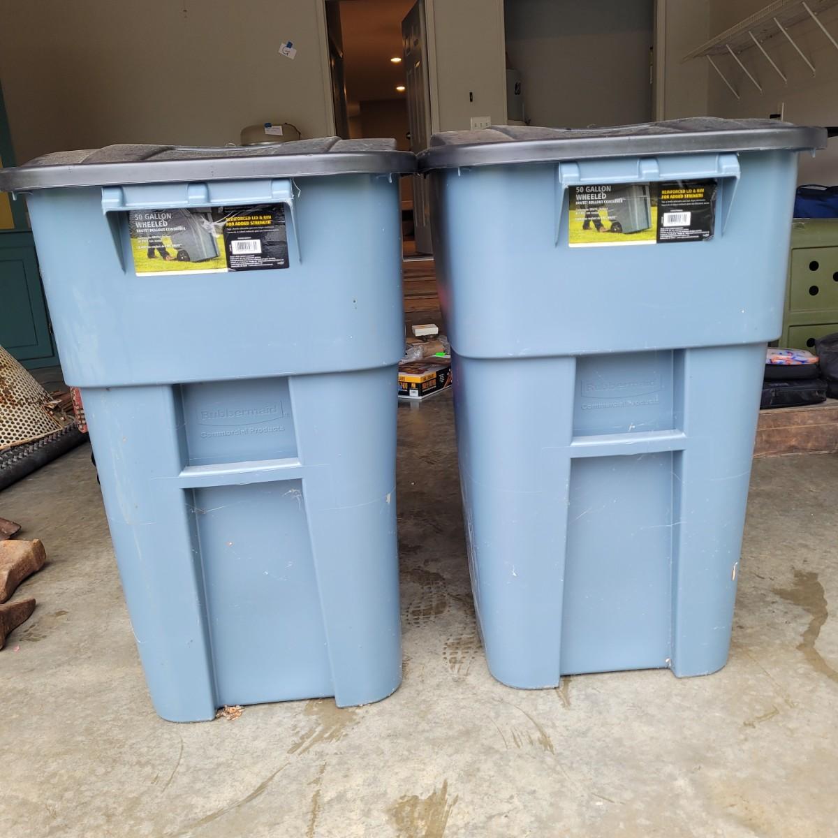 This lot includes two identical Rubbermaid brand trash cans. These bins are 50-gallon wheeled rollout containers. They feature a reinforced lid and rim for extra strength and heavy-duty wheels for stability. Individually, the bins measure 24" x 29" x 36"H. These cans are used and have a normal trash can smell.