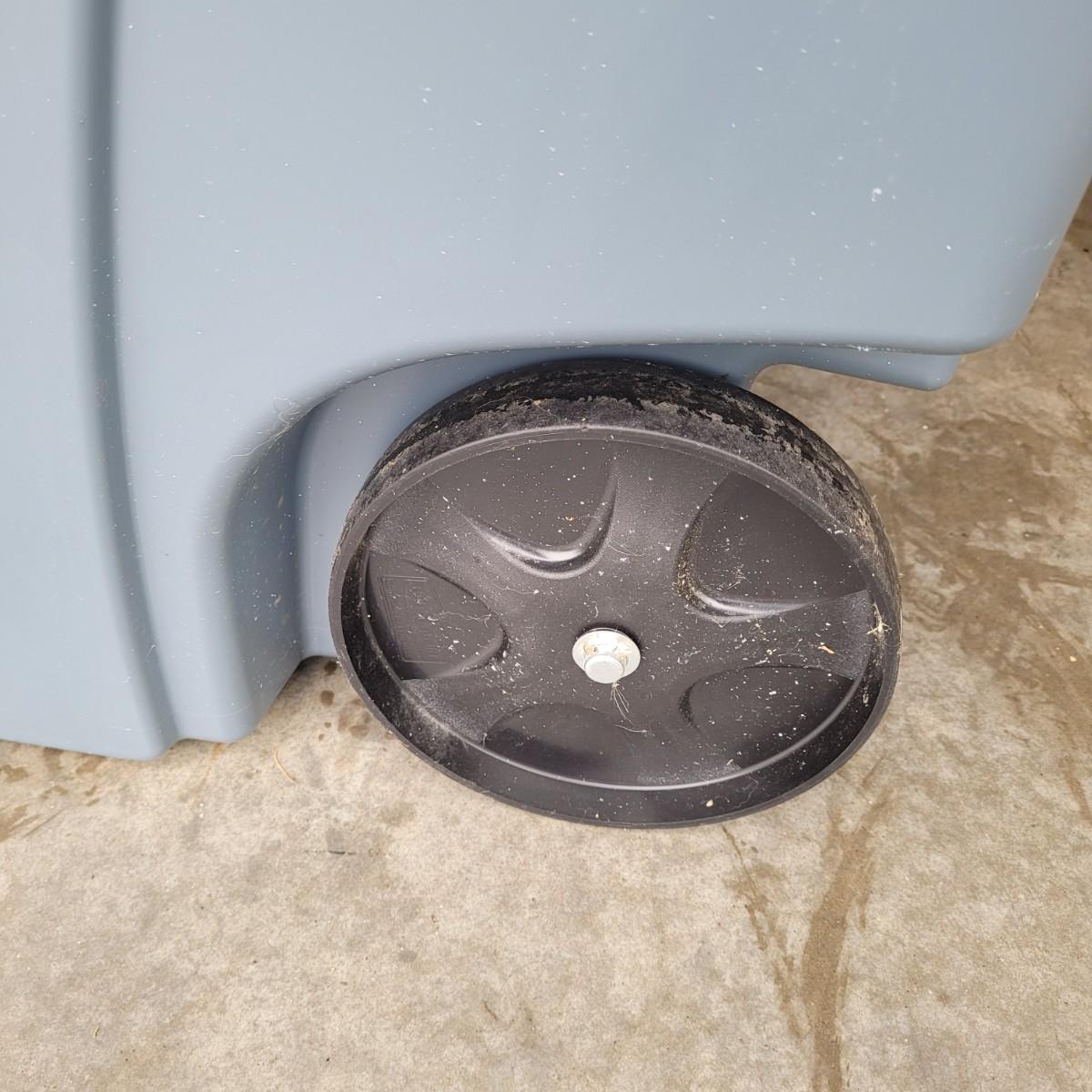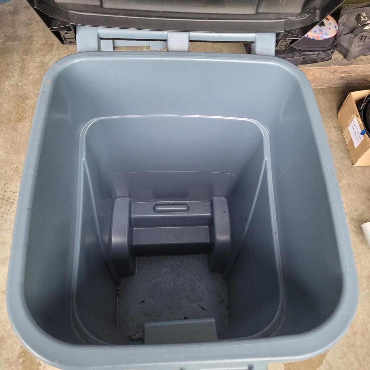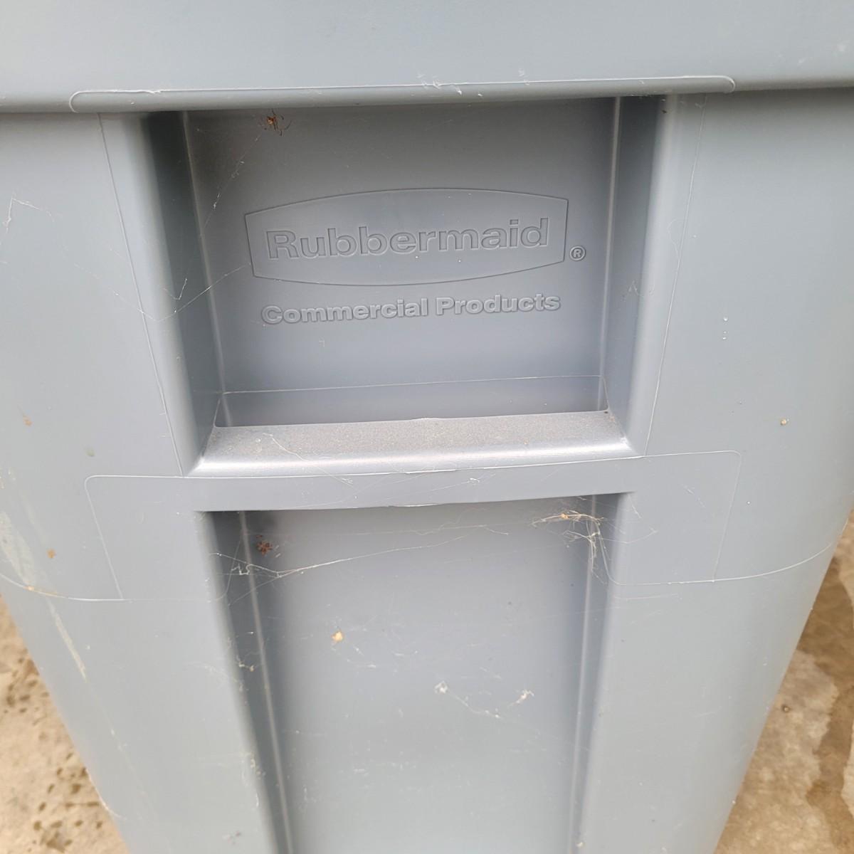 This lot includes two identical Rubbermaid brand trash cans. These bins are 50-gallon wheeled rollout containers. They feature a reinforced lid and rim for extra strength and heavy-duty wheels for stability. Individually, the bins measure 24" x 29" x 36"H. These cans are used and have a normal trash can smell.