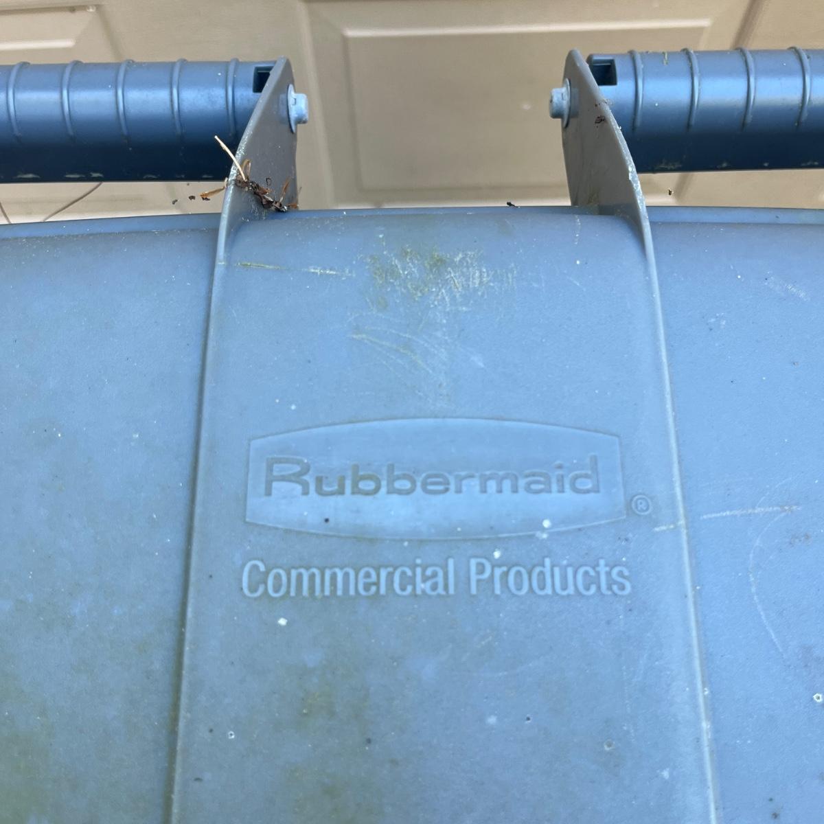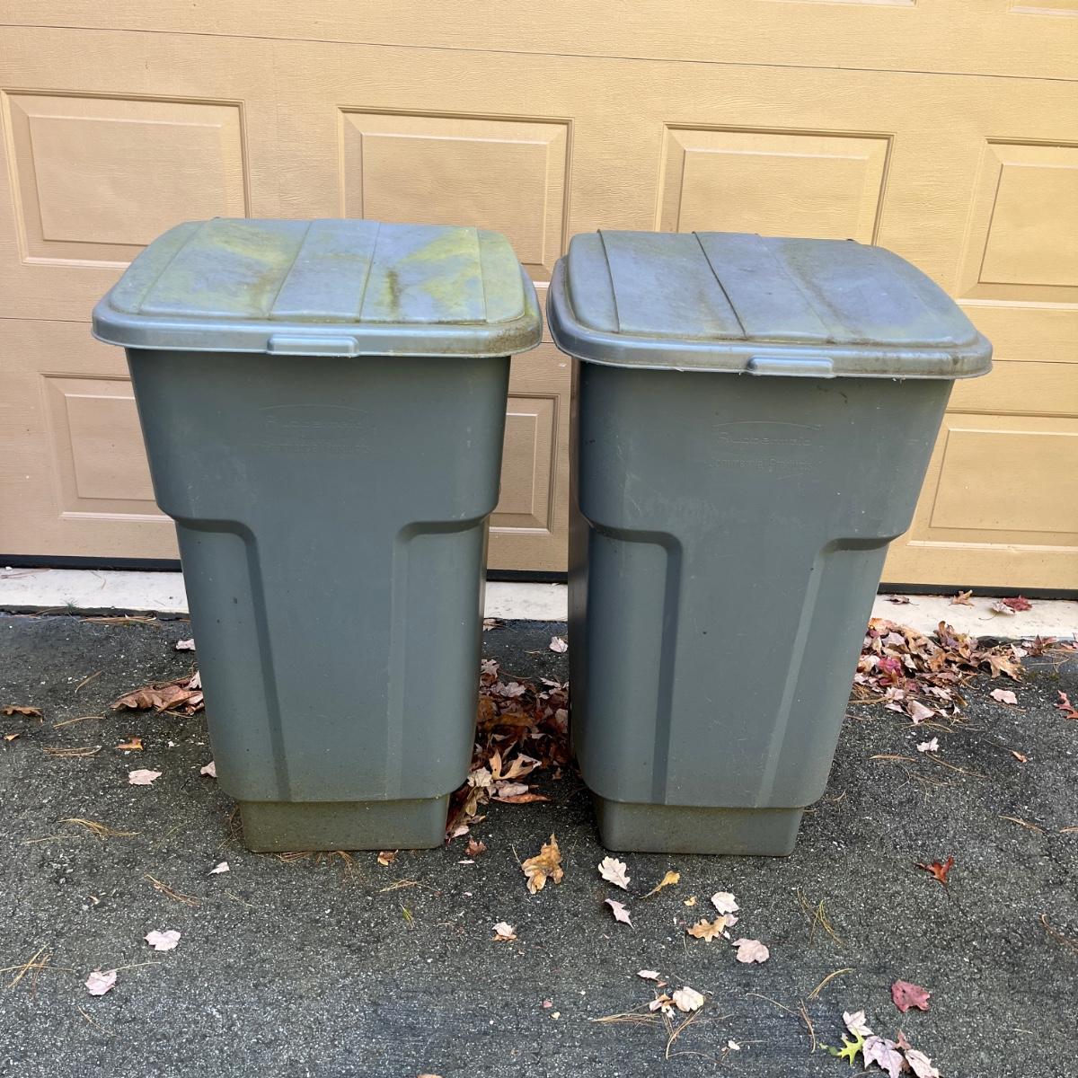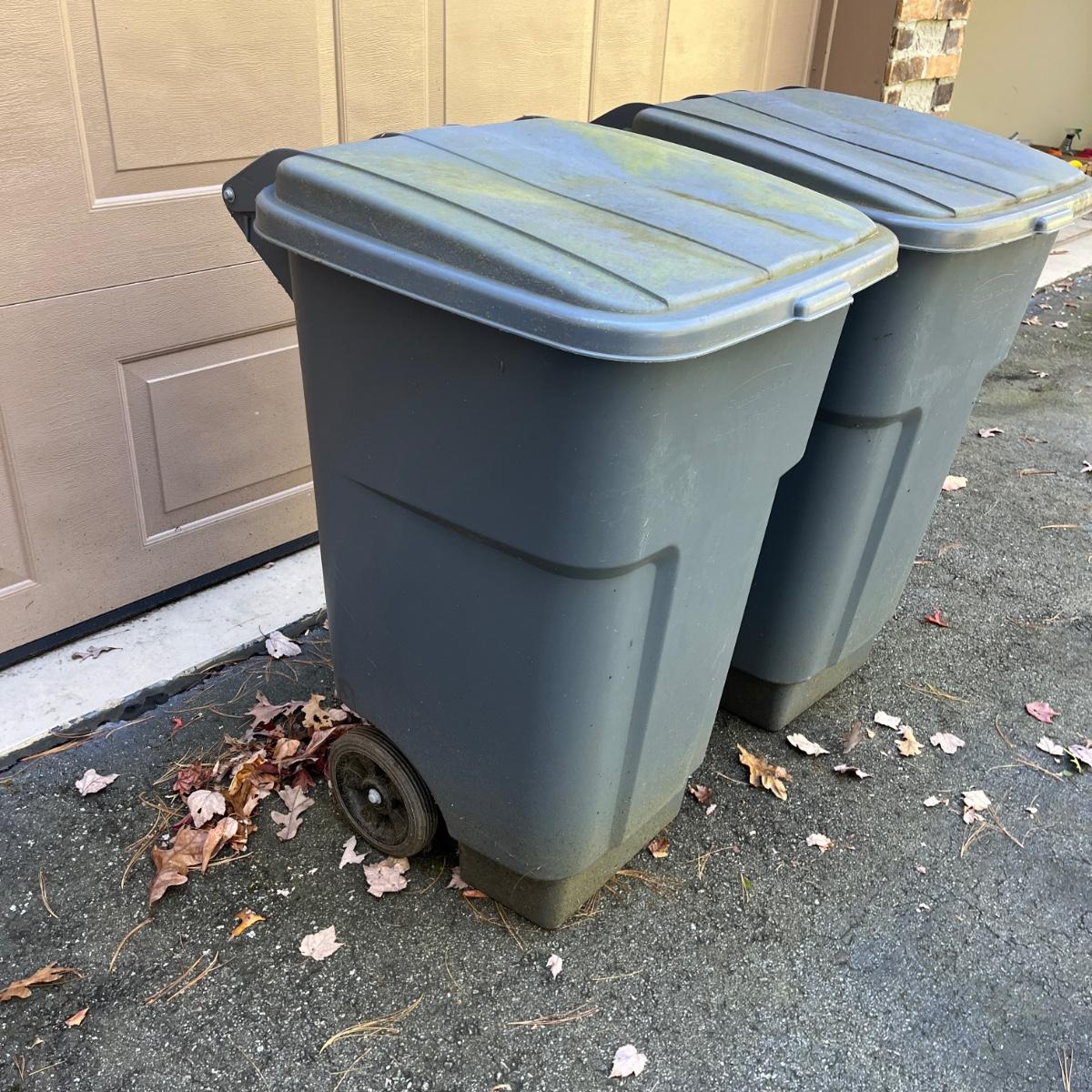 Lot includes two Rubbermaid wheeled garbage cans that measure 23” x 28” x 39”H. Cans are dirty from outdoor use.
