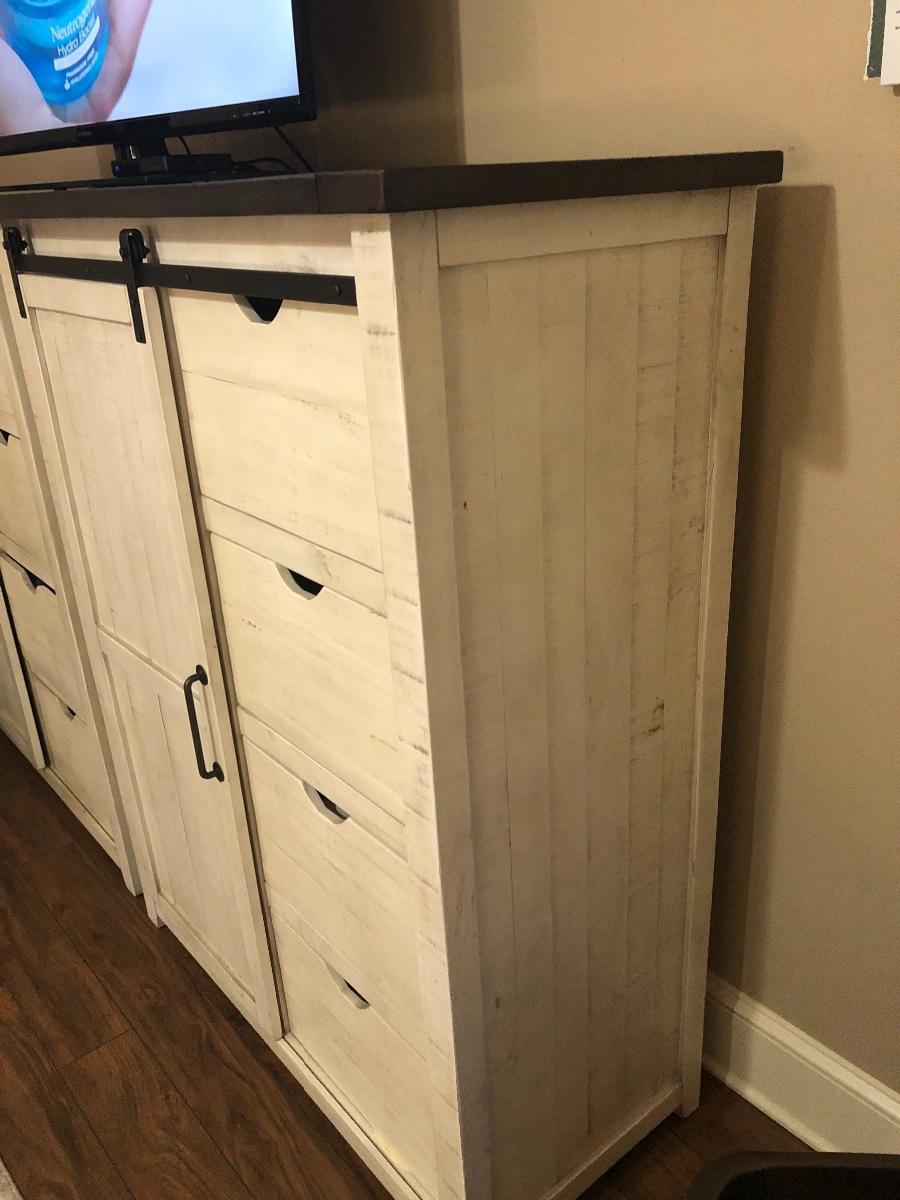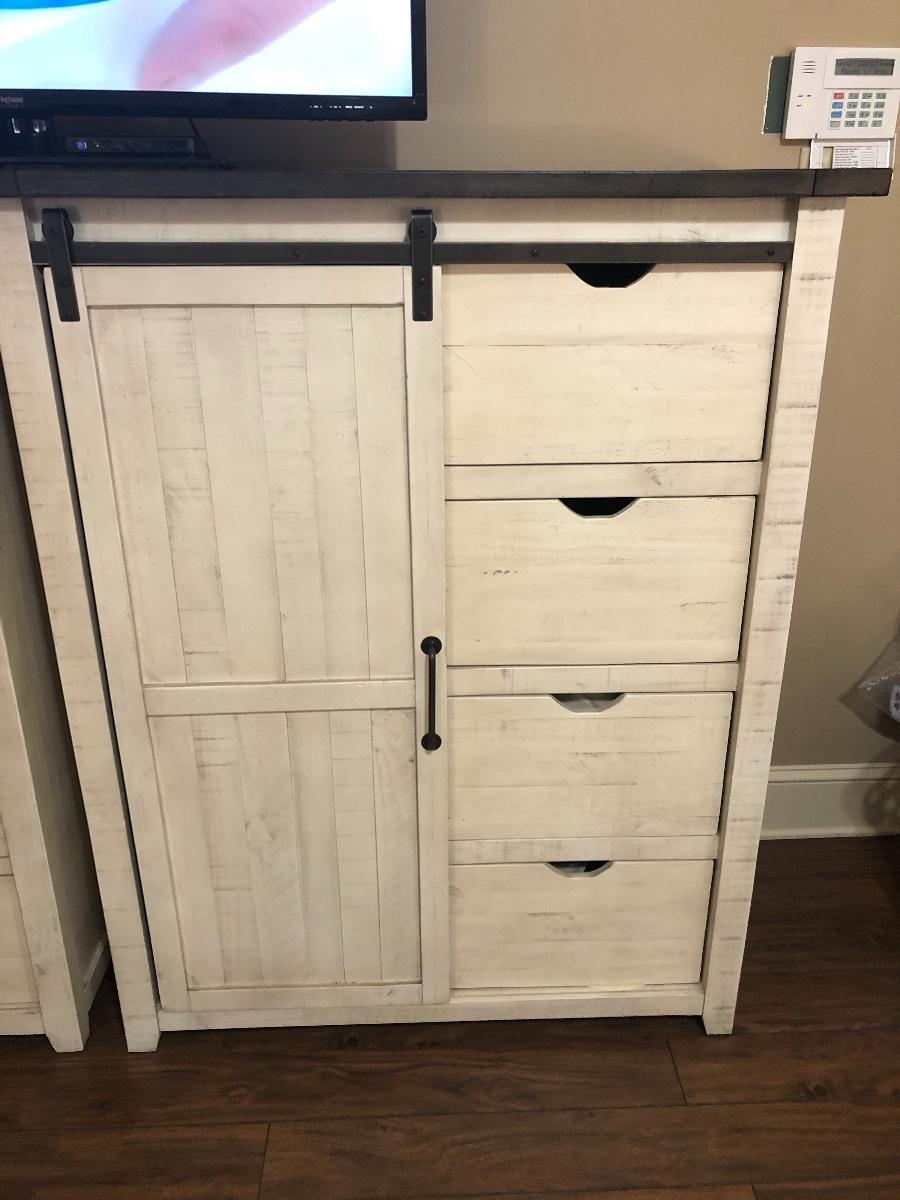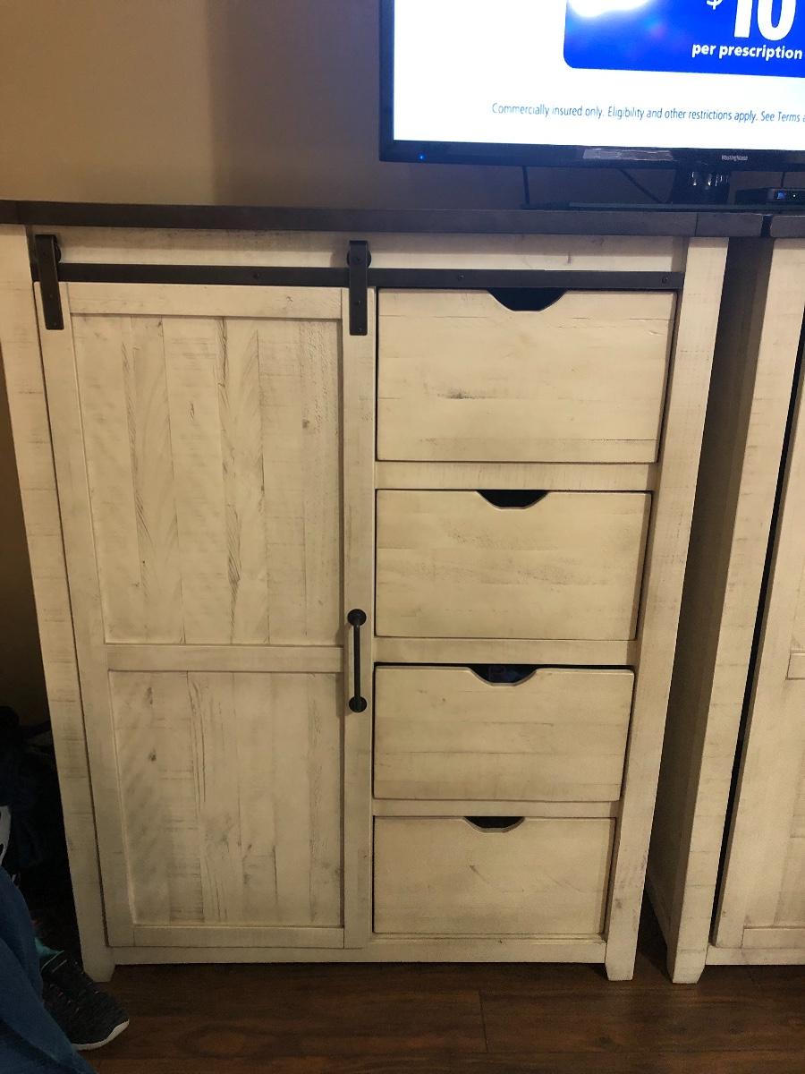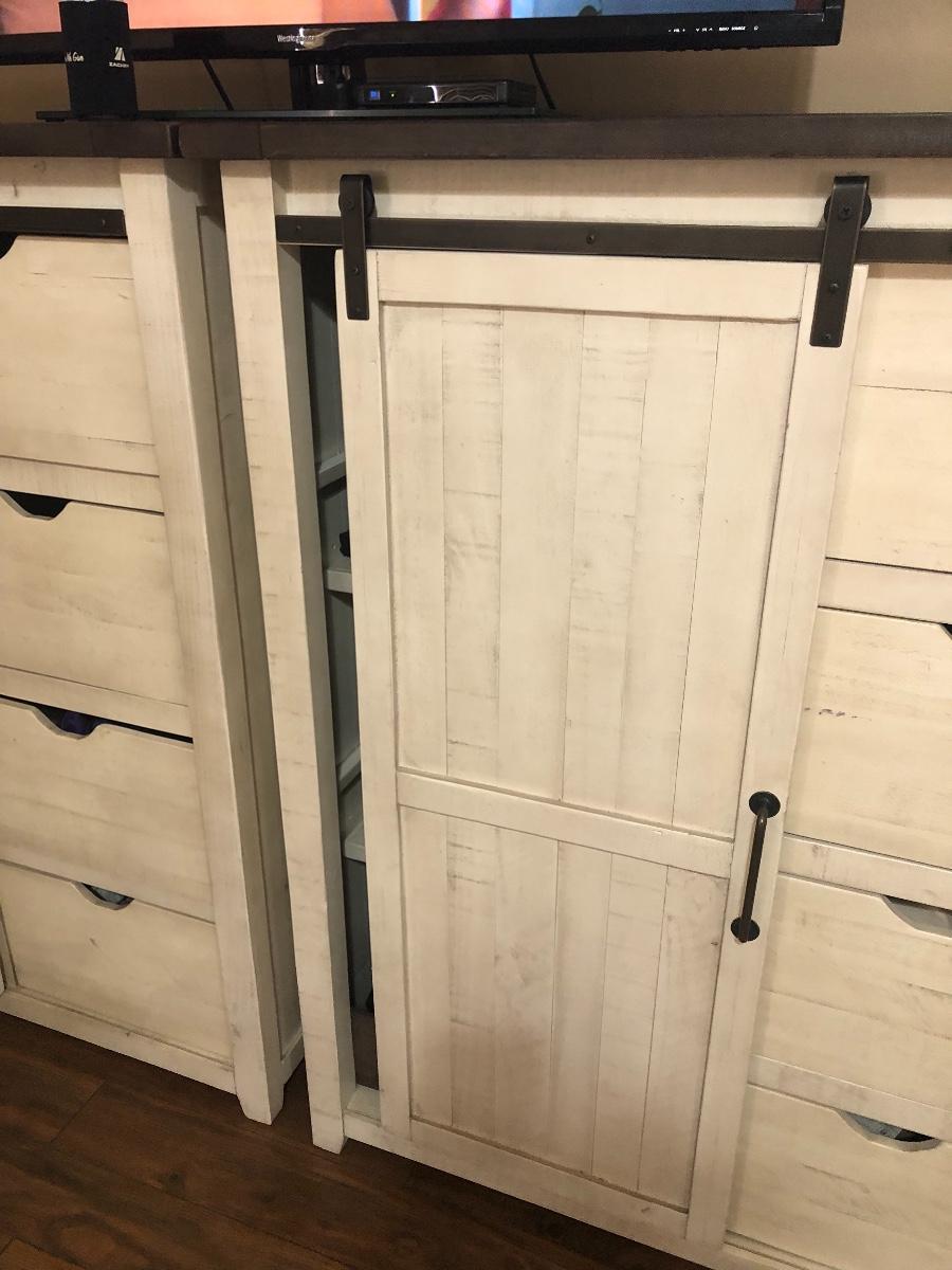These two cheats go with the rustic look of this bedroom. Sliding barn door on each with four drawers each. These were rarely used and measure 43 x 18.5 x 54 each