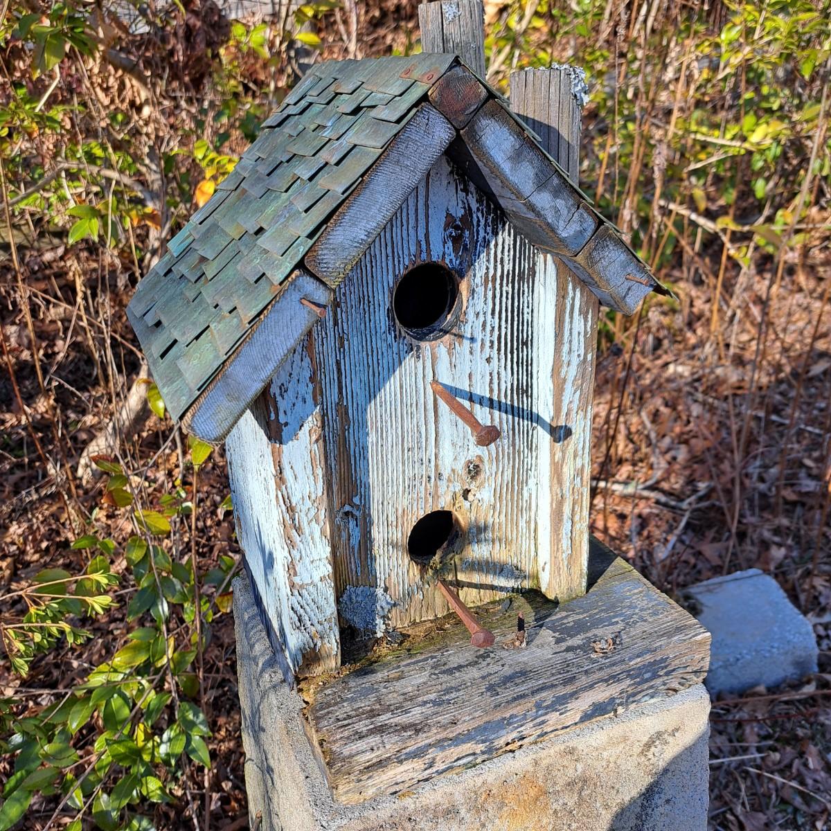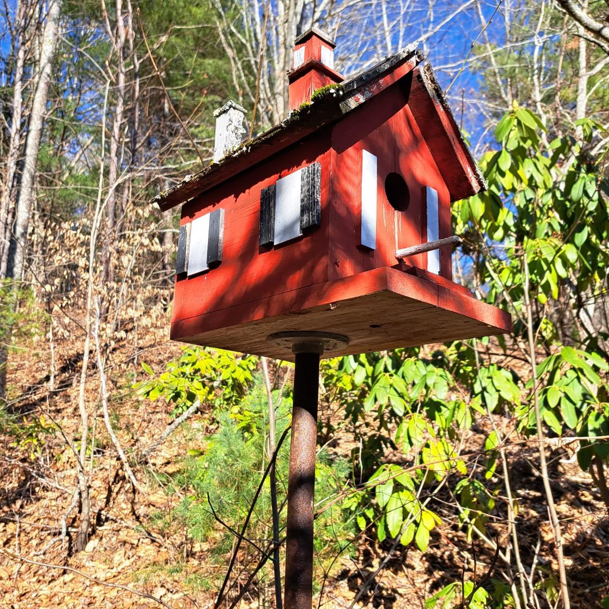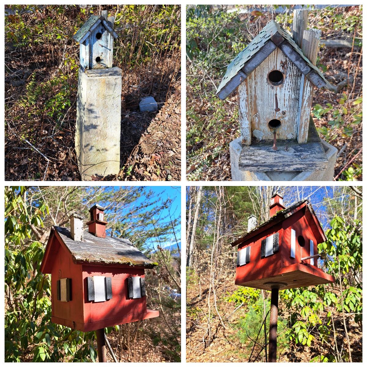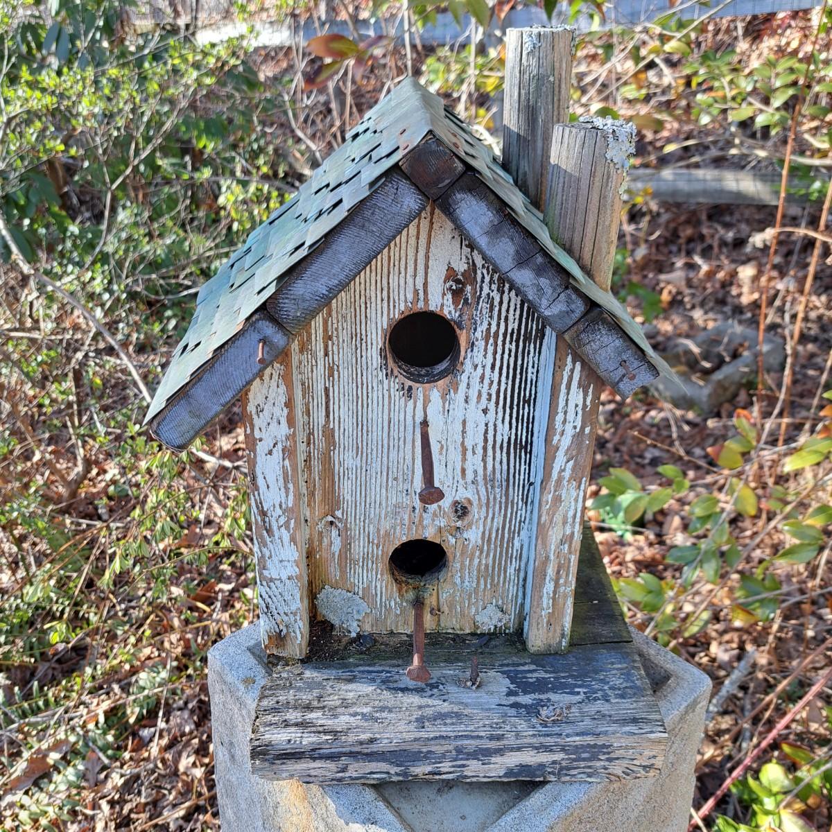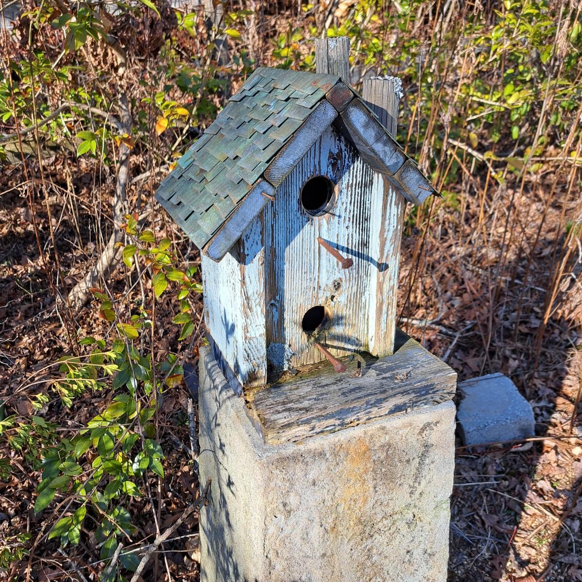 The first birdhouse, a double decker, nests on a faux concrete plinth (*easy to move).Birdhouse is a wonderful distressed pale blue with copper verdigris shingles and rusted nail perches. Bottom of birdhouse is a bit deteriorated, but still usable. Birdhouse itself is 15"H and plinth is 10" x 10" and 35"H. The two together are approximately 50"H. The second is a "little red schoolhouse" wooden birdhouse - complete with black shutters - attached to a rusted metal pole measuring approximately 75"H. Birdhouse itself appears to be in very good condition and is approximately 15"H. Local pickup only. Winning bidder must come prepared to remove both birdhouses from property.