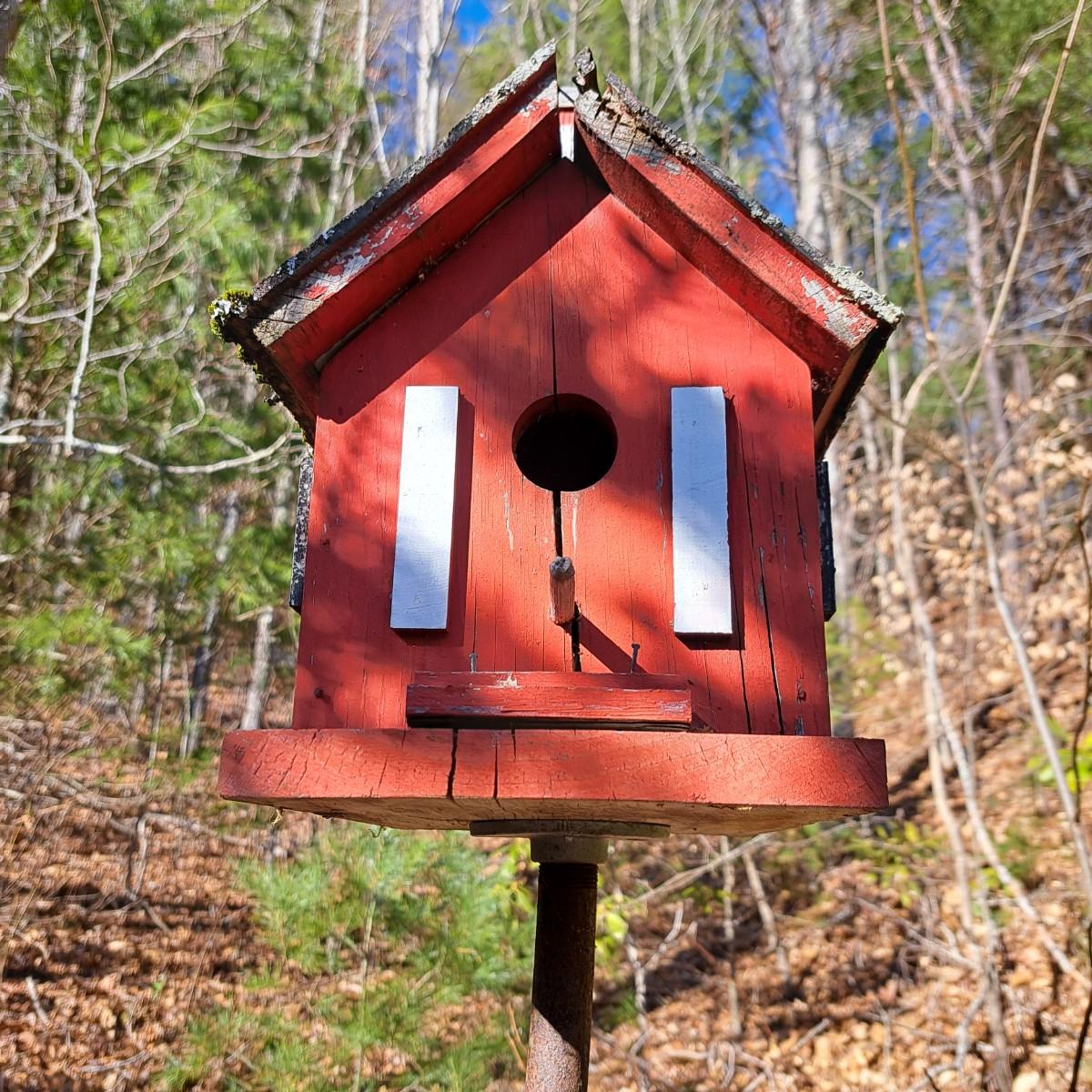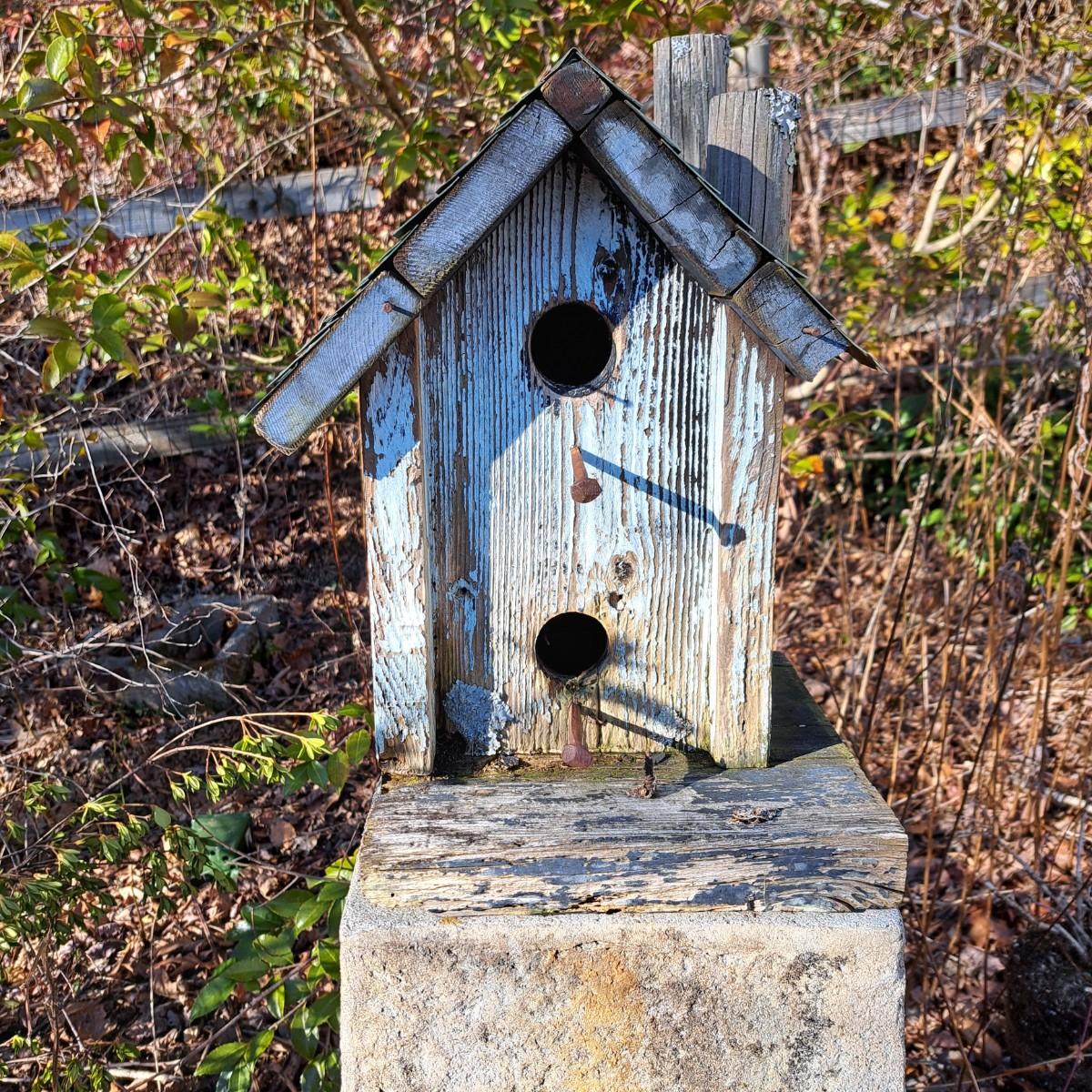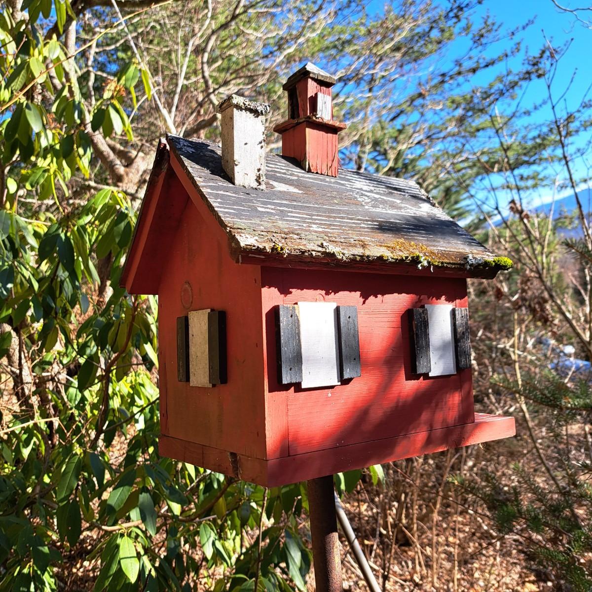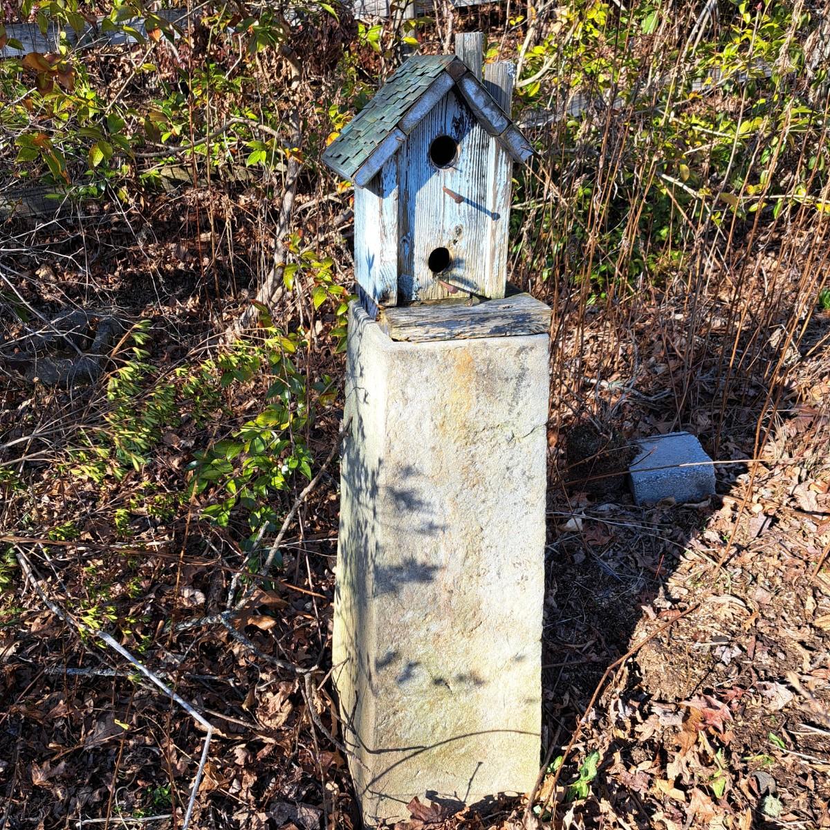 The first birdhouse, a double decker, nests on a faux concrete plinth (*easy to move).Birdhouse is a wonderful distressed pale blue with copper verdigris shingles and rusted nail perches. Bottom of birdhouse is a bit deteriorated, but still usable. Birdhouse itself is 15"H and plinth is 10" x 10" and 35"H. The two together are approximately 50"H. The second is a "little red schoolhouse" wooden birdhouse - complete with black shutters - attached to a rusted metal pole measuring approximately 75"H. Birdhouse itself appears to be in very good condition and is approximately 15"H. Local pickup only. Winning bidder must come prepared to remove both birdhouses from property.