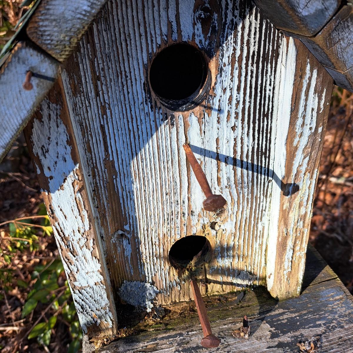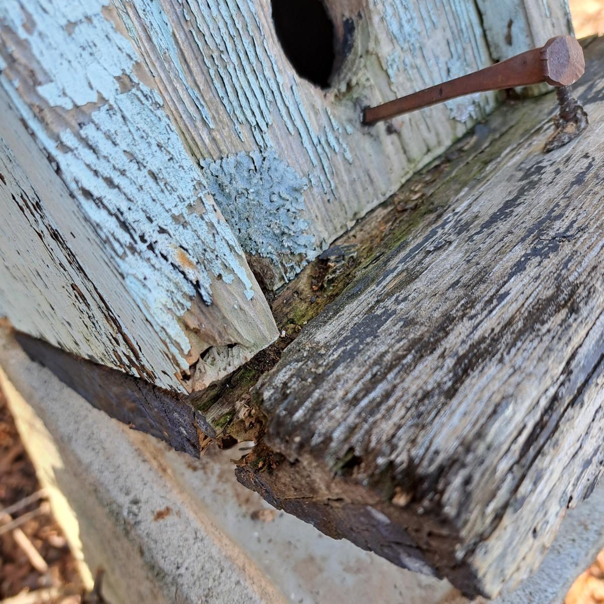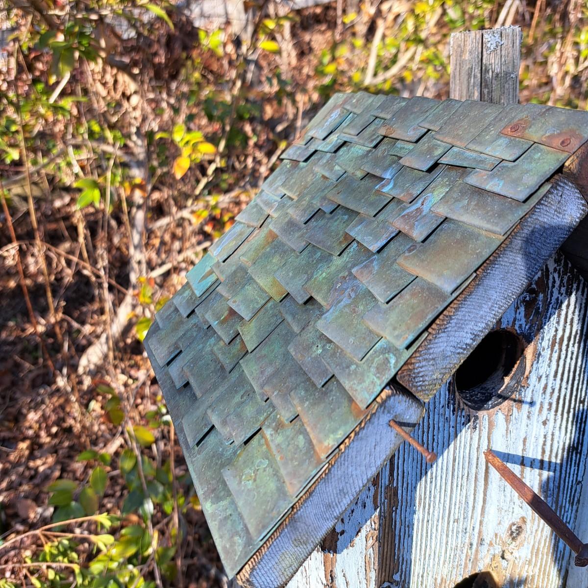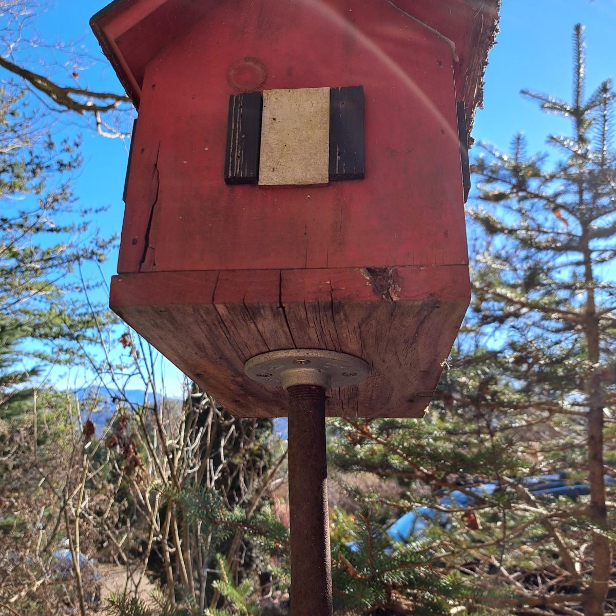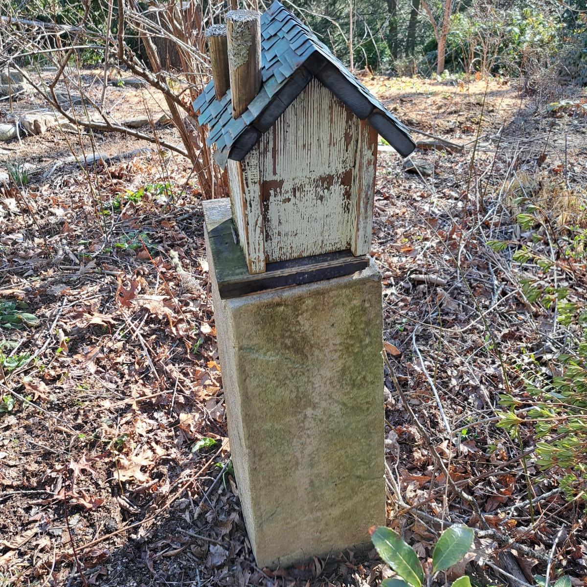 The first birdhouse, a double decker, nests on a faux concrete plinth (*easy to move).Birdhouse is a wonderful distressed pale blue with copper verdigris shingles and rusted nail perches. Bottom of birdhouse is a bit deteriorated, but still usable. Birdhouse itself is 15"H and plinth is 10" x 10" and 35"H. The two together are approximately 50"H. The second is a "little red schoolhouse" wooden birdhouse - complete with black shutters - attached to a rusted metal pole measuring approximately 75"H. Birdhouse itself appears to be in very good condition and is approximately 15"H. Local pickup only. Winning bidder must come prepared to remove both birdhouses from property.