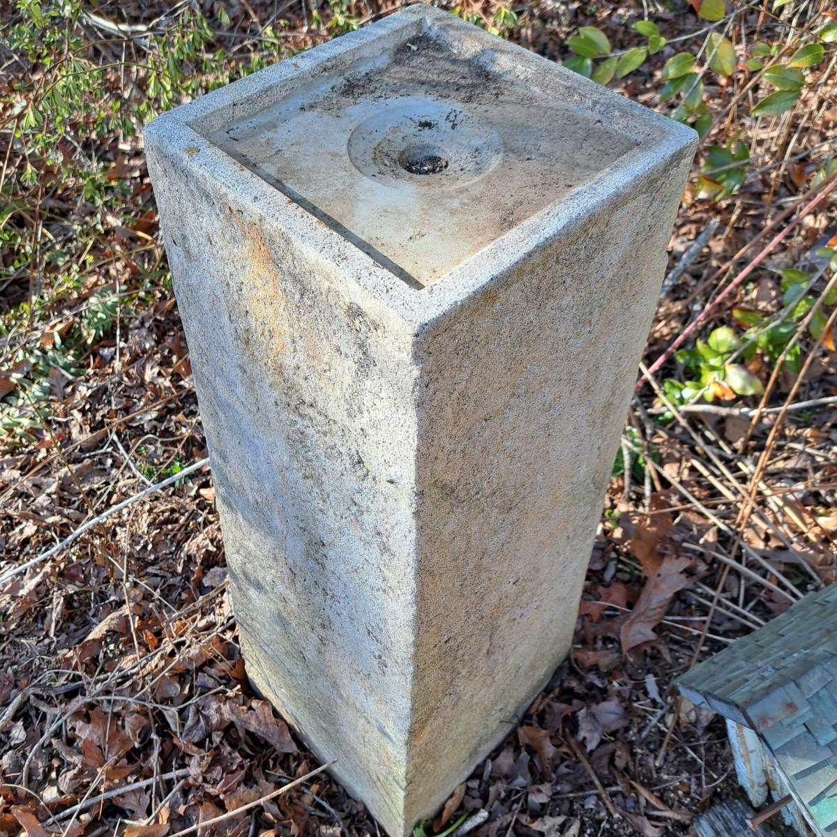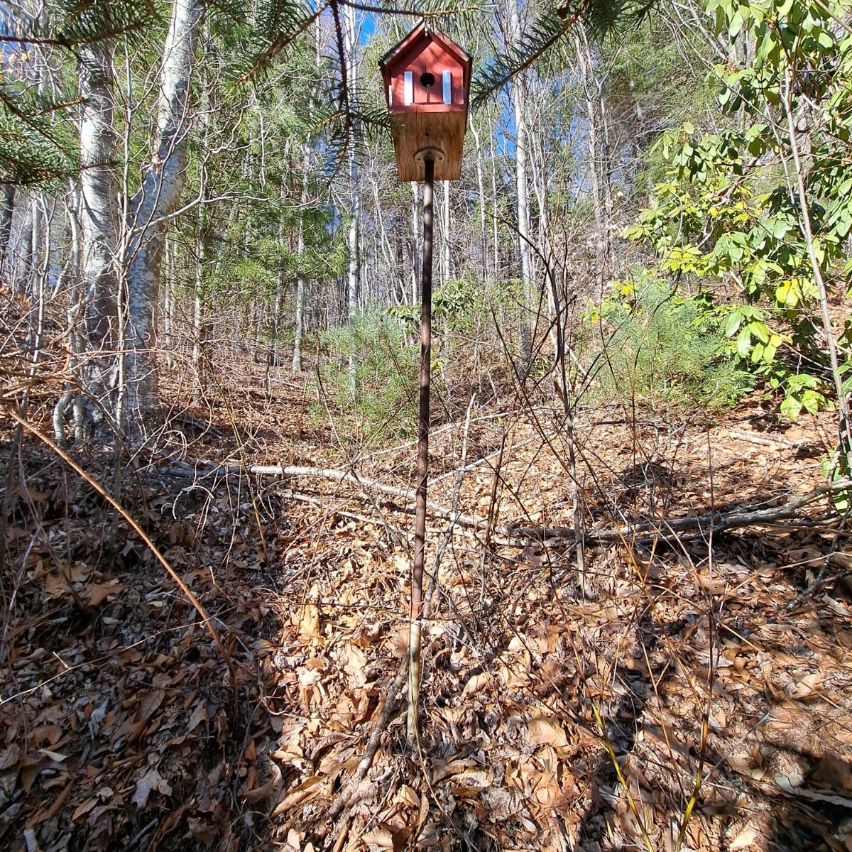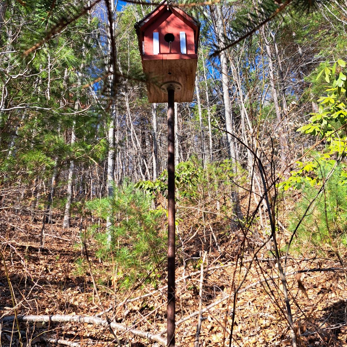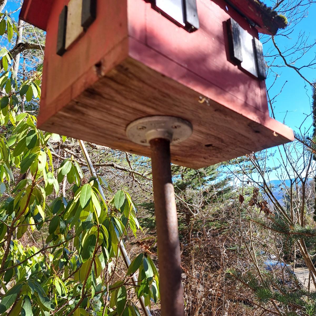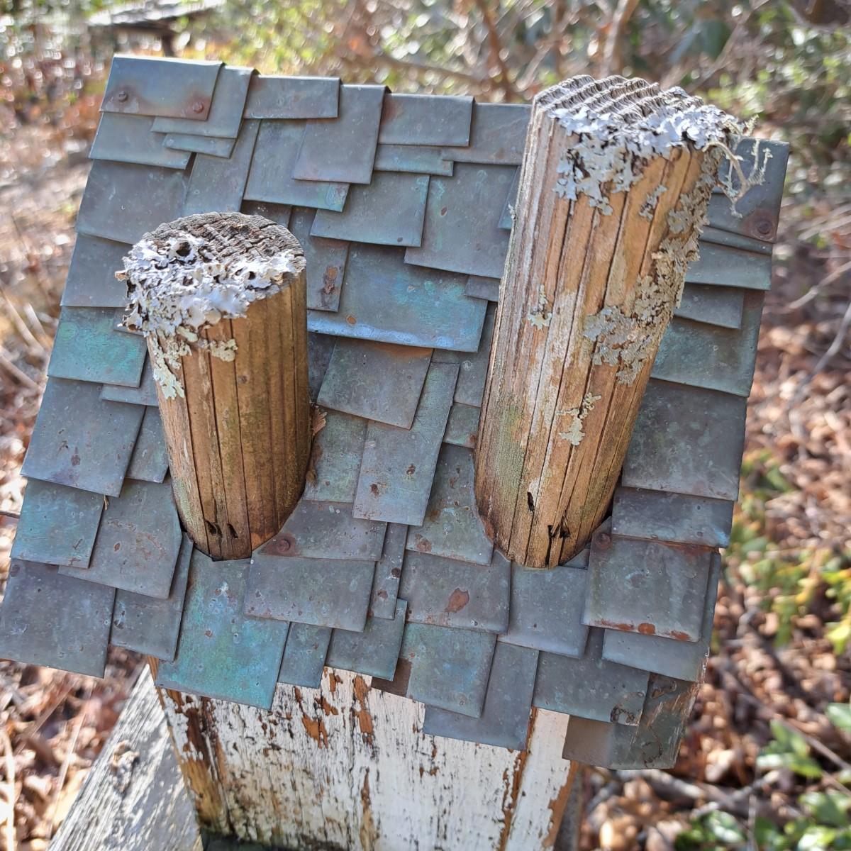 The first birdhouse, a double decker, nests on a faux concrete plinth (*easy to move).Birdhouse is a wonderful distressed pale blue with copper verdigris shingles and rusted nail perches. Bottom of birdhouse is a bit deteriorated, but still usable. Birdhouse itself is 15"H and plinth is 10" x 10" and 35"H. The two together are approximately 50"H. The second is a "little red schoolhouse" wooden birdhouse - complete with black shutters - attached to a rusted metal pole measuring approximately 75"H. Birdhouse itself appears to be in very good condition and is approximately 15"H. Local pickup only. Winning bidder must come prepared to remove both birdhouses from property.