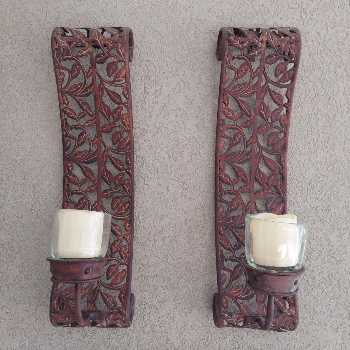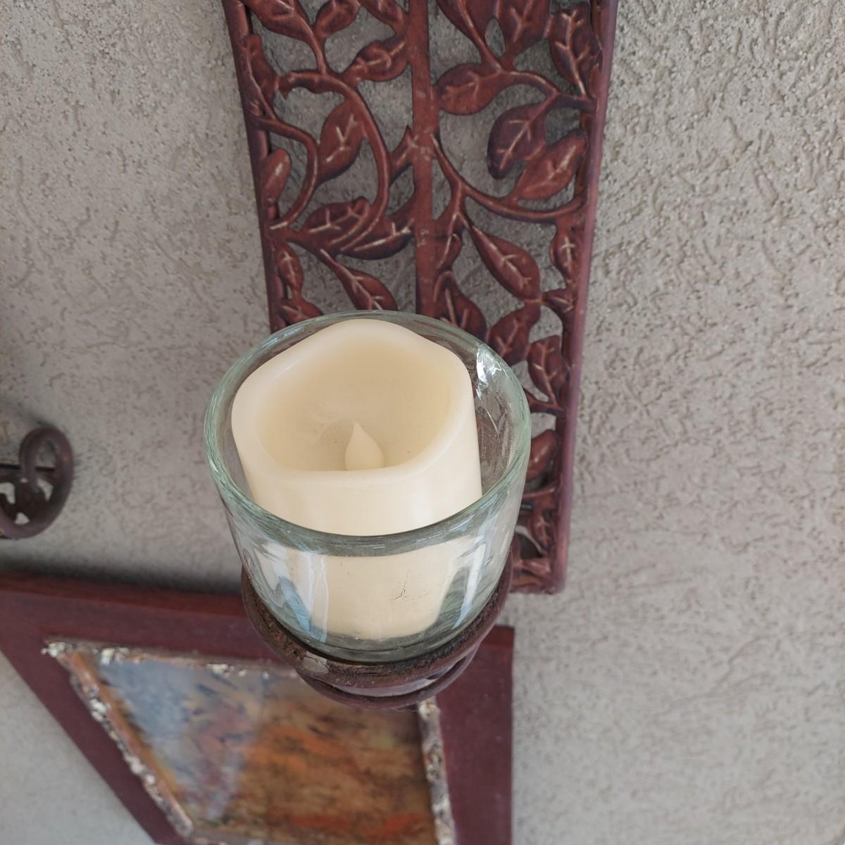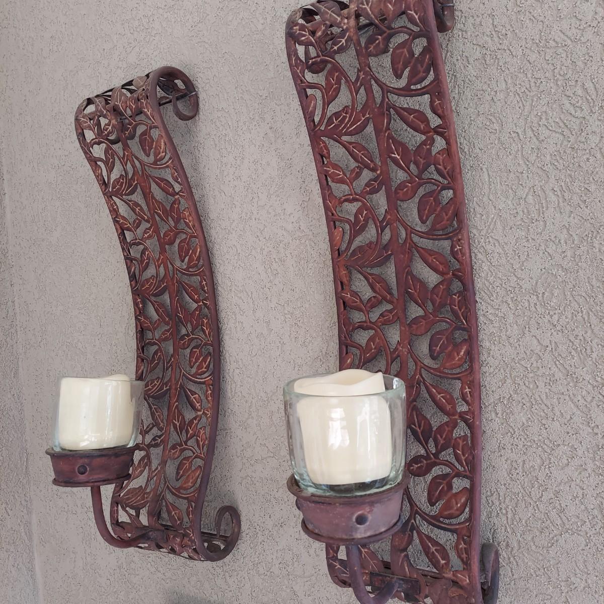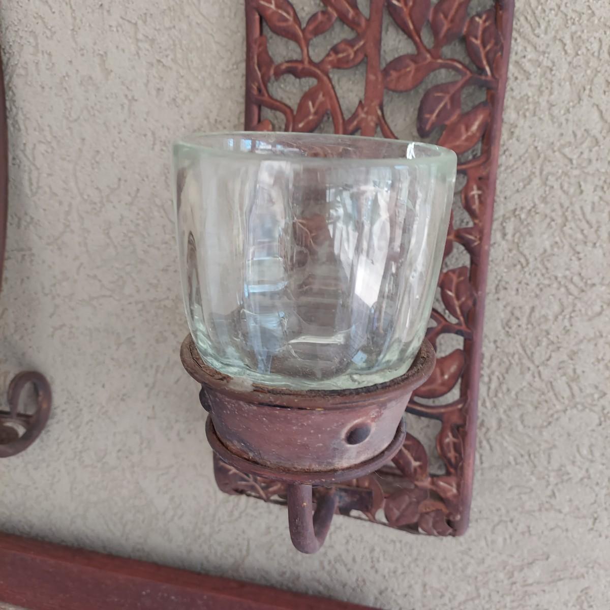 Two metal wall sconces with glass globes. They have an intentional overall rusty effect. Each comes with a battery-operated candle. Each sconce measures approximately 6” x 9” x 24"H. One globe has a crack. Both look to be currently hung with wire. Please see photos for details. Shipping available. Shipping can be costly. We suggest contacting our preferred local shipping provider, Postage Express, with dimensions and getting an estimate before bidding: (828) 255-9250 or shipping@postageexpressnc.com.
