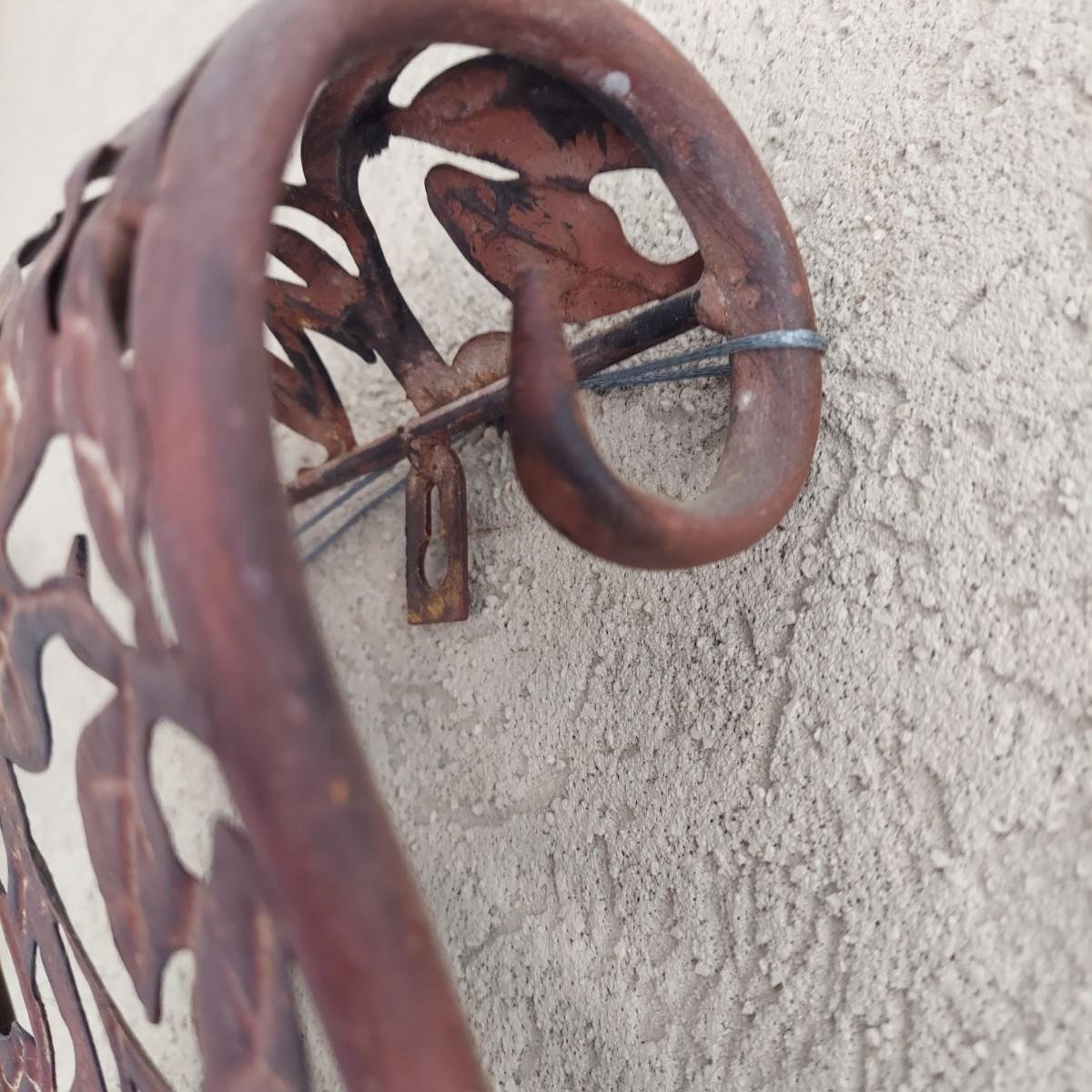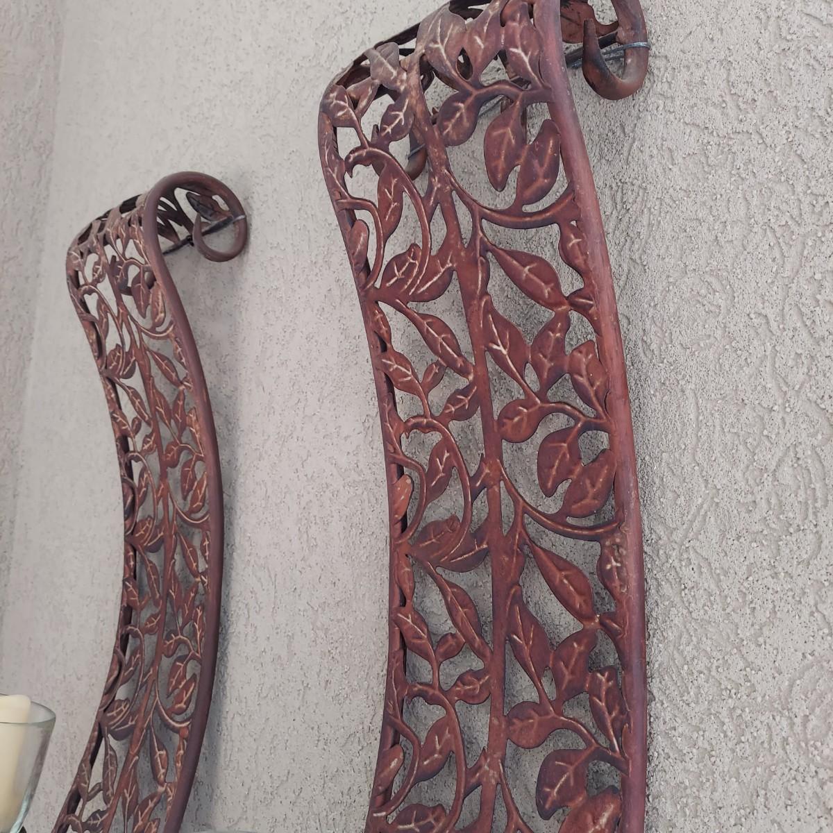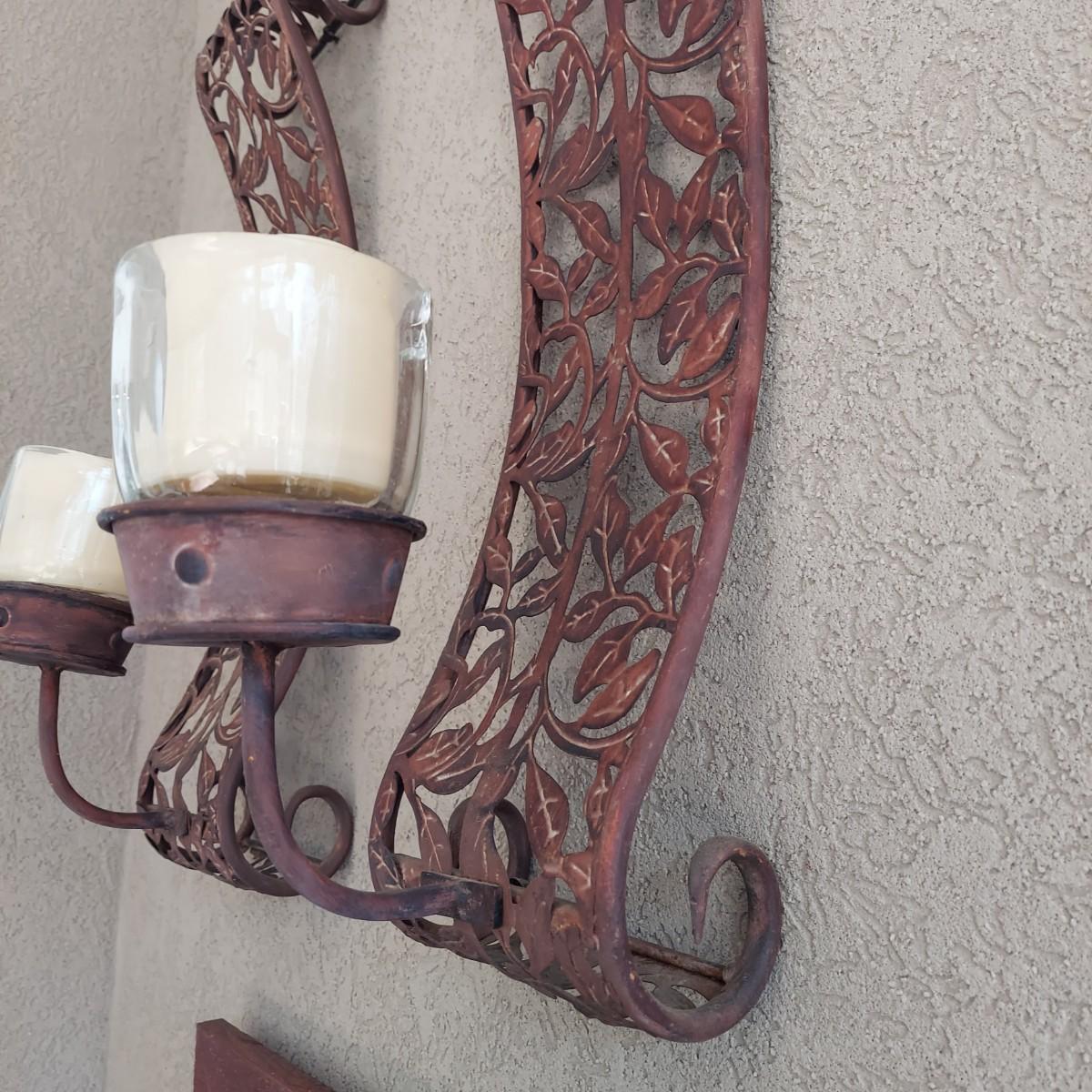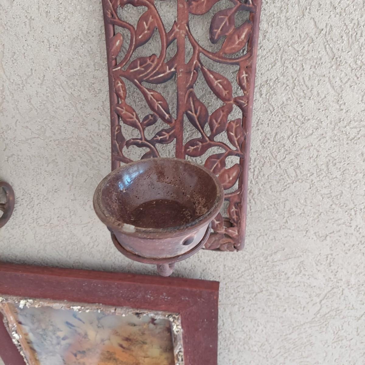 Two metal wall sconces with glass globes. They have an intentional overall rusty effect. Each comes with a battery-operated candle. Each sconce measures approximately 6” x 9” x 24"H. One globe has a crack. Both look to be currently hung with wire. Please see photos for details. Shipping available. Shipping can be costly. We suggest contacting our preferred local shipping provider, Postage Express, with dimensions and getting an estimate before bidding: (828) 255-9250 or shipping@postageexpressnc.com.
