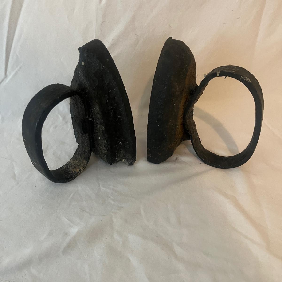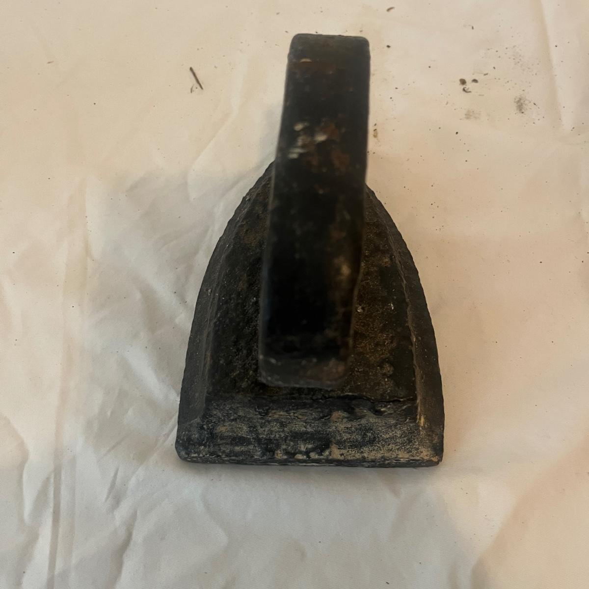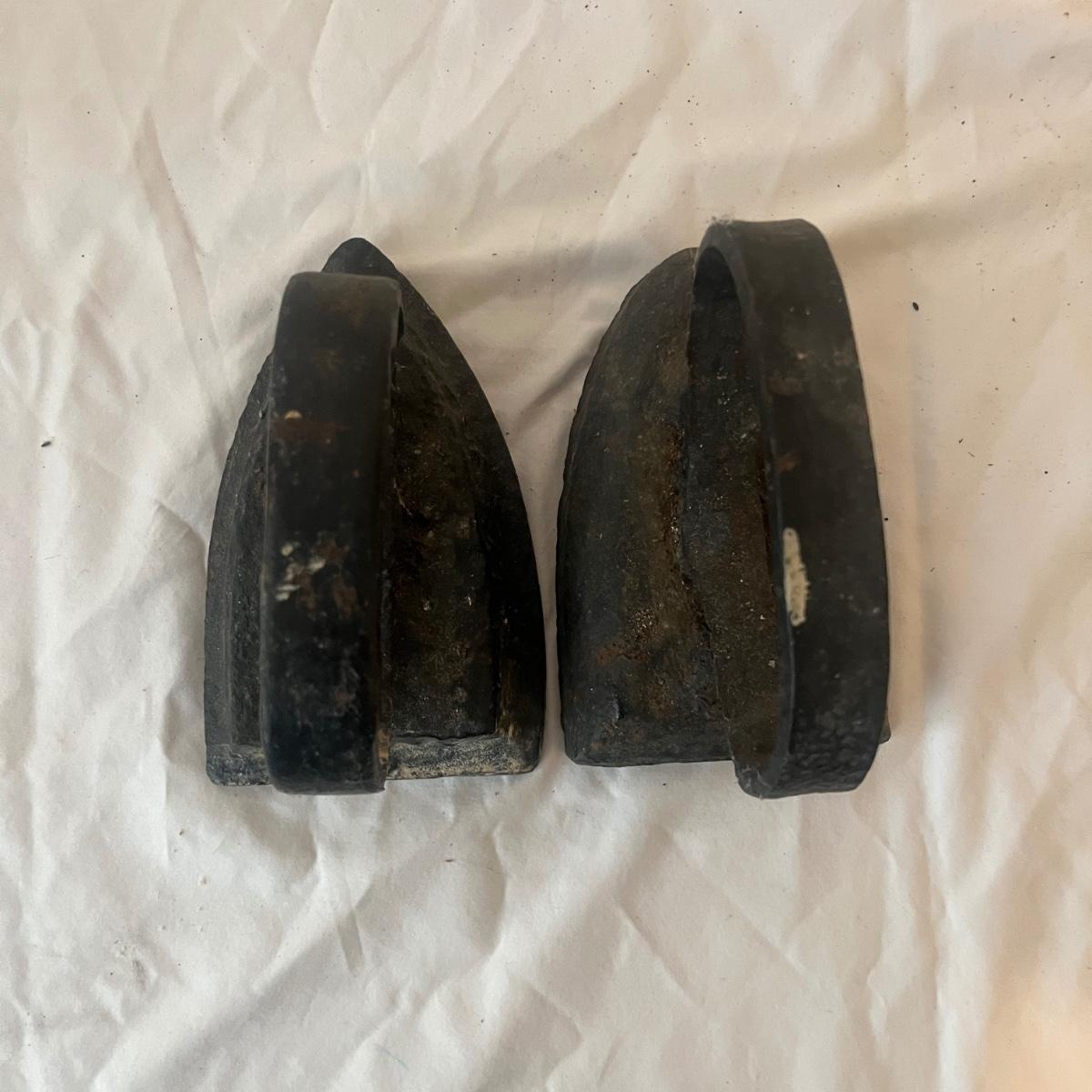 Lot includes two iron sad irons. Irons measure 4” x 4.5” x 6.5”H. Irons have rust, but appear solid, see pictures.