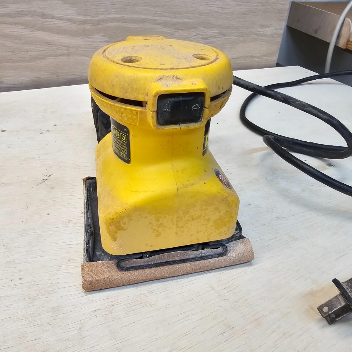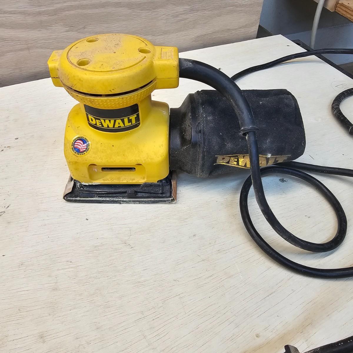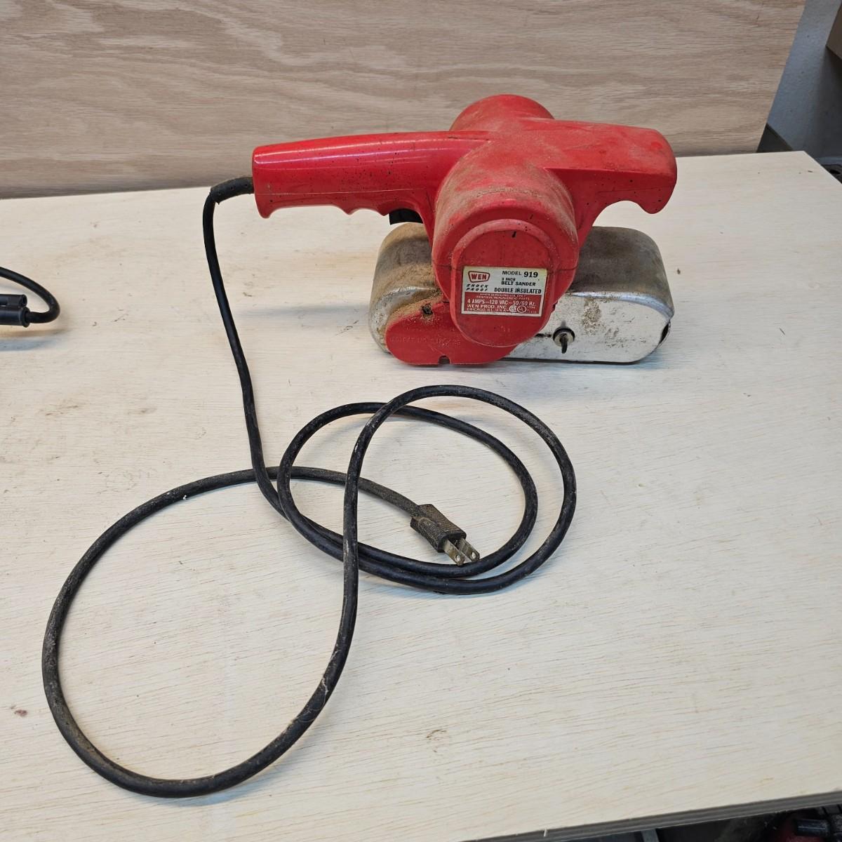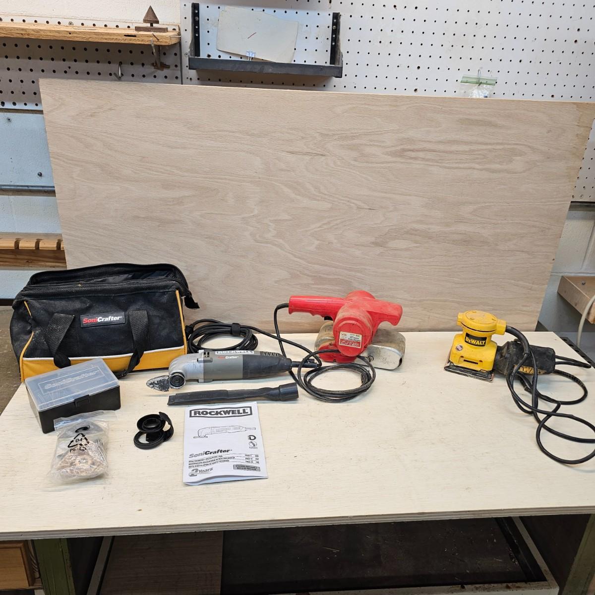 One DeWalt palm sander with dust bag, 4.5" x 4.5" x 5"H. Note that cord is wrapped with electrical tape. An older Wen 3" belt sander, 6.5" x 13" x 6"H. One Rockwell SoniCrafter oscillating tool with bag and accessories. 2" x 14.5" x 4"H. All items powered on when plugged in. See photos for details. Local pickup only.