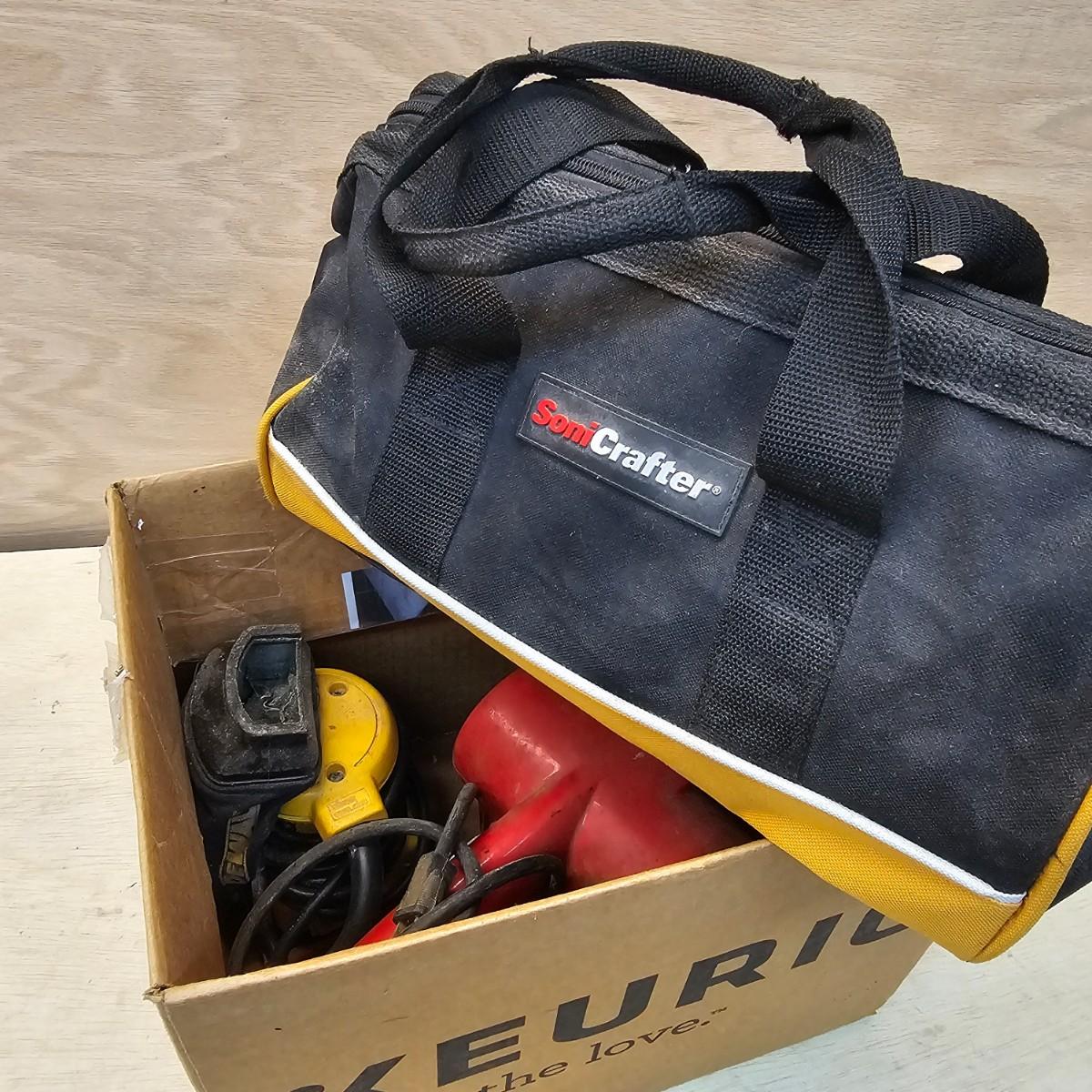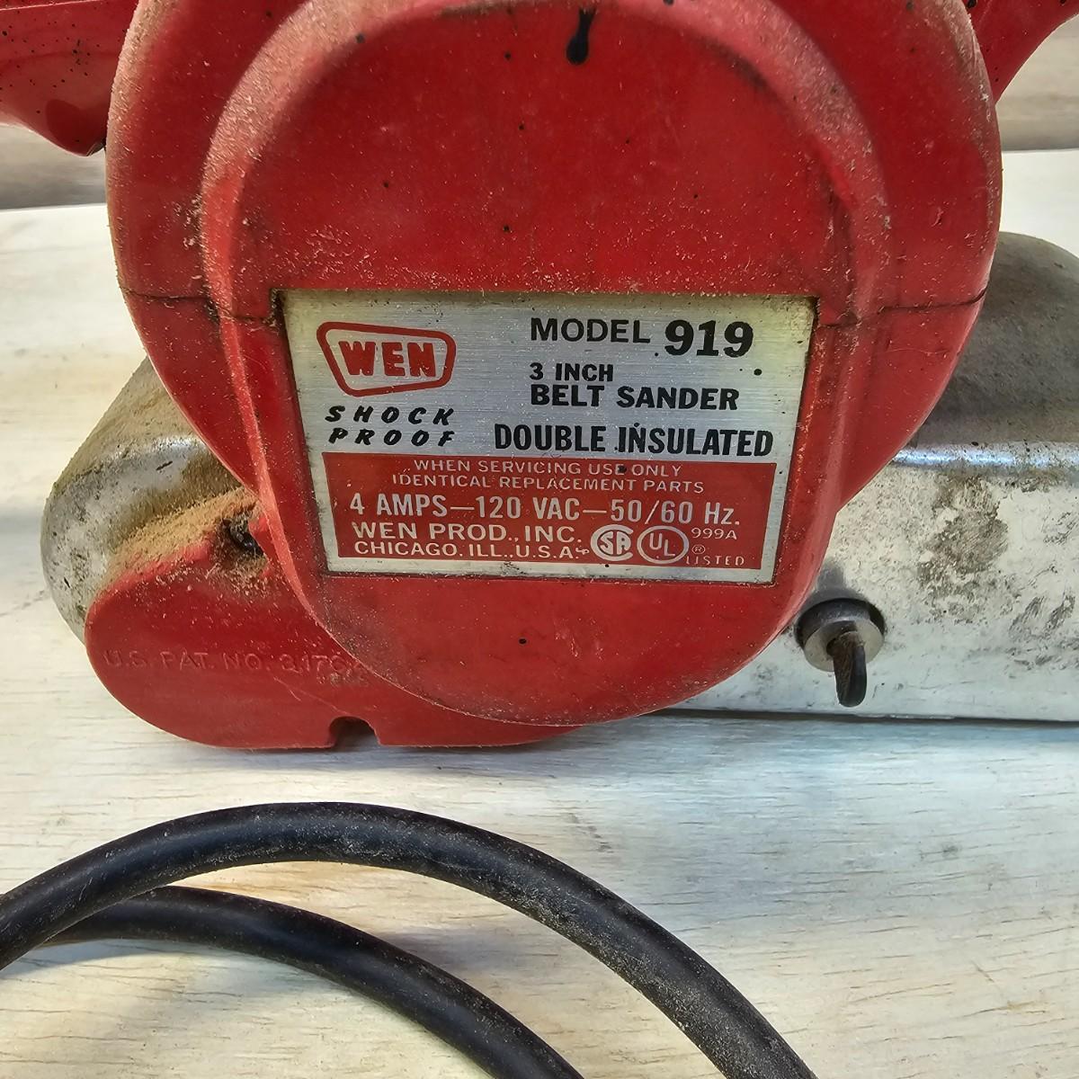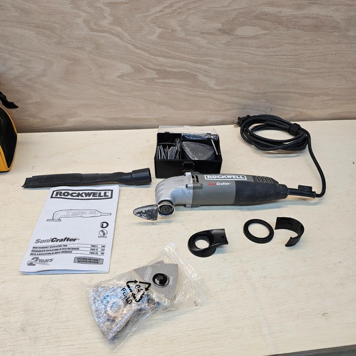One DeWalt palm sander with dust bag, 4.5" x 4.5" x 5"H. Note that cord is wrapped with electrical tape. An older Wen 3" belt sander, 6.5" x 13" x 6"H. One Rockwell SoniCrafter oscillating tool with bag and accessories. 2" x 14.5" x 4"H. All items powered on when plugged in. See photos for details. Local pickup only.
