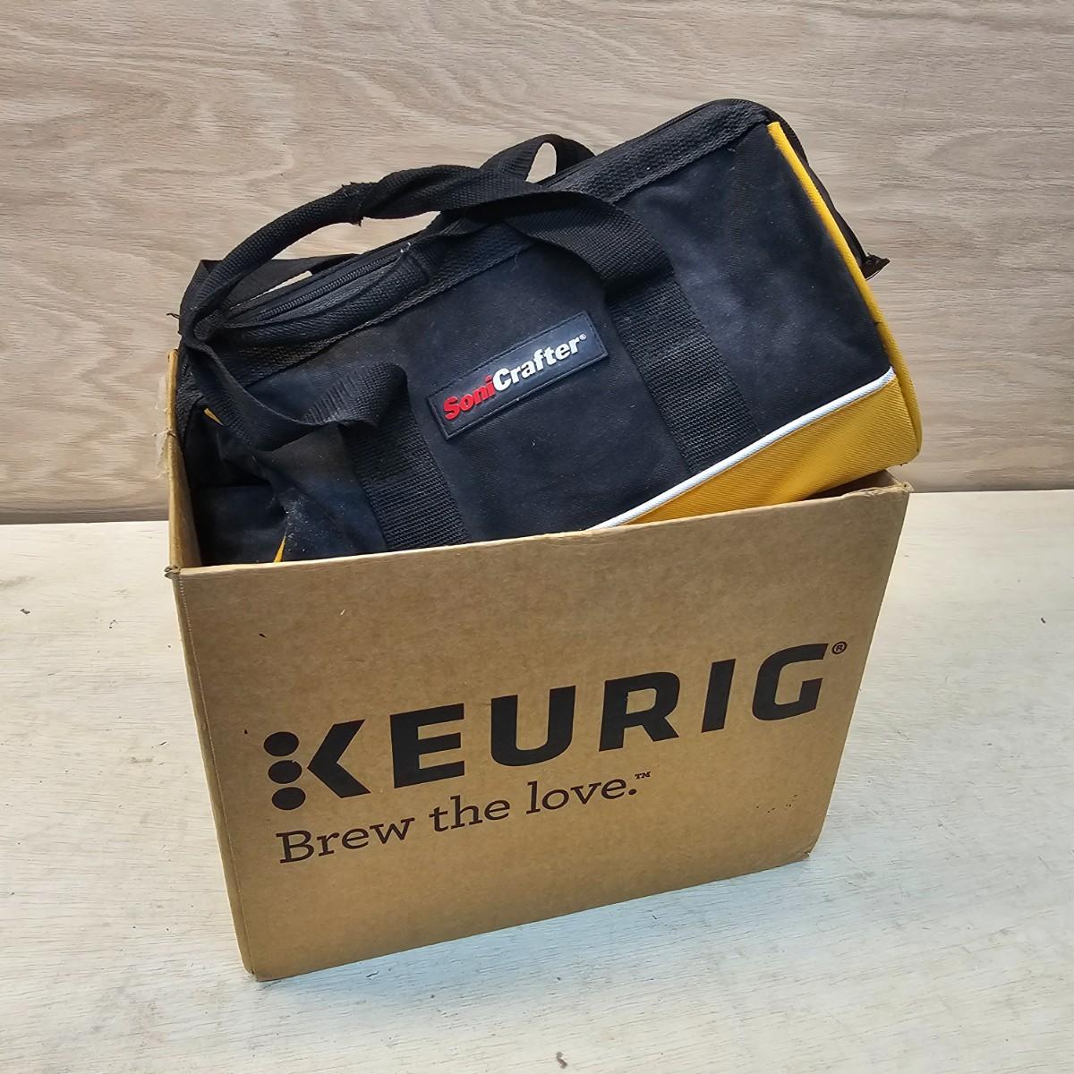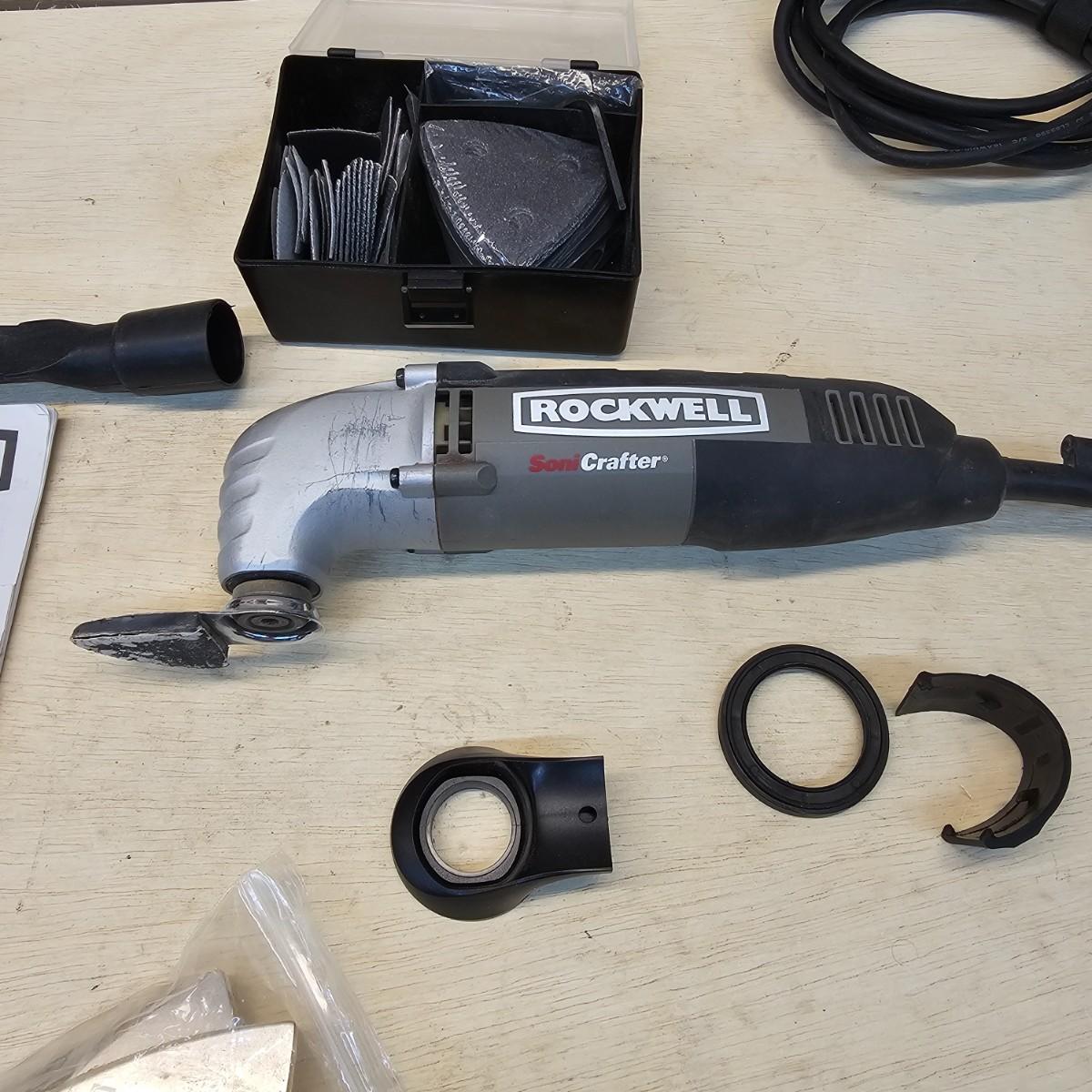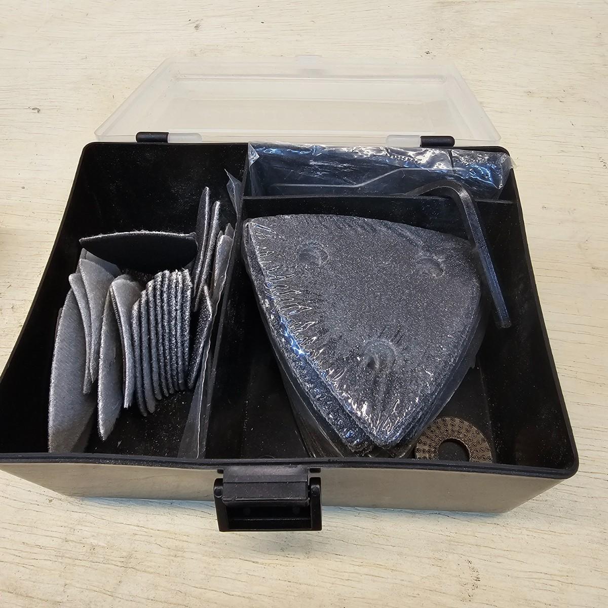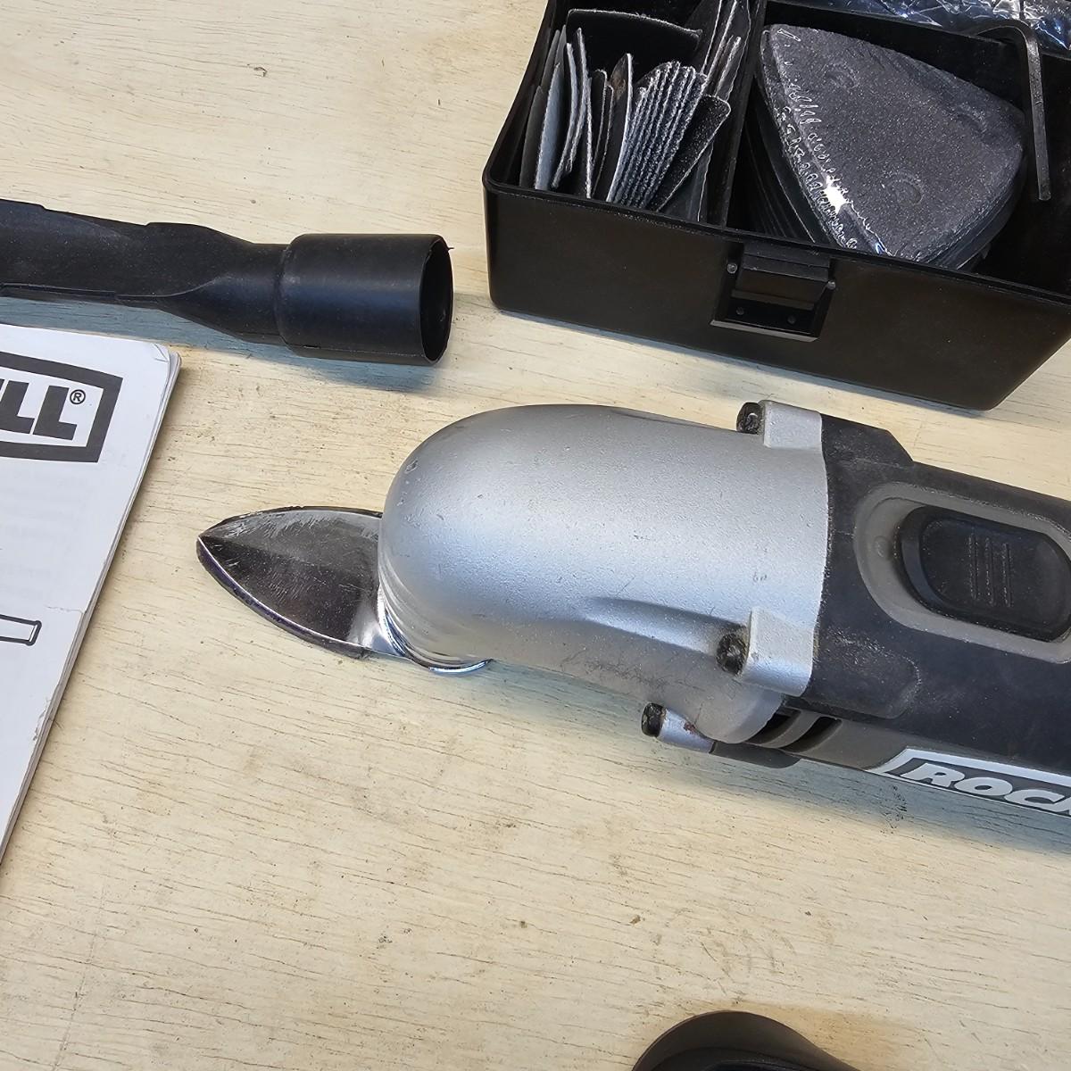 One DeWalt palm sander with dust bag, 4.5" x 4.5" x 5"H. Note that cord is wrapped with electrical tape. An older Wen 3" belt sander, 6.5" x 13" x 6"H. One Rockwell SoniCrafter oscillating tool with bag and accessories. 2" x 14.5" x 4"H. All items powered on when plugged in. See photos for details. Local pickup only.
