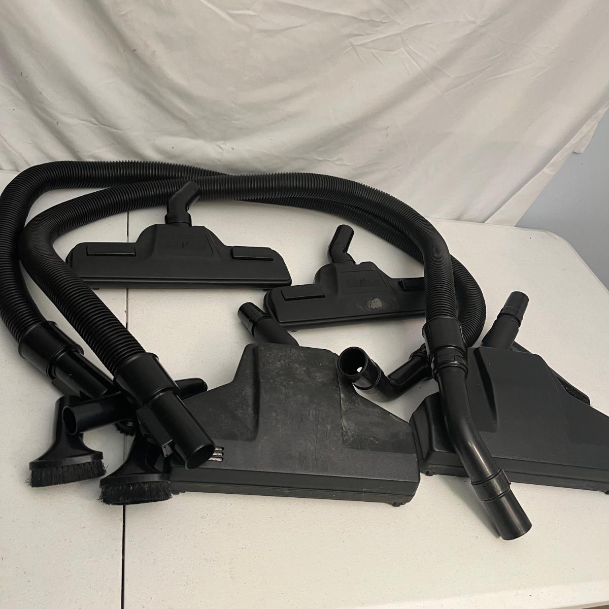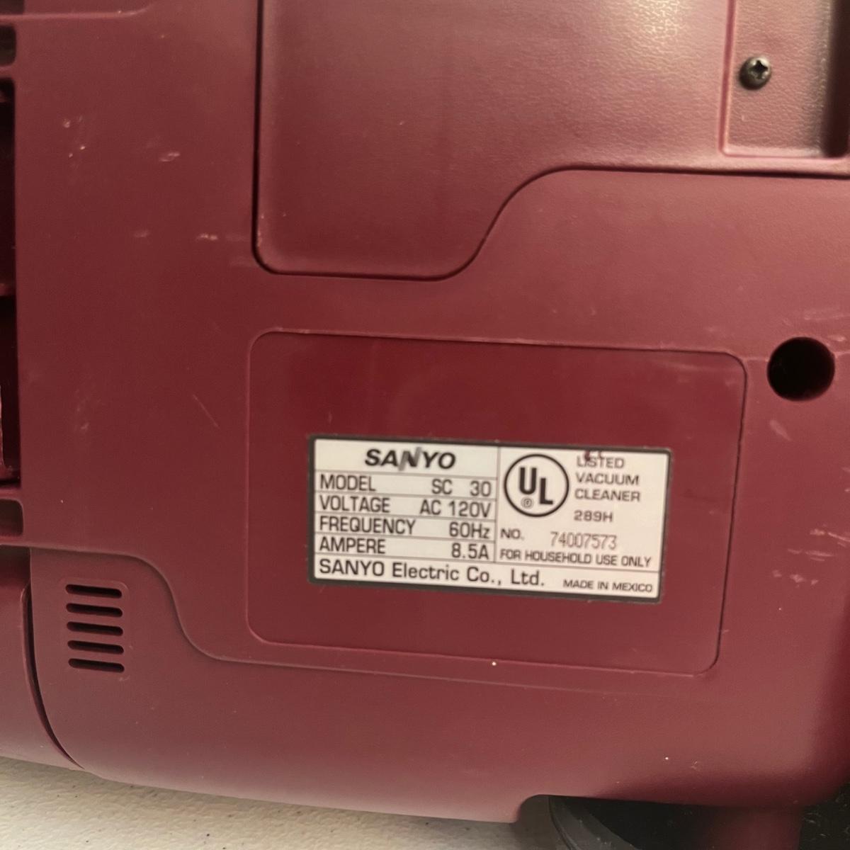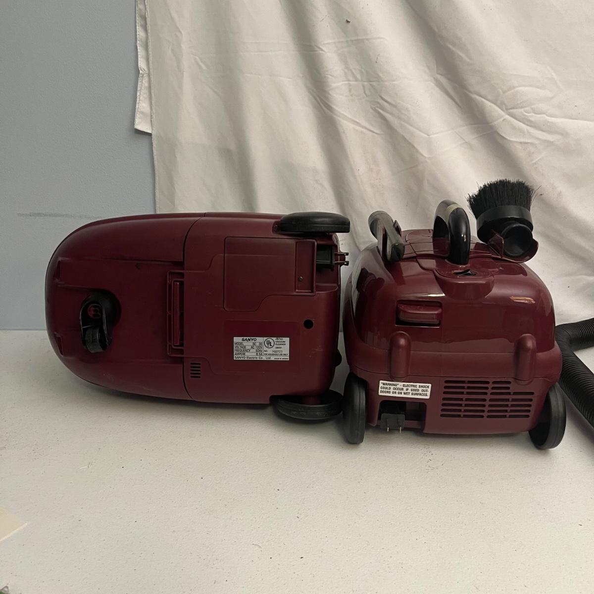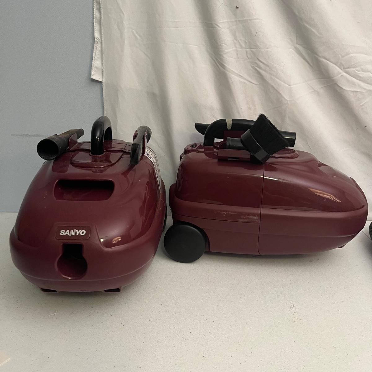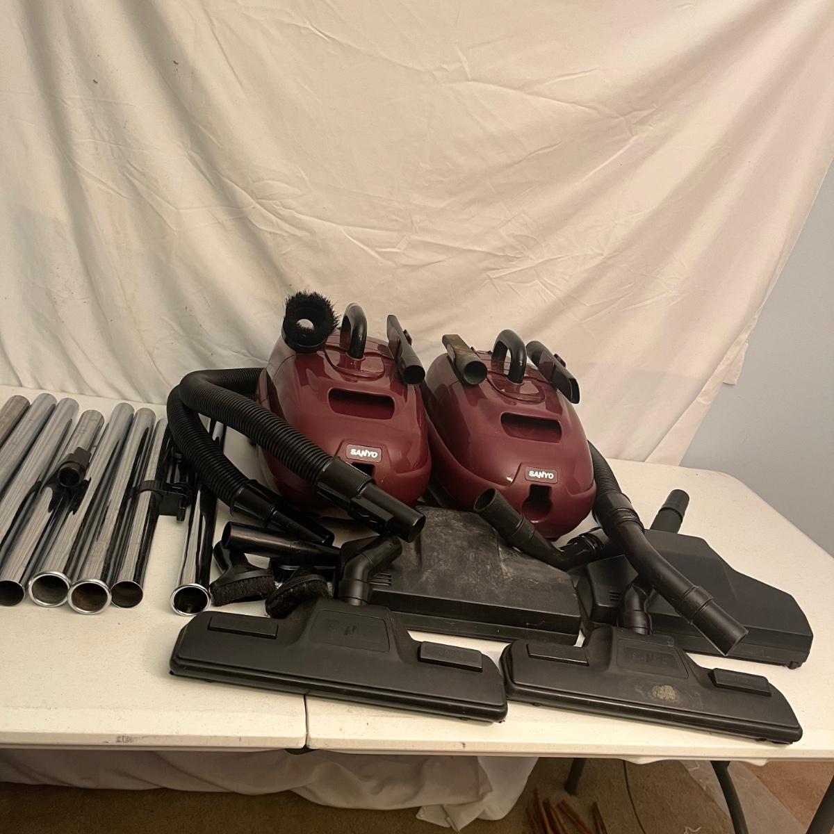 Lot includes two Sanyo SC-30 canister vacuums with accessories. Both vacuums powered on when tested.