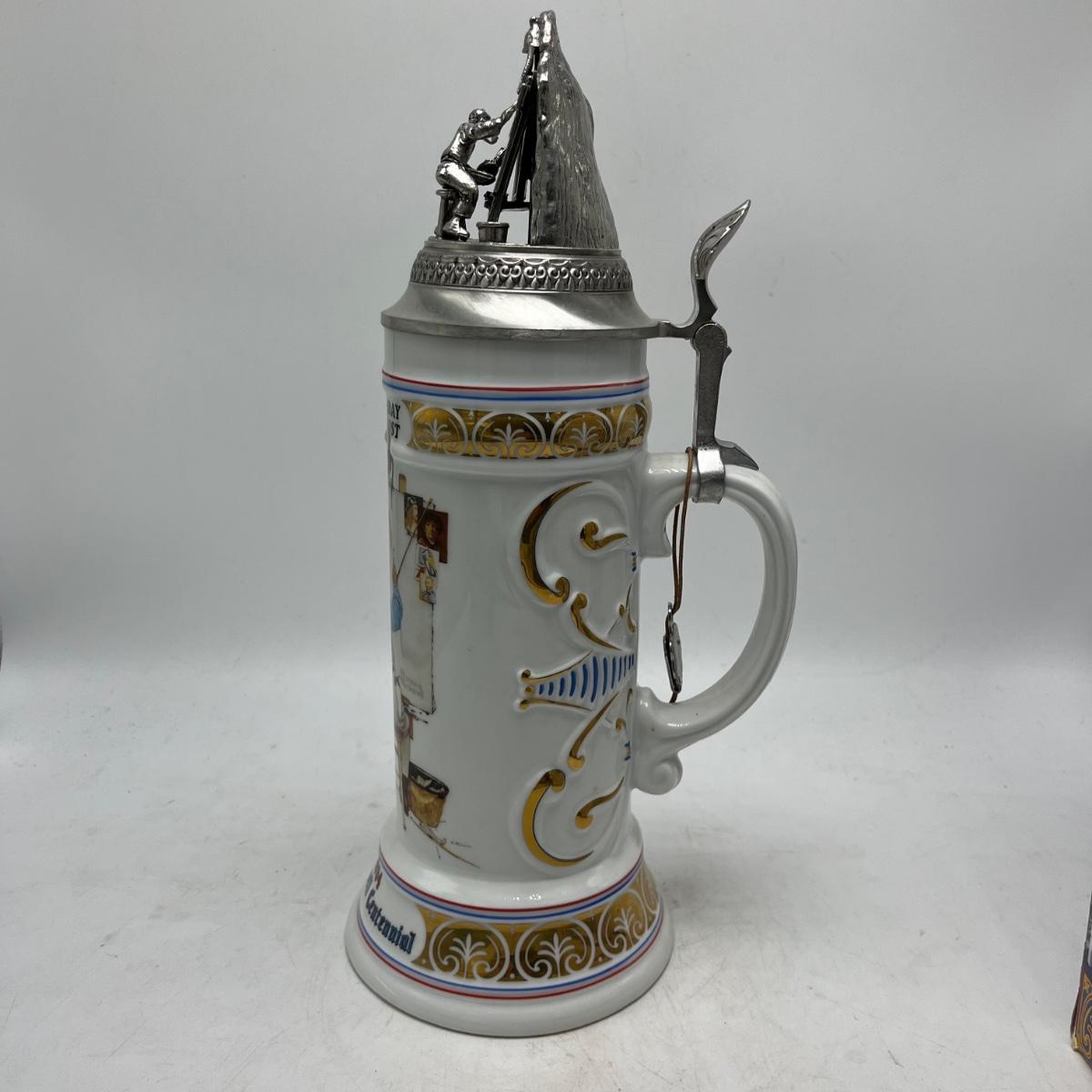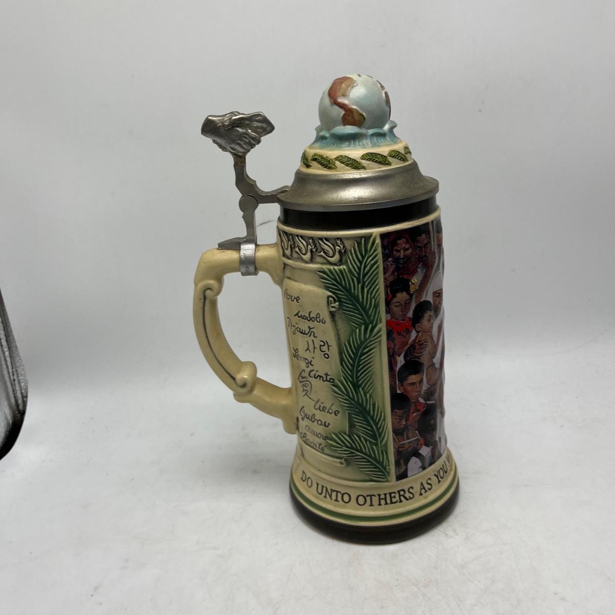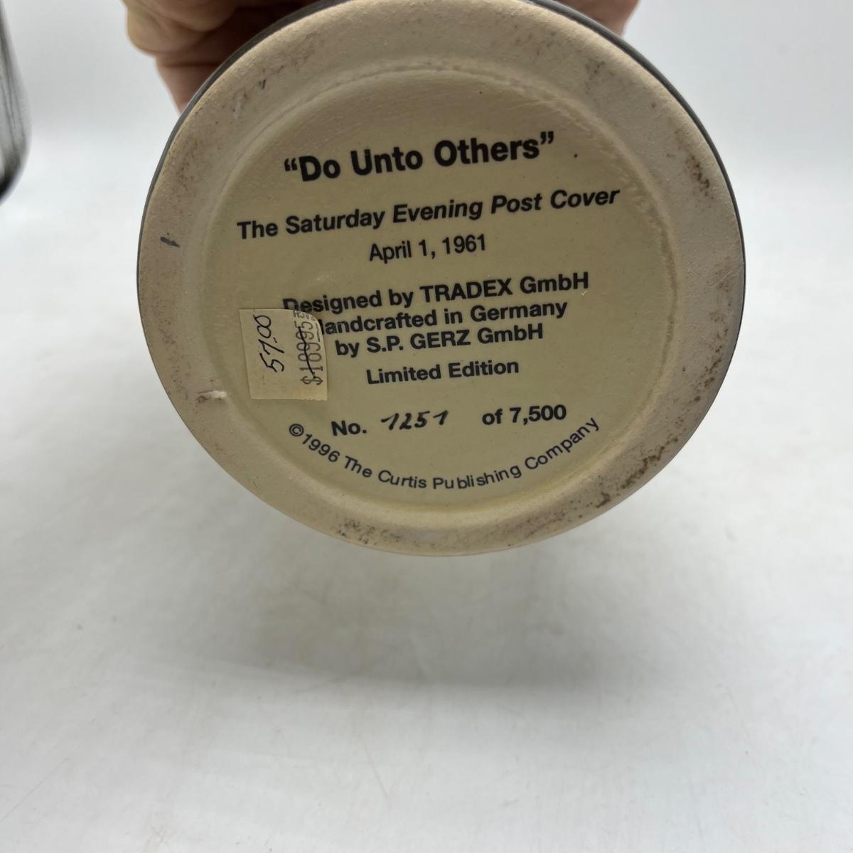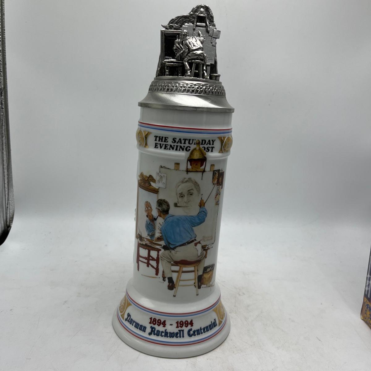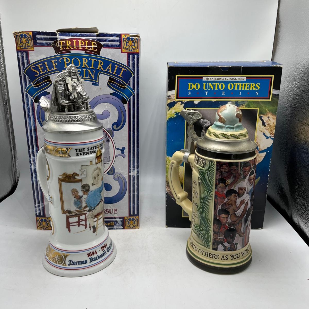 Lot contains a Norman Rockwell Centennial stein and Do unto Others Stein. Largest stein measures 4.75” x 5” 12.5”.