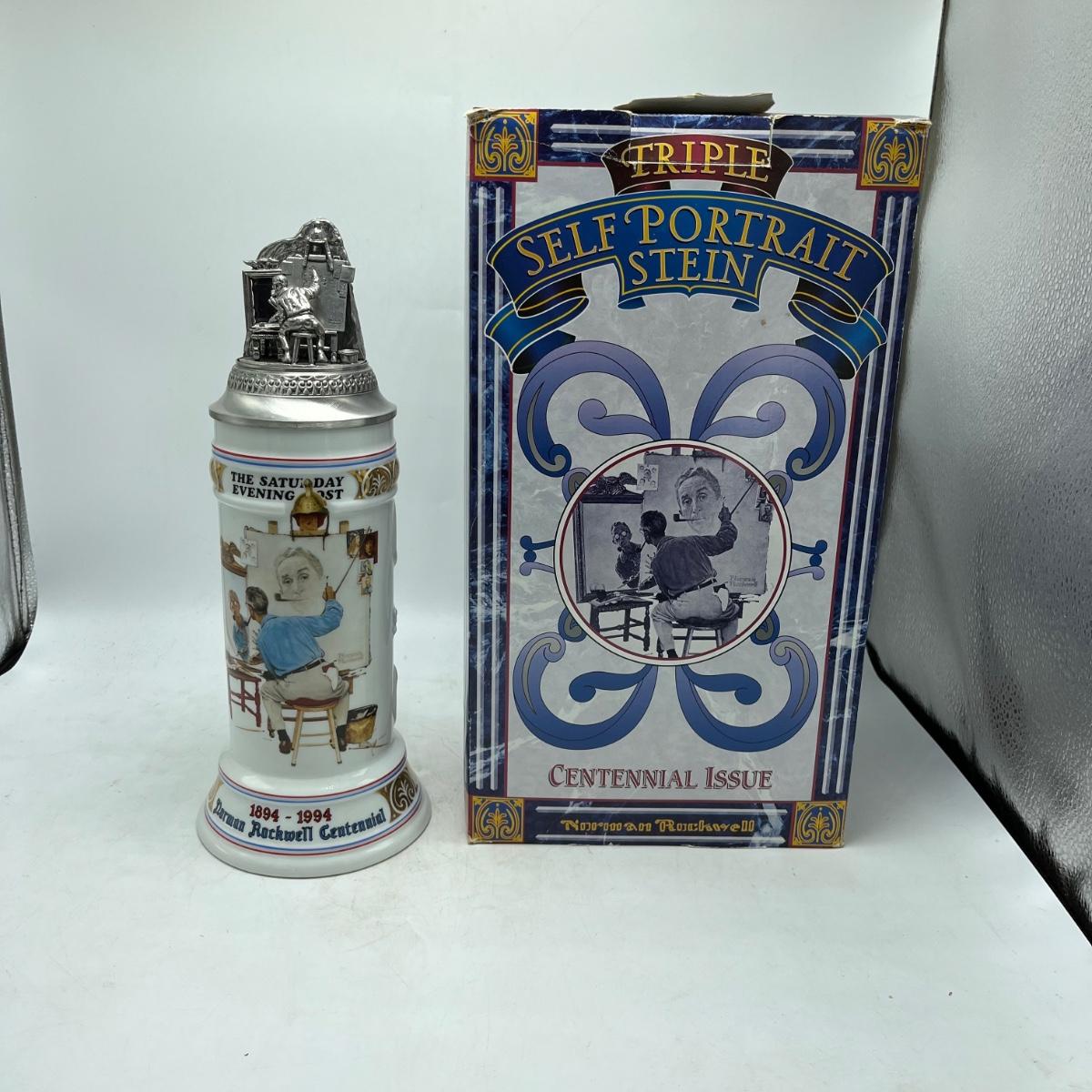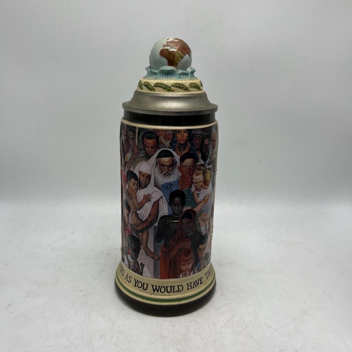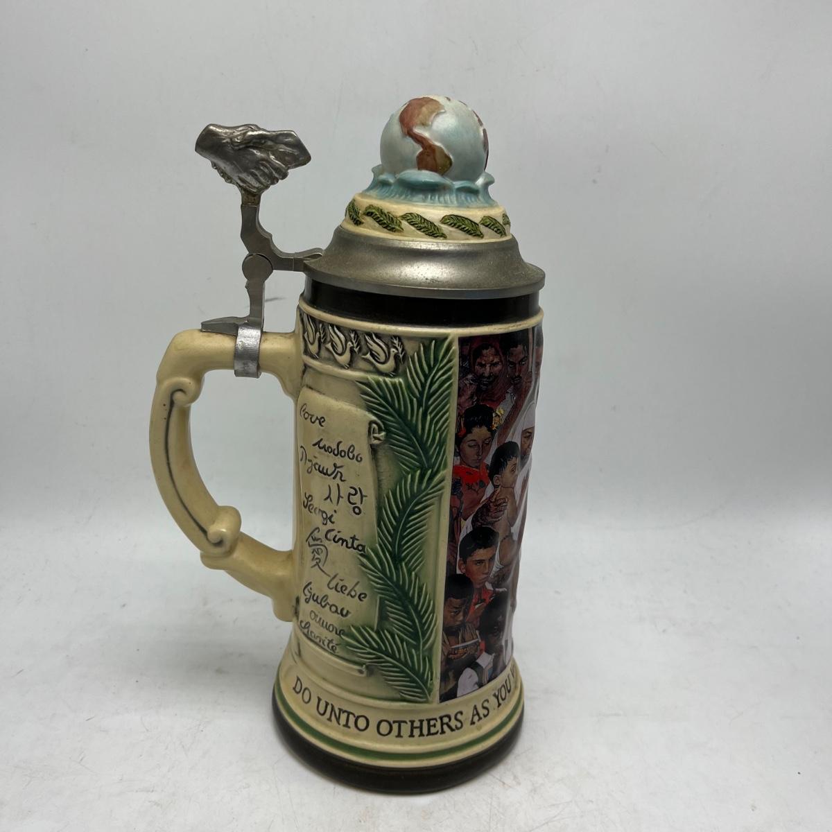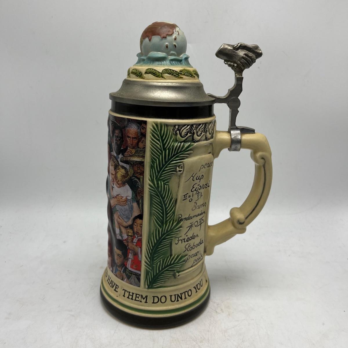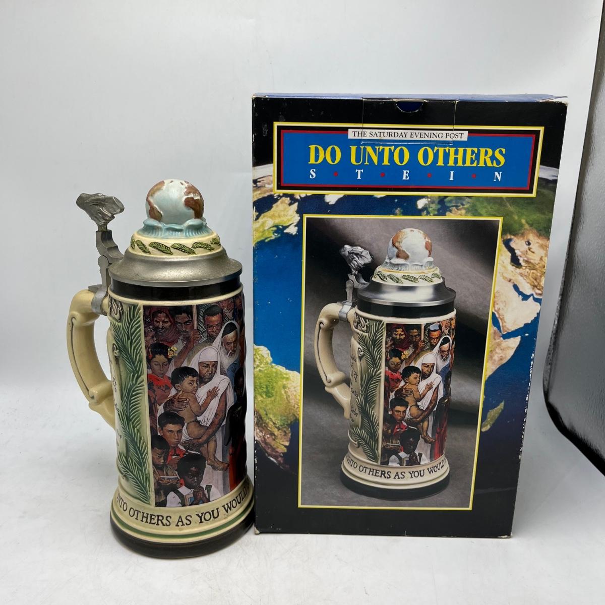 Lot contains a Norman Rockwell Centennial stein and Do unto Others Stein. Largest stein measures 4.75” x 5” 12.5”.