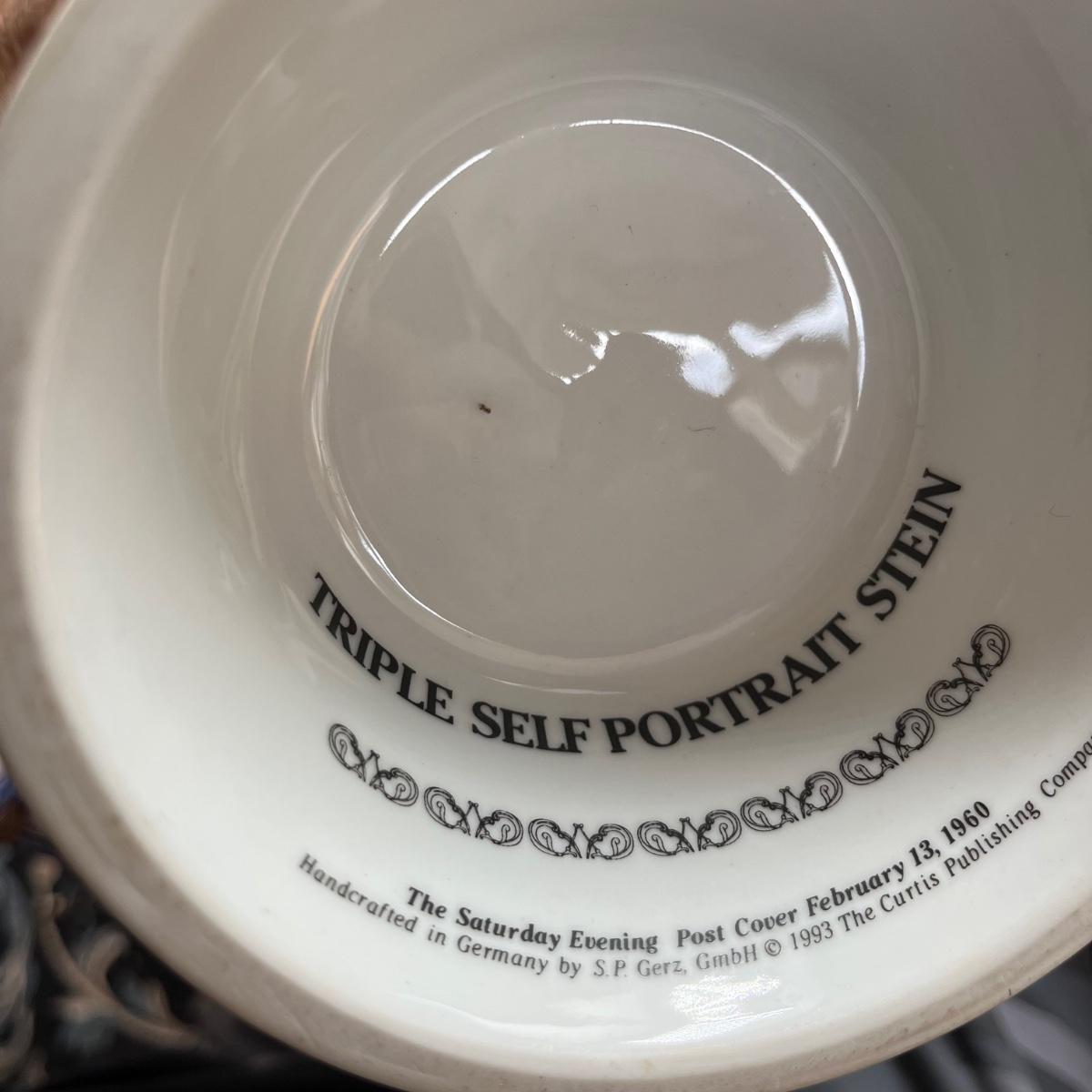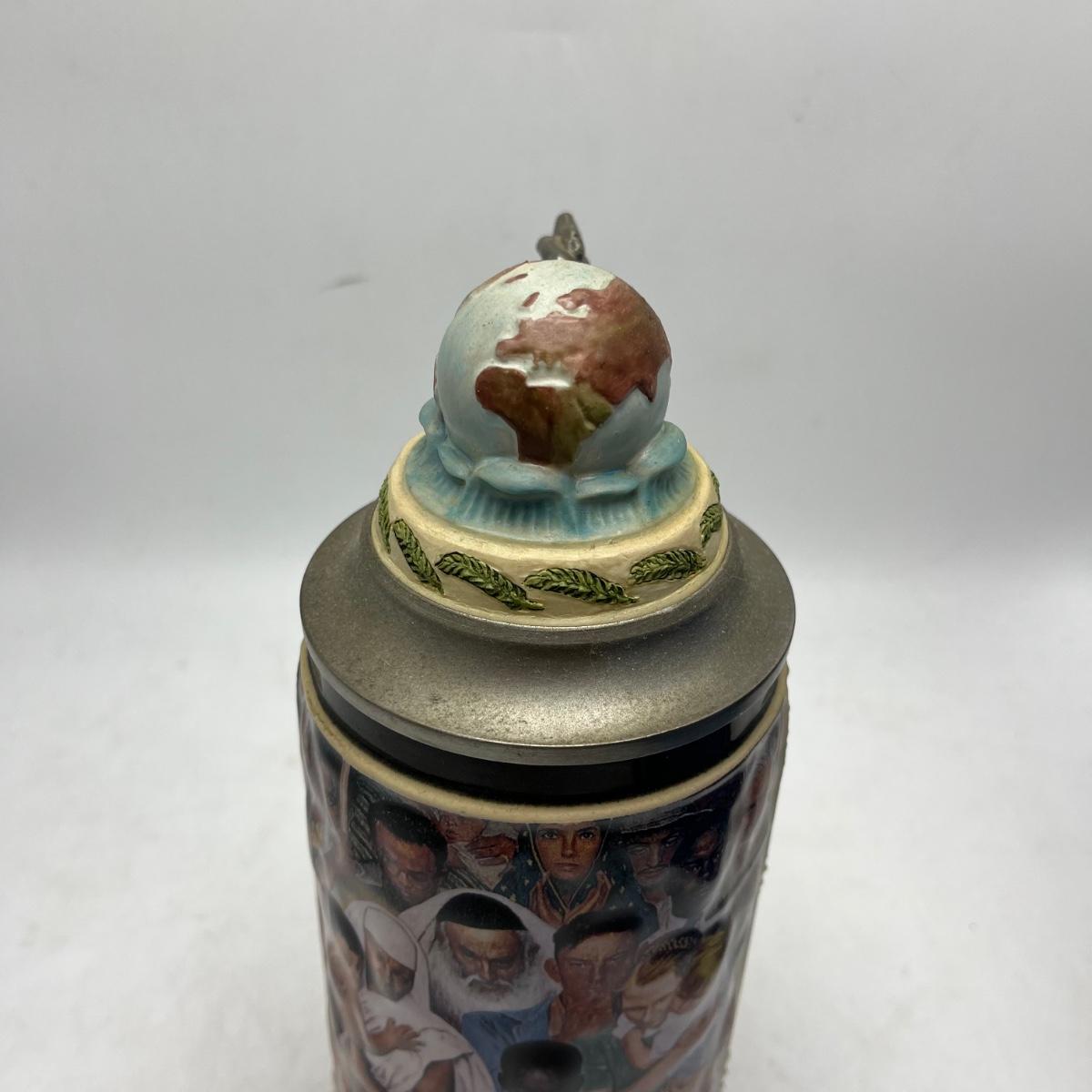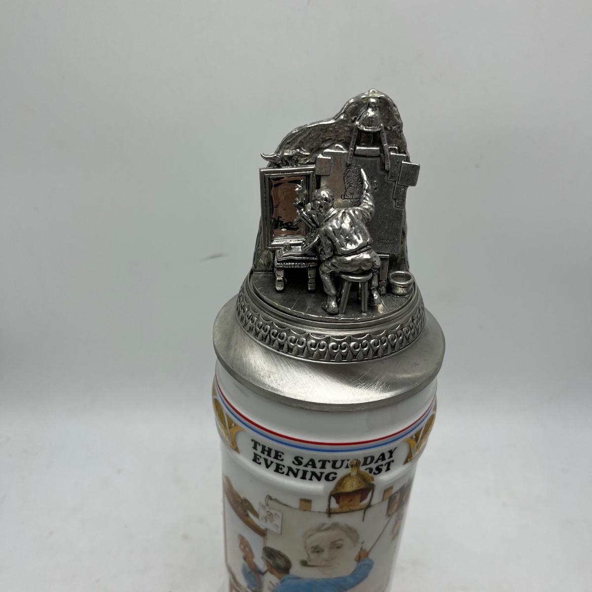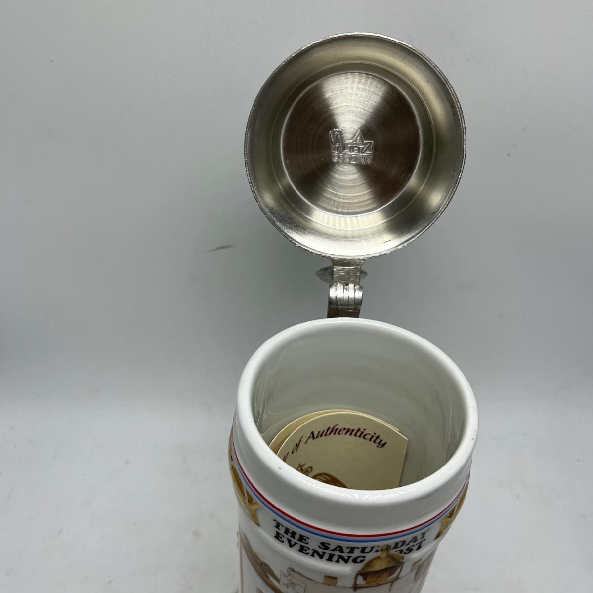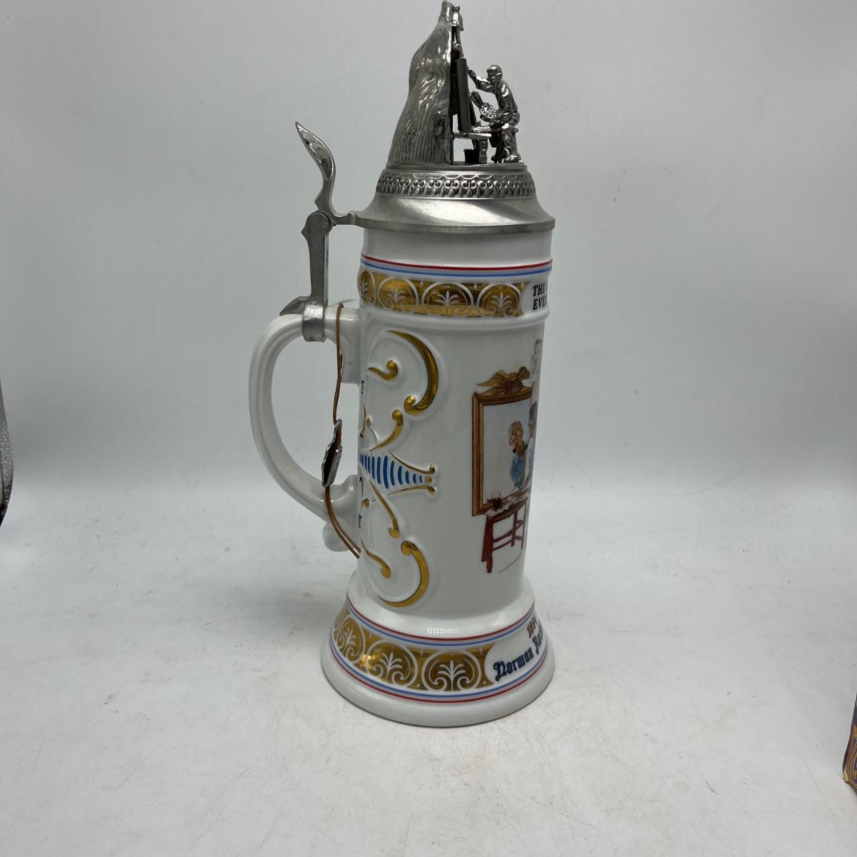 Lot contains a Norman Rockwell Centennial stein and Do unto Others Stein. Largest stein measures 4.75” x 5” 12.5”.