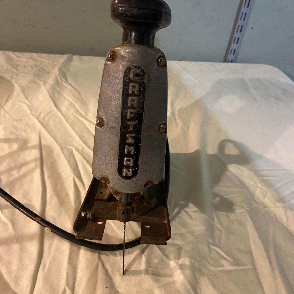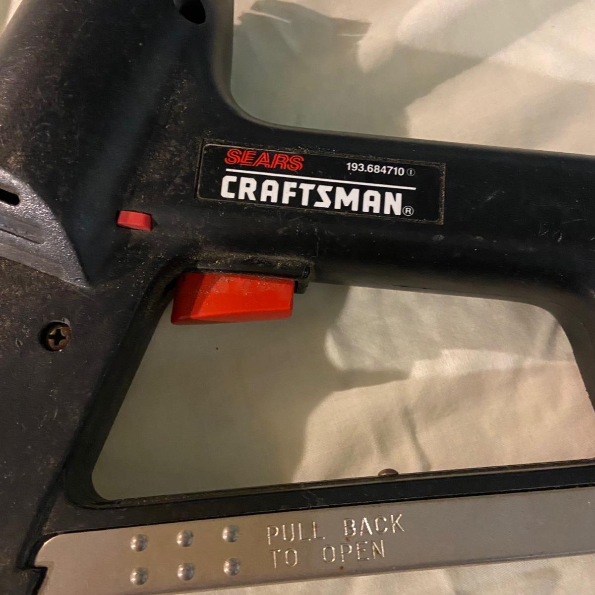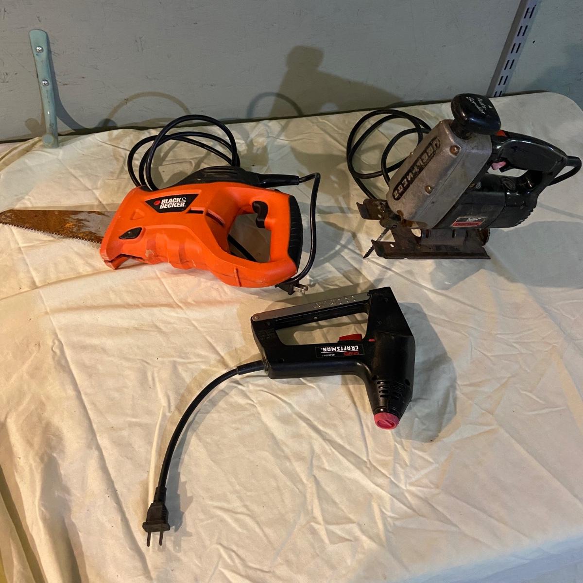 This lot includes a total of three items, all three of which get plugged in and do power on. The first is a ‘SEARS Craftsman’ staple gun. The gun itself is about 7.5” long. The second is a ‘Black and Decker’ sable saw that measures 18” long. The last item is a ‘SEARS Craftsman’ handheld scroll saw. This saw is approximately 9” long. Shipping available. Shipping can be costly. We suggest contacting our preferred local shipping provider, Postage Express, with dimensions and getting an estimate before bidding: (828) 255-9250 or shipping@postageexpressnc.com.