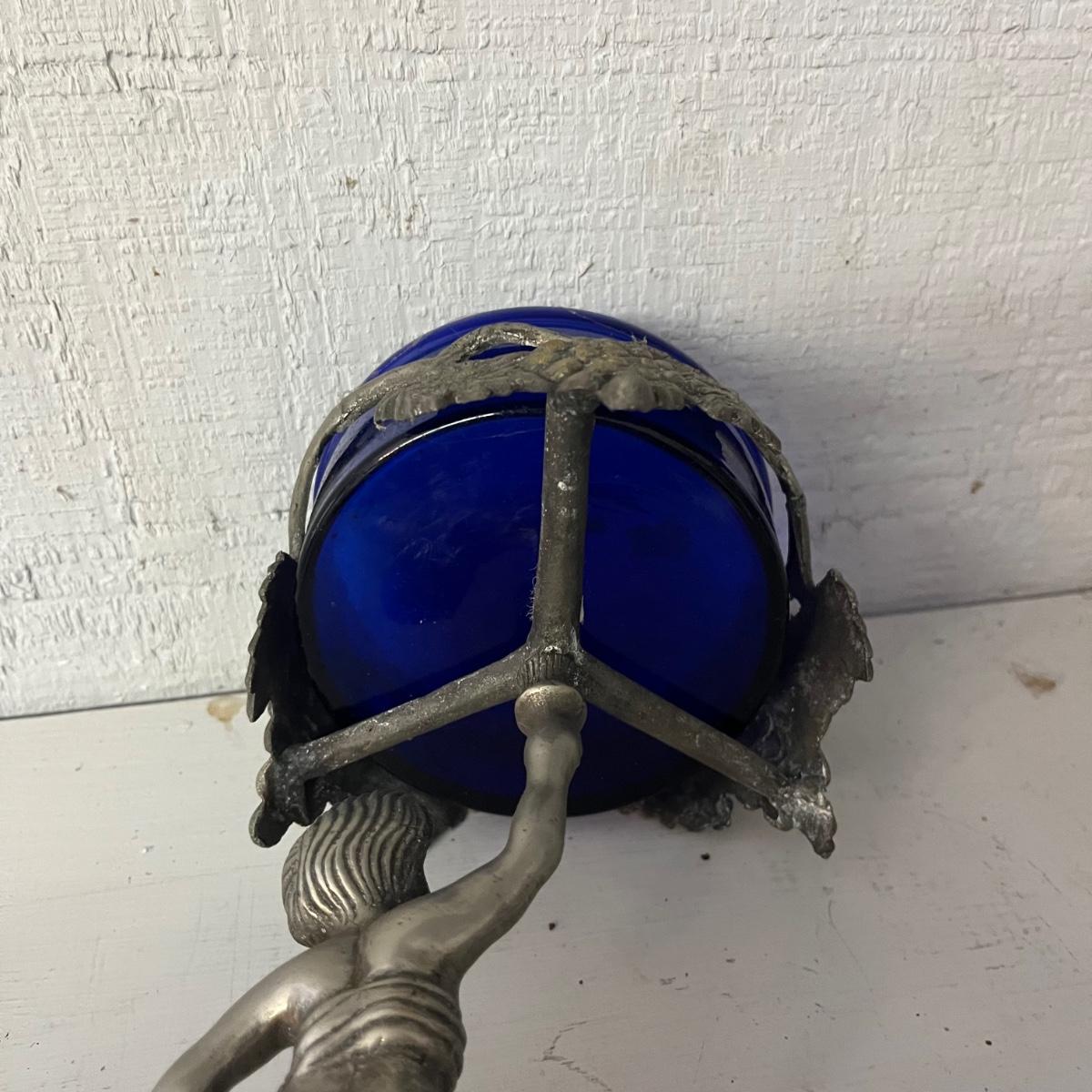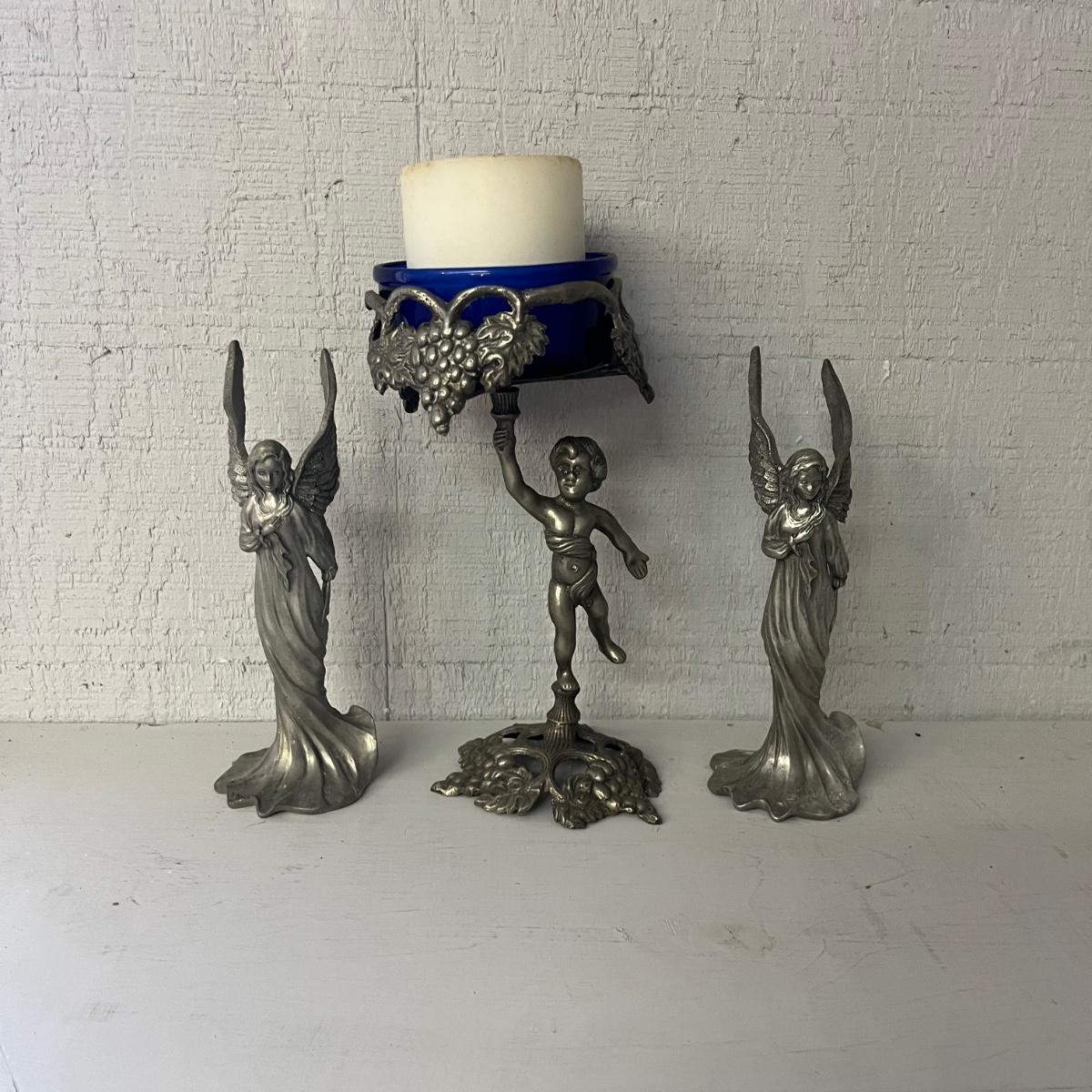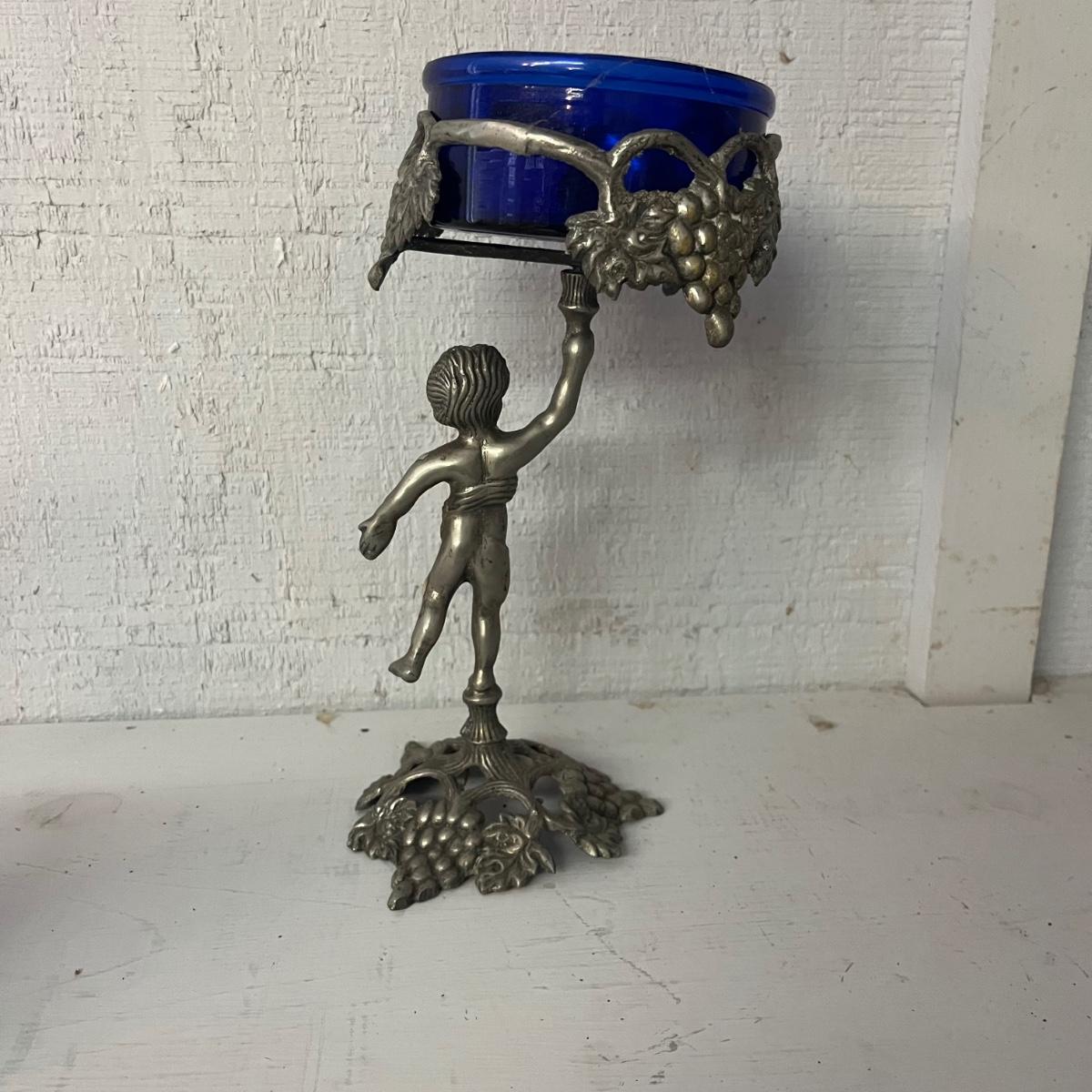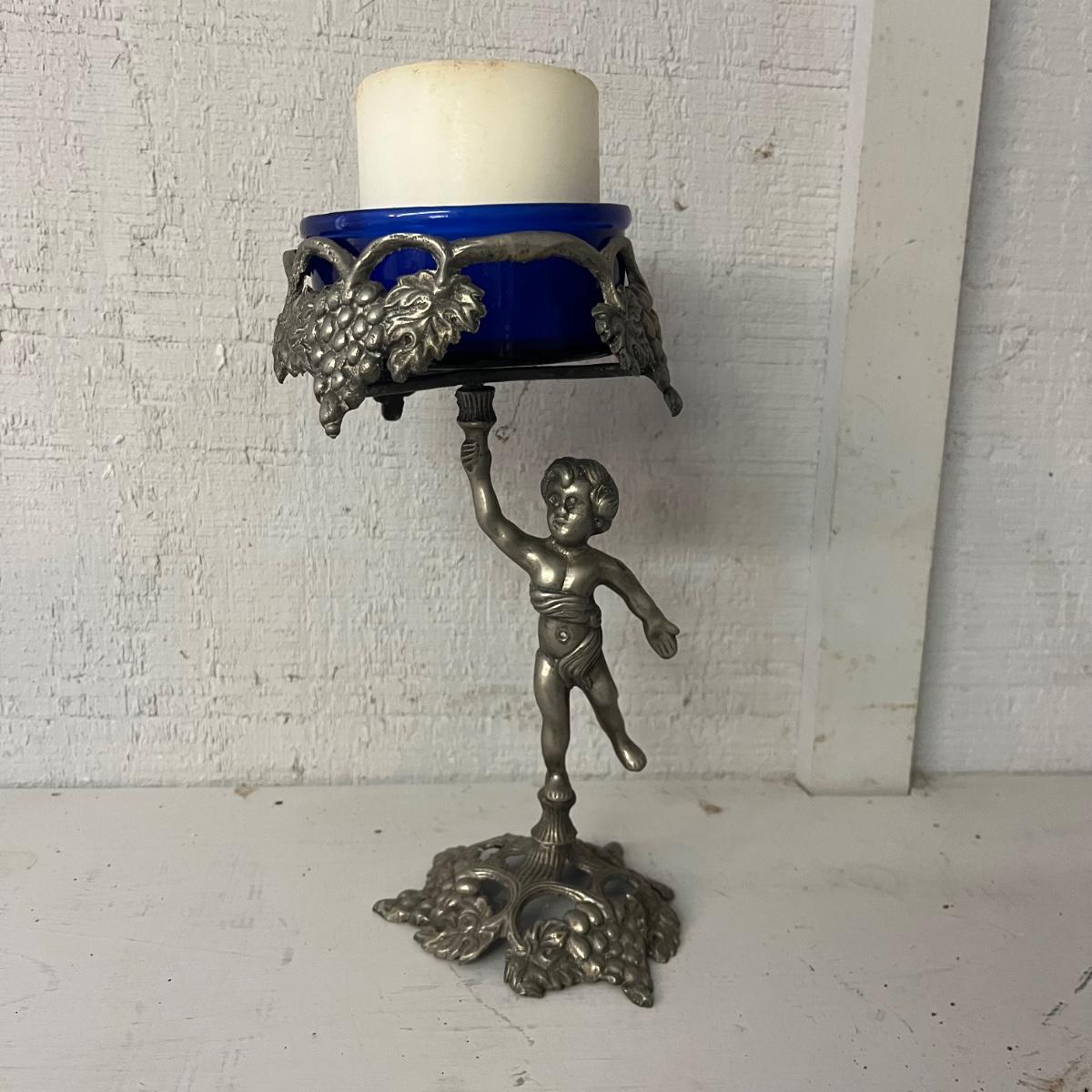 Lot includes a metal candleholder with cobalt blue glass bowl and two Seagull pewter candleholders from Canada that measure 3”D x 8”H.