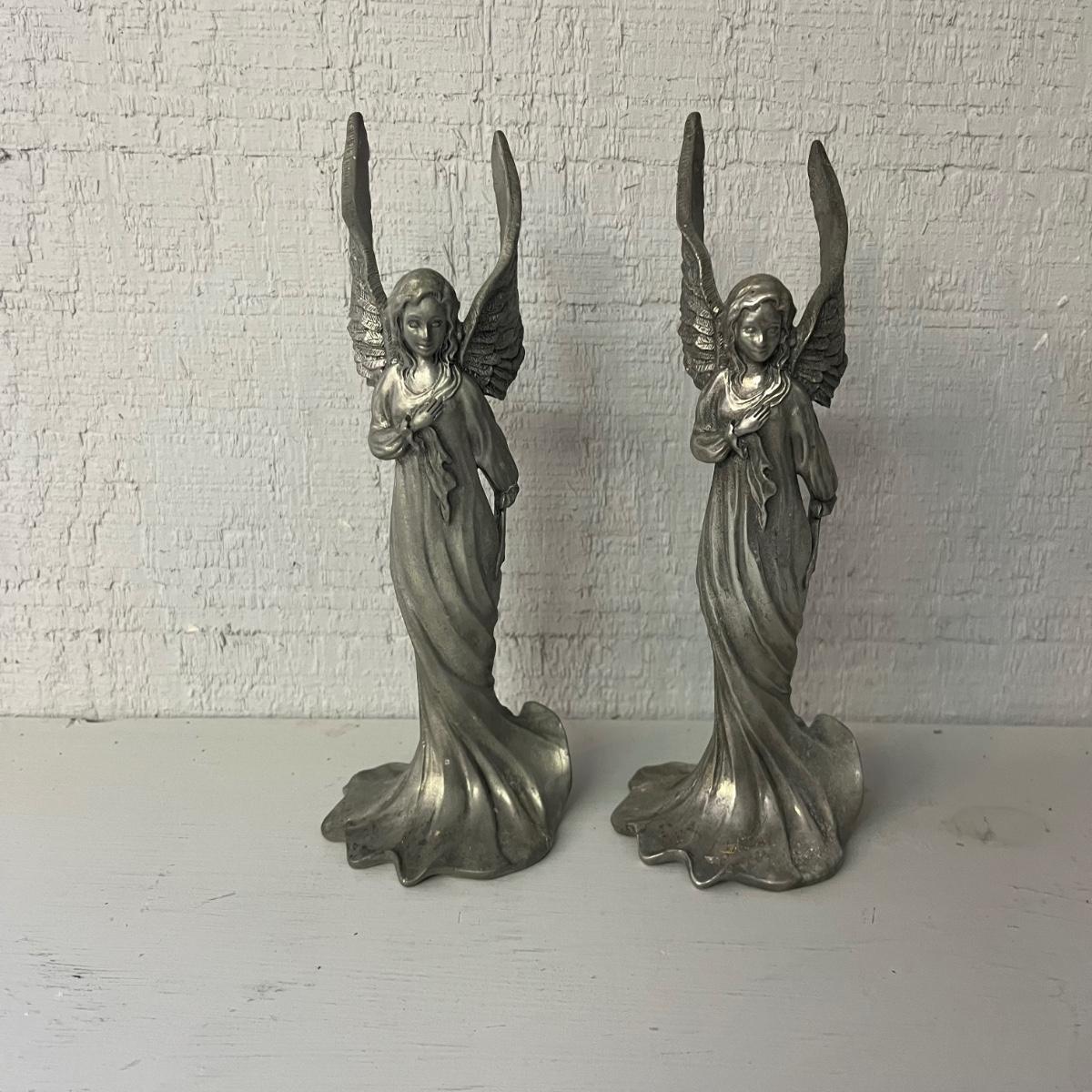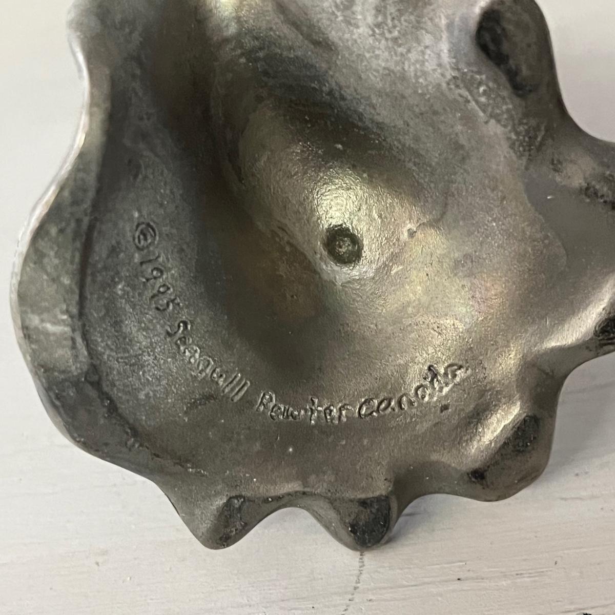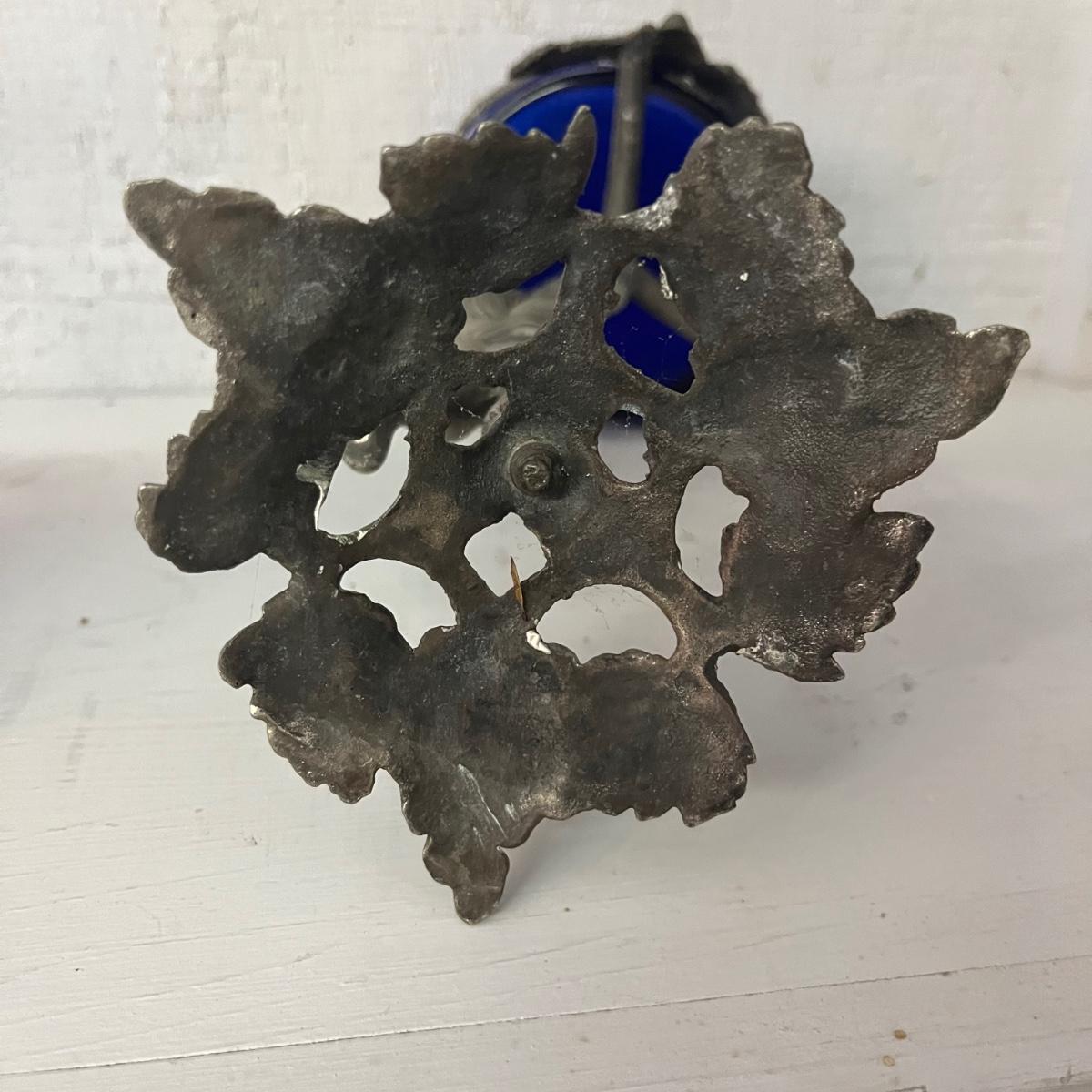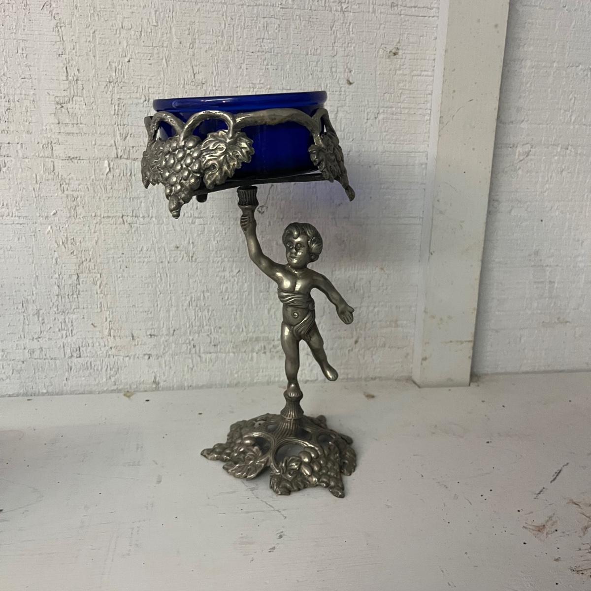 Lot includes a metal candleholder with cobalt blue glass bowl and two Seagull pewter candleholders from Canada that measure 3”D x 8”H.