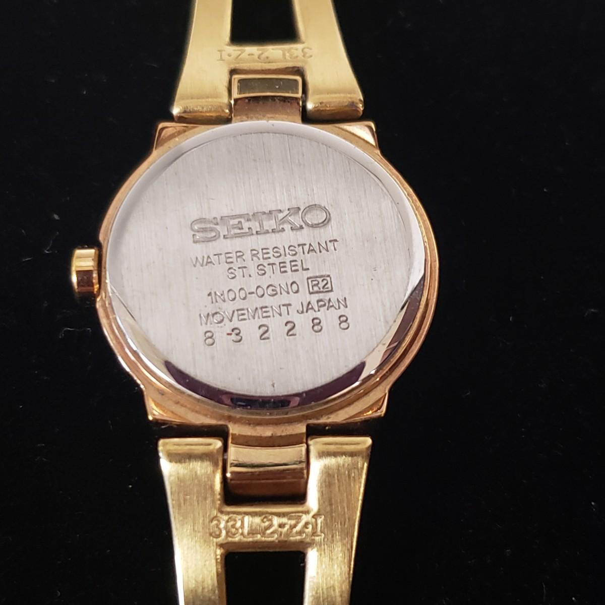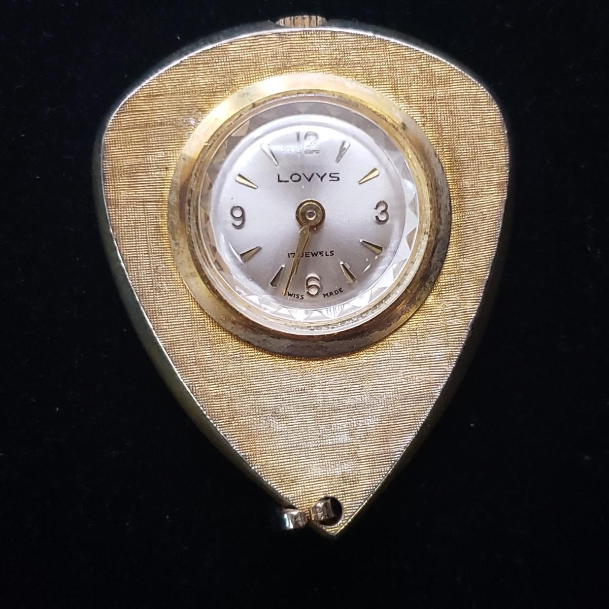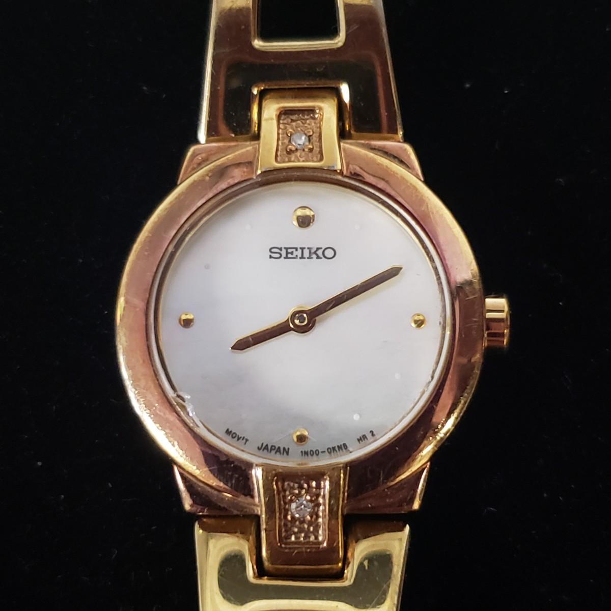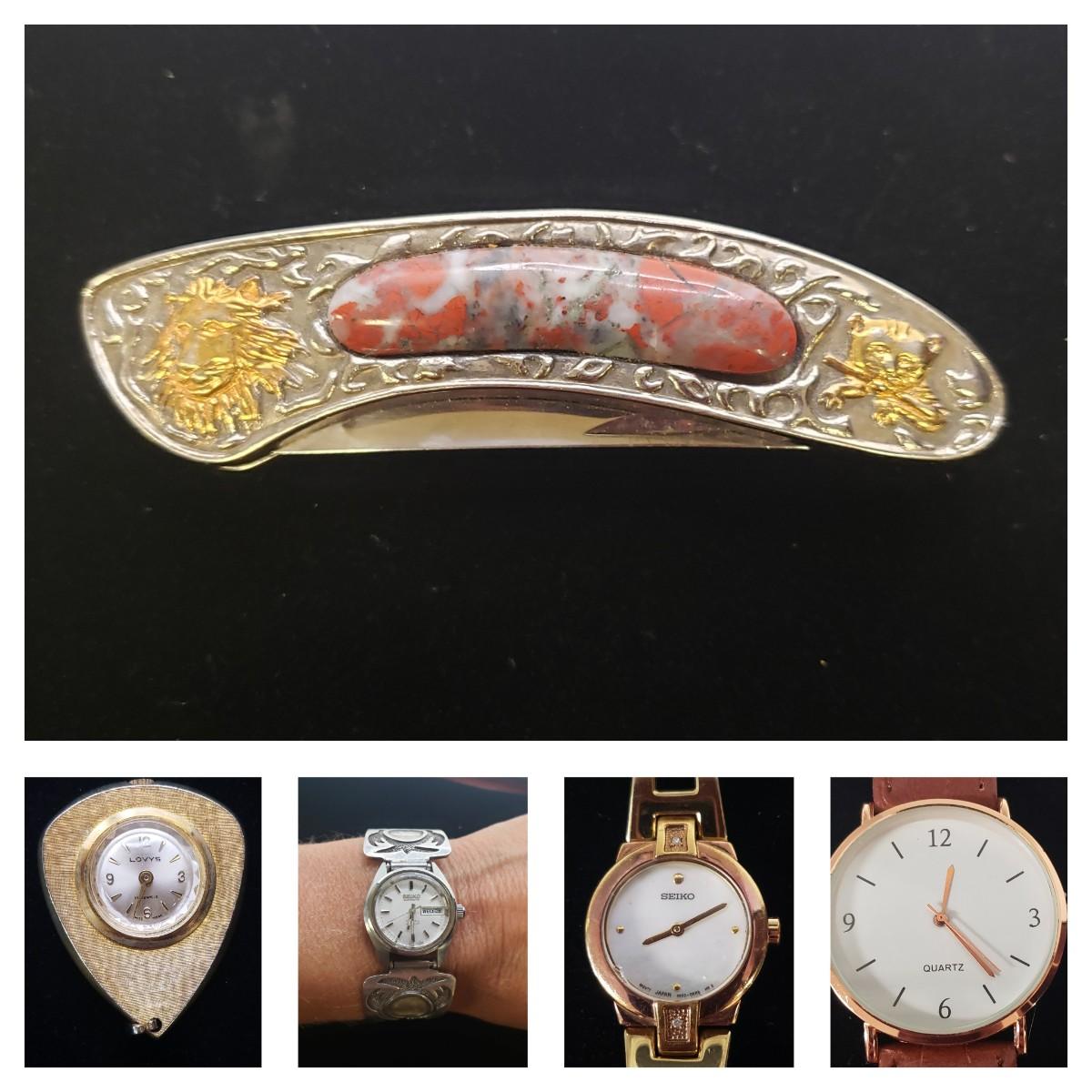 This five-piece lot will get you there on time! There are two very different Seiko watches, one in a gold color (7") with a mother of pearl face and the silver colored one has an STC band in a silver tone with a Southwest style. The quartz watch with a faux leather band does not have any other markings. The Lovys 17 Jewels watch pendant has an etched feel with a floral pattern on the back. This pendant is ticking away! It is a wind up, but it was not tested for accuracy. The decorative knife measures 3" folded, blade is 2.5" long. It has a stone inlay on both sides, as well as gold-colored animals at each corner.