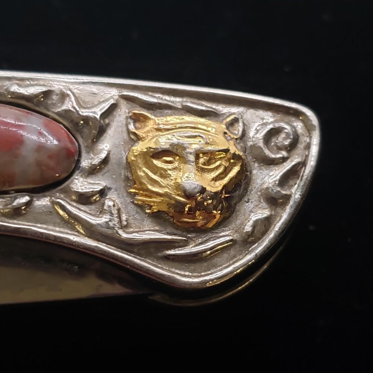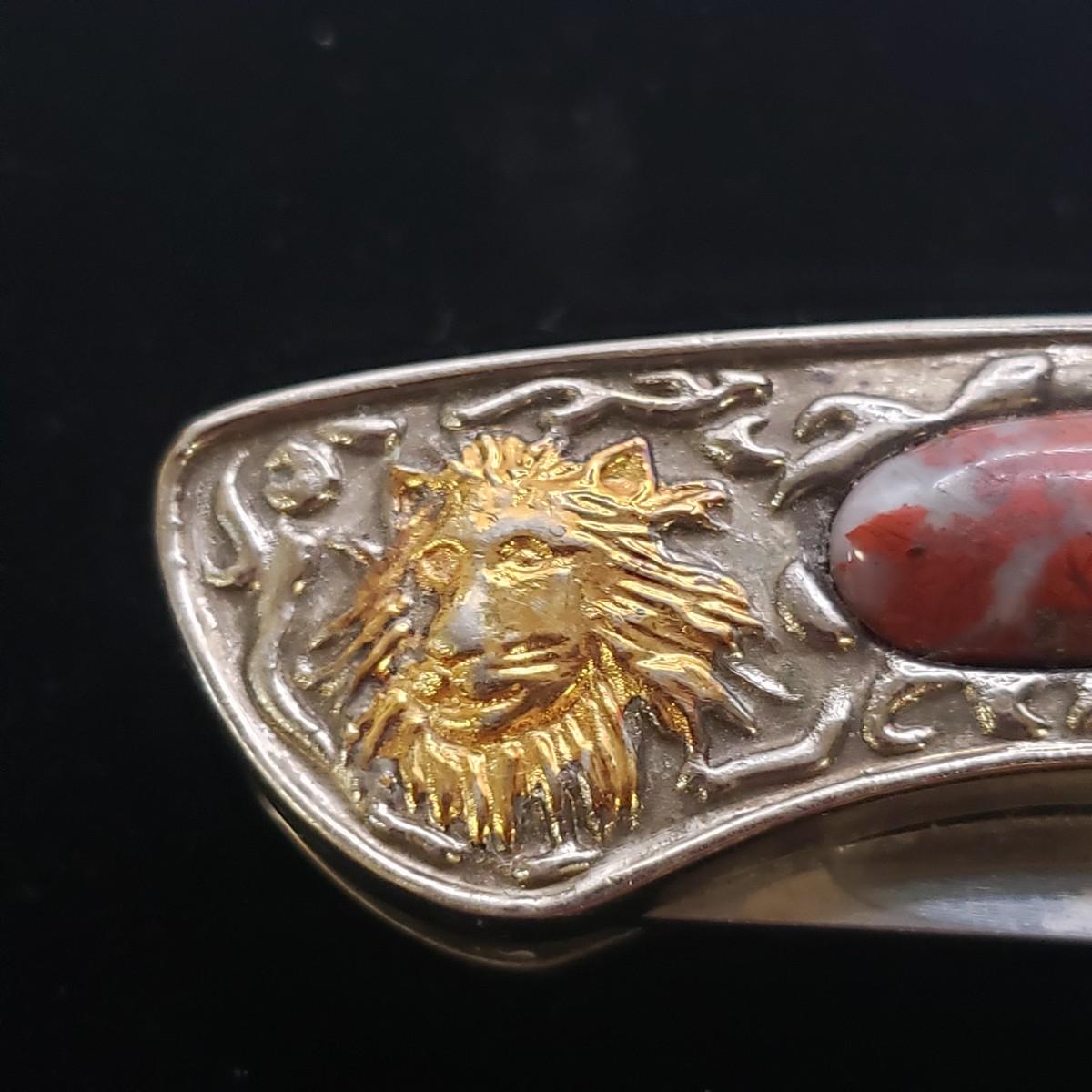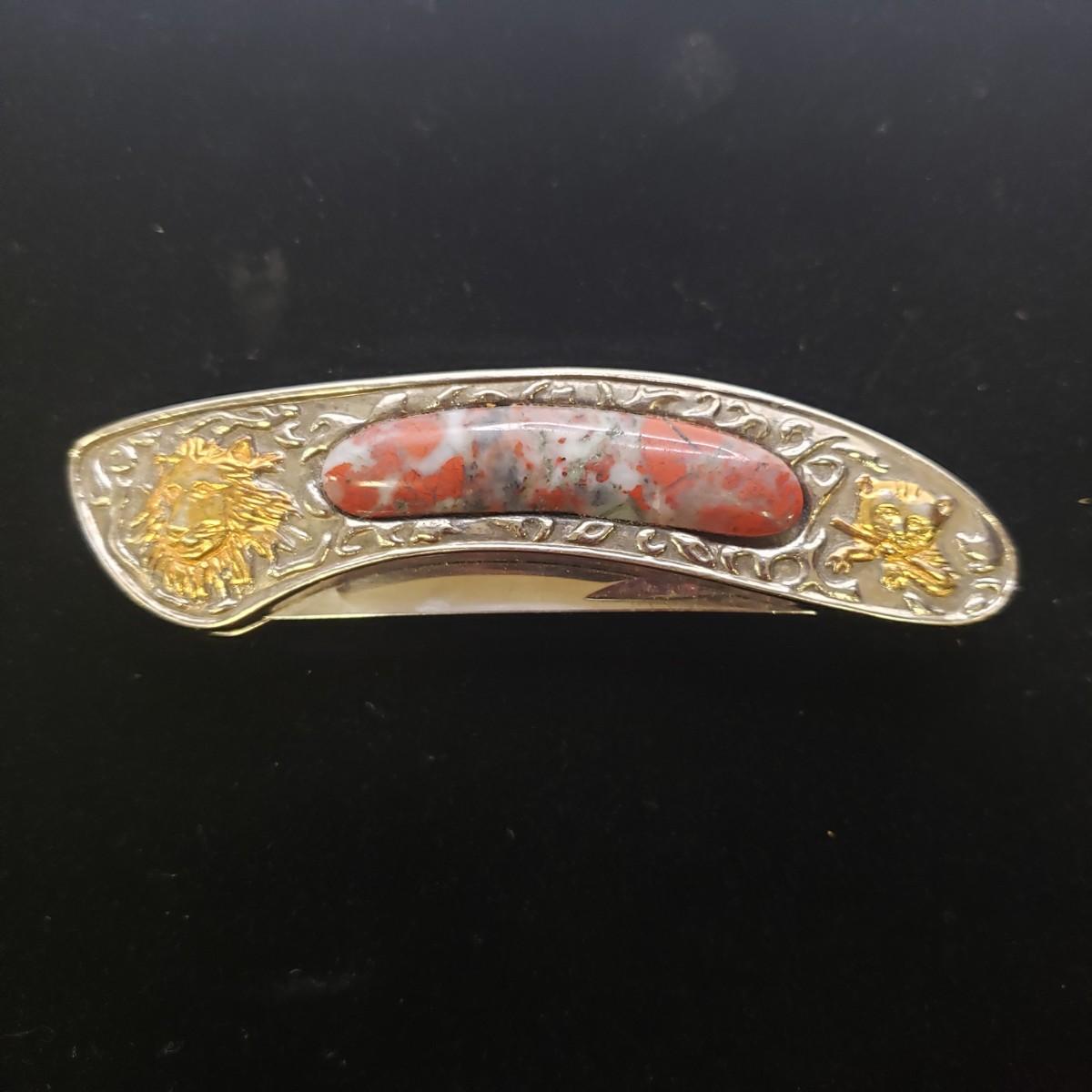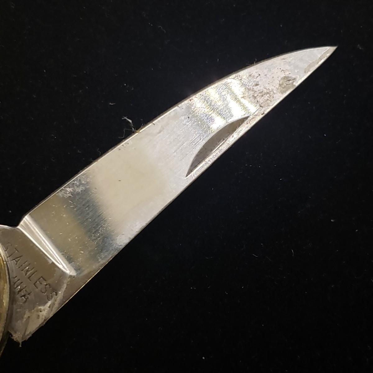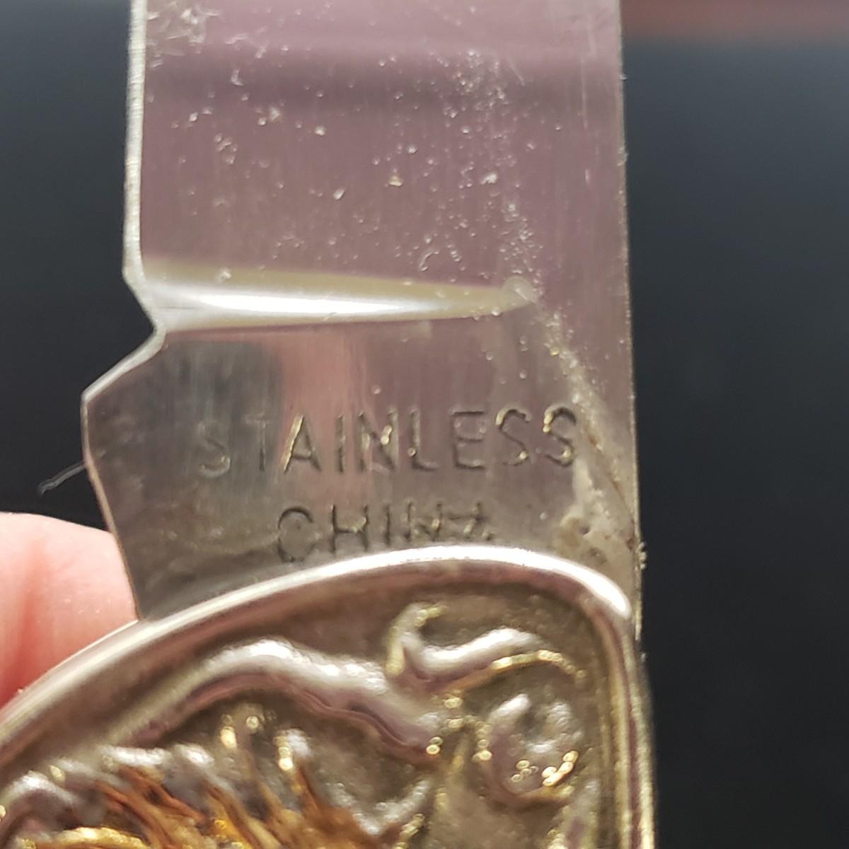This five-piece lot will get you there on time! There are two very different Seiko watches, one in a gold color (7") with a mother of pearl face and the silver colored one has an STC band in a silver tone with a Southwest style. The quartz watch with a faux leather band does not have any other markings. The Lovys 17 Jewels watch pendant has an etched feel with a floral pattern on the back. This pendant is ticking away! It is a wind up, but it was not tested for accuracy. The decorative knife measures 3" folded, blade is 2.5" long. It has a stone inlay on both sides, as well as gold-colored animals at each corner.
