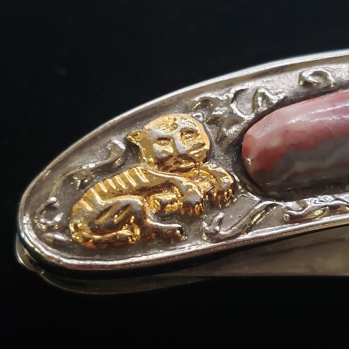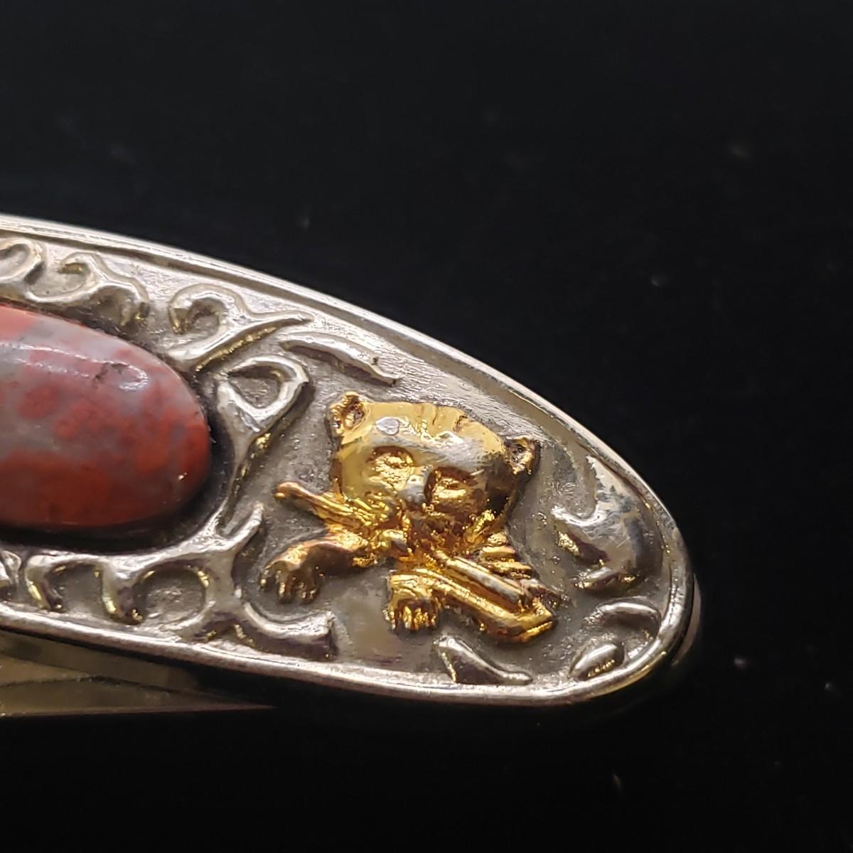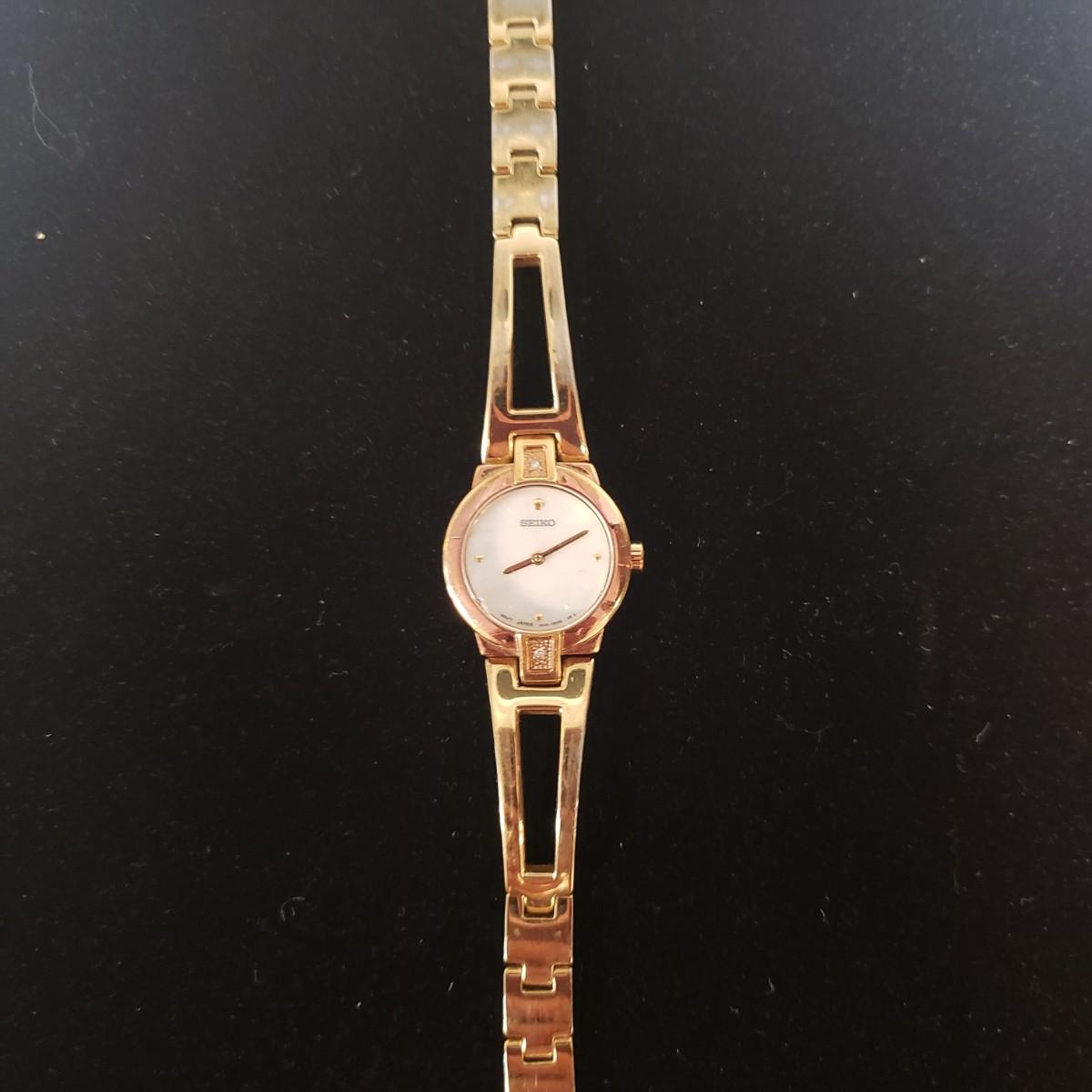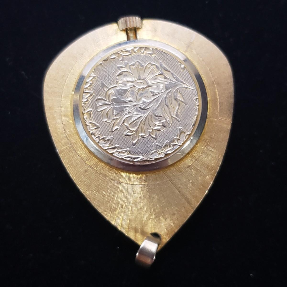 This five-piece lot will get you there on time! There are two very different Seiko watches, one in a gold color (7") with a mother of pearl face and the silver colored one has an STC band in a silver tone with a Southwest style. The quartz watch with a faux leather band does not have any other markings. The Lovys 17 Jewels watch pendant has an etched feel with a floral pattern on the back. This pendant is ticking away! It is a wind up, but it was not tested for accuracy. The decorative knife measures 3" folded, blade is 2.5" long. It has a stone inlay on both sides, as well as gold-colored animals at each corner.