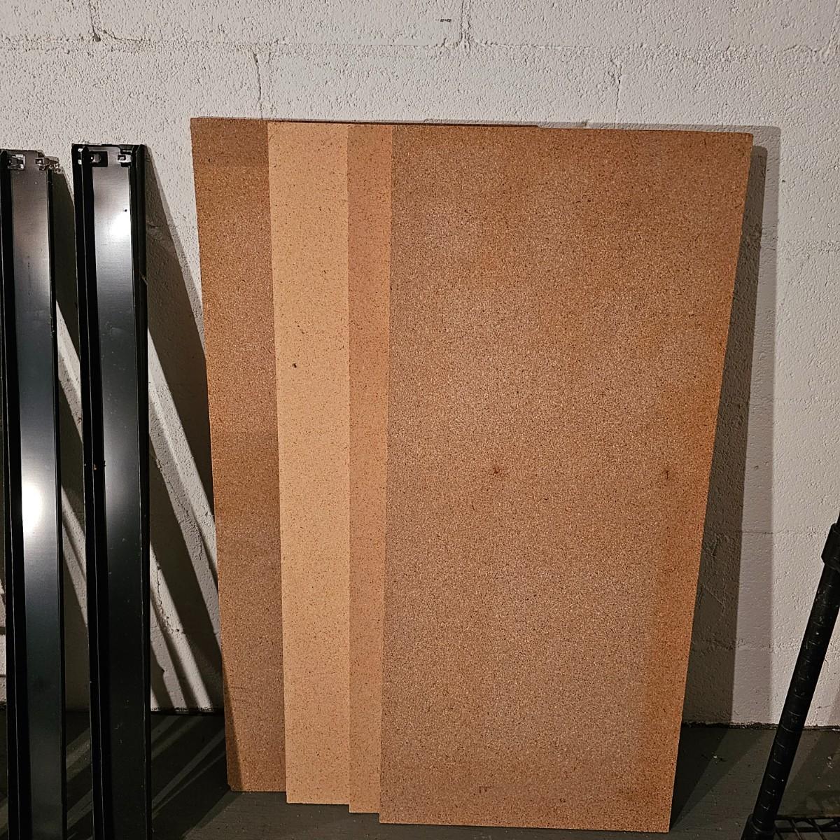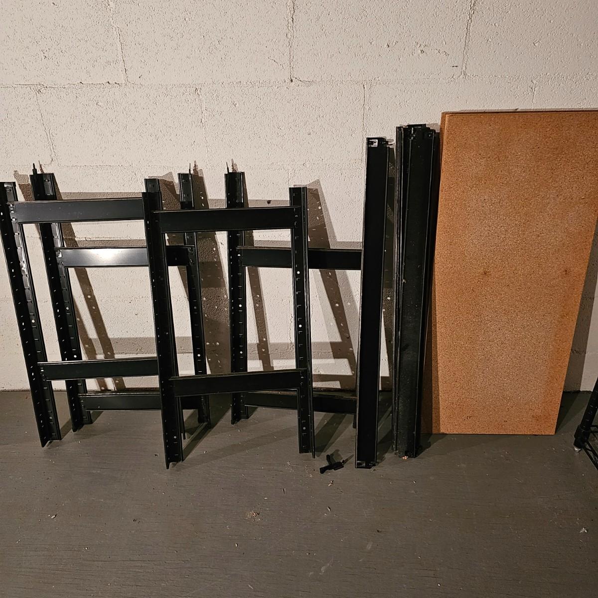 Two different sets of metal storage shelves. Large set has open shelf grid, measures 48" x 18" x 74"H. Can be disassembled to move. Smaller set is shown broken down and appears to have hardware to put back together , has wood shelf inserts and will measure 36" x 16" x 60"H when set up. See photos for details. Local pickup only.