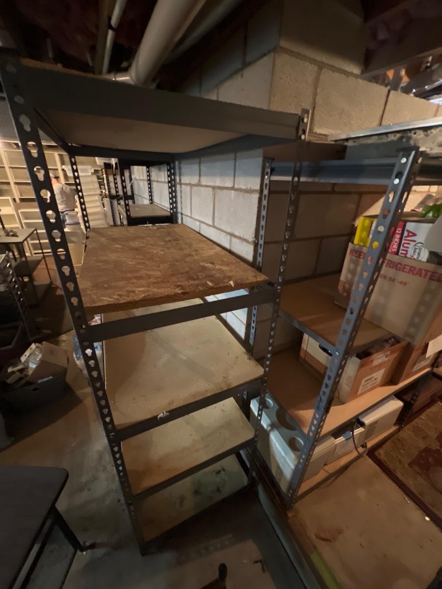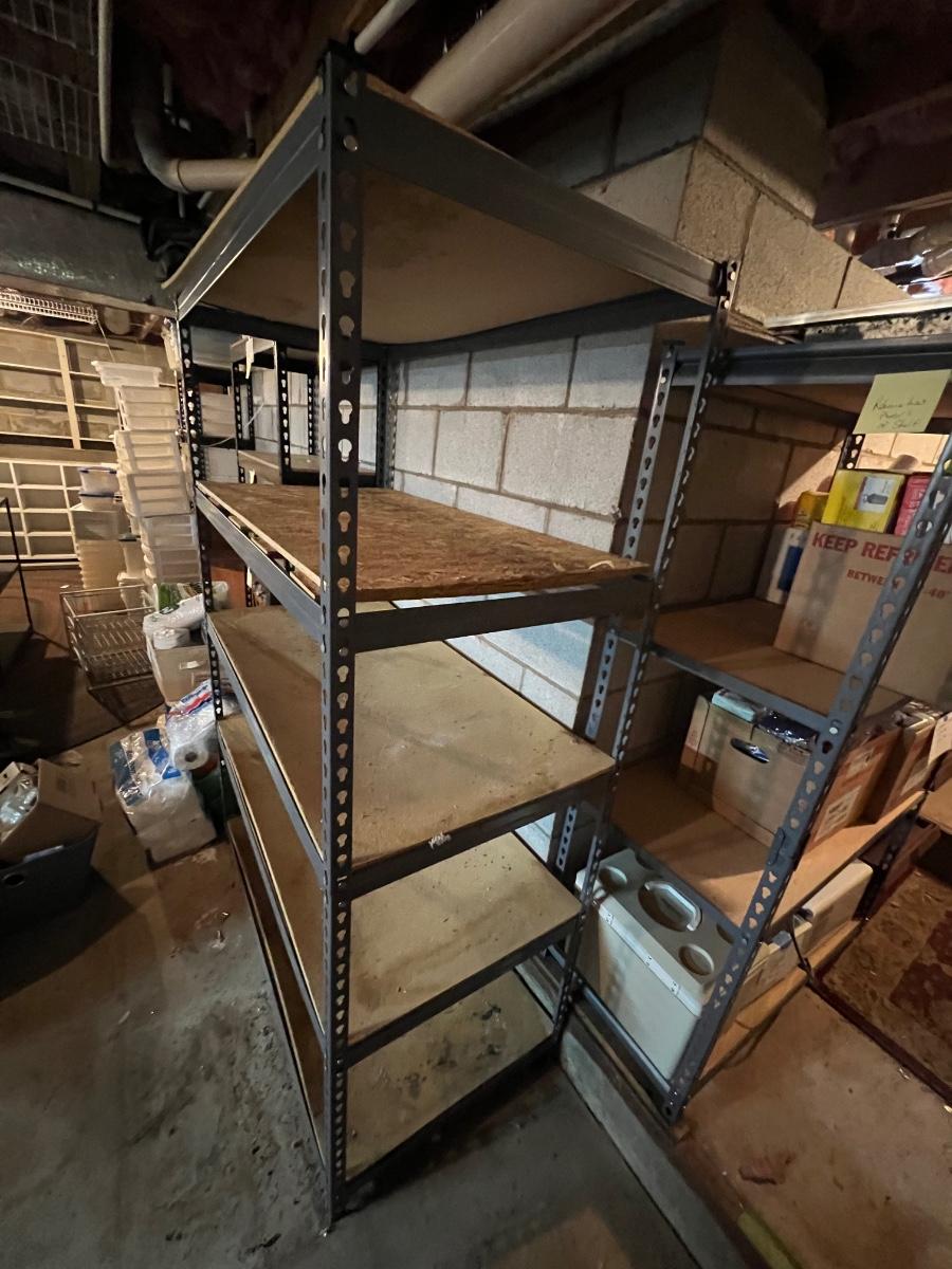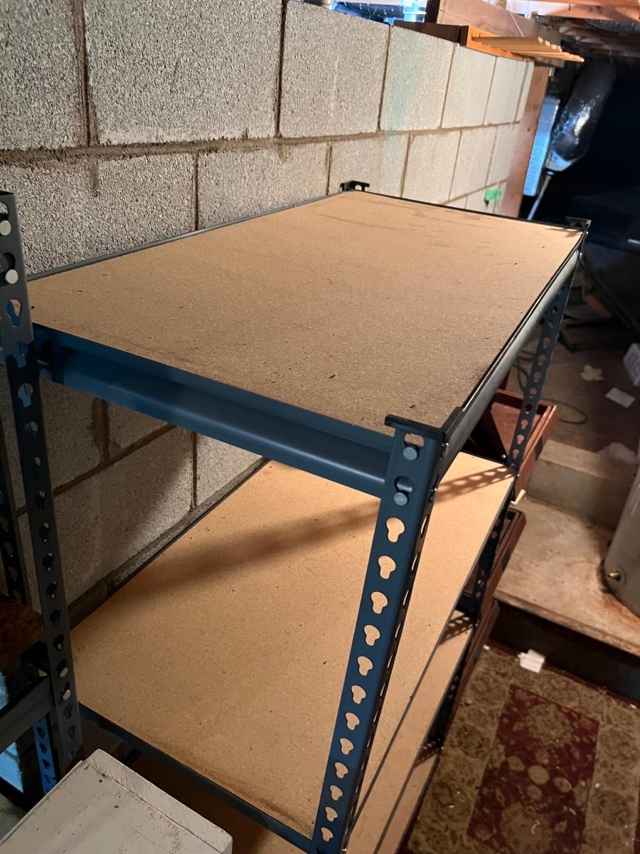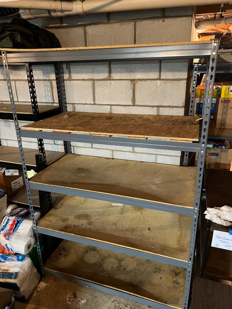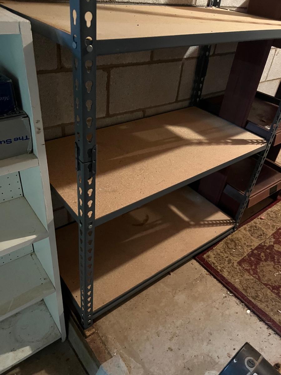 Two sets of durable grey metal shelving units. As you will see from the pics the shelves need replacing on the larger unit and one shelf has already been replaced with a piece of OSB. Larger unit measures 48” x 25” x 72”H. Smaller unit measures 38” x 18” x 60”H. Winning bidder responsible for breaking down if desired for transport. Bring help to load.