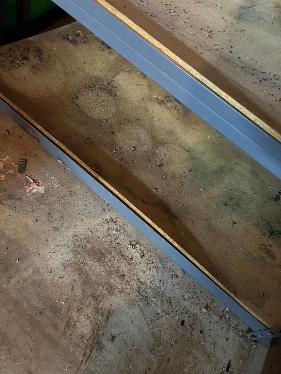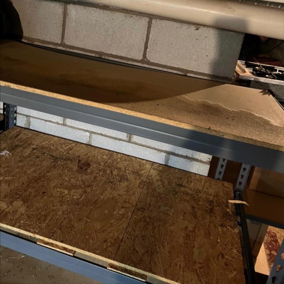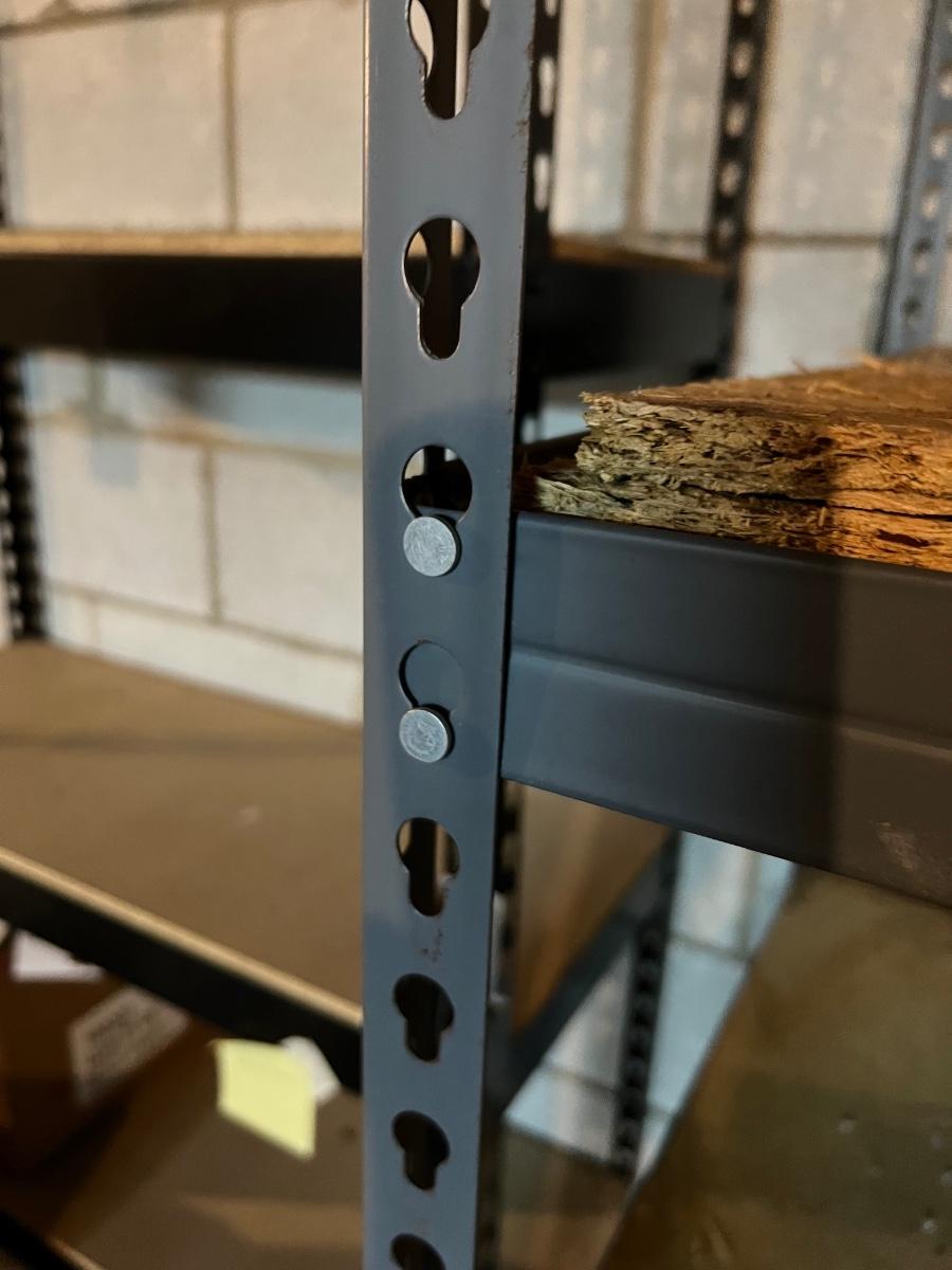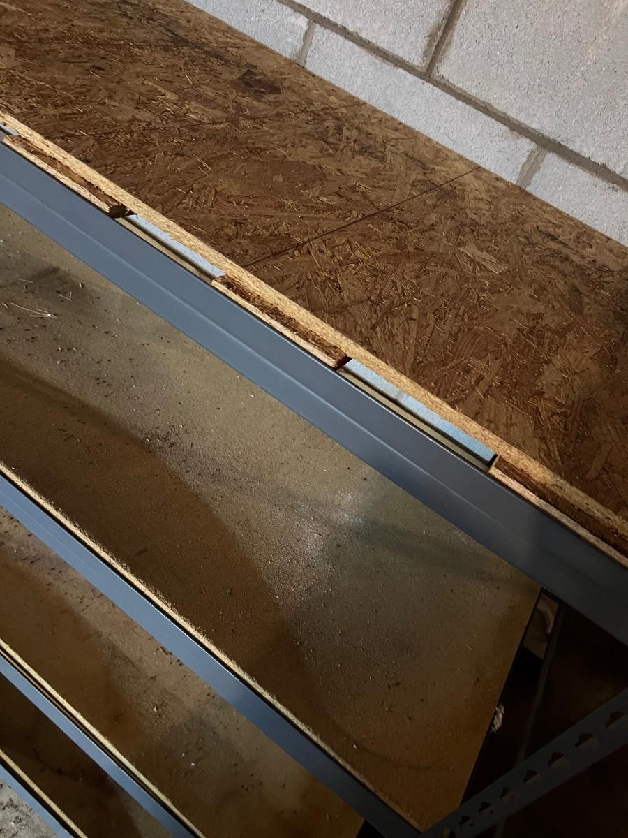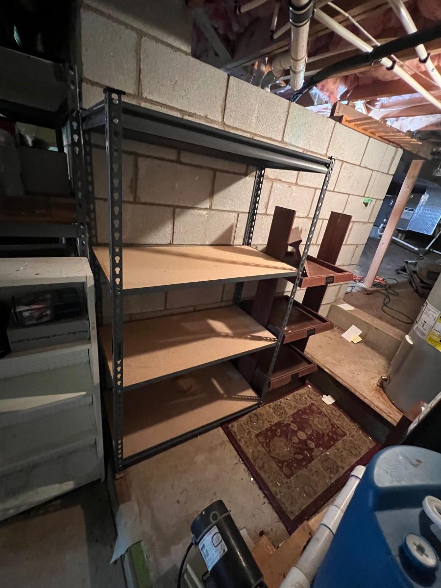 Two sets of durable grey metal shelving units. As you will see from the pics the shelves need replacing on the larger unit and one shelf has already been replaced with a piece of OSB. Larger unit measures 48” x 25” x 72”H. Smaller unit measures 38” x 18” x 60”H. Winning bidder responsible for breaking down if desired for transport. Bring help to load.