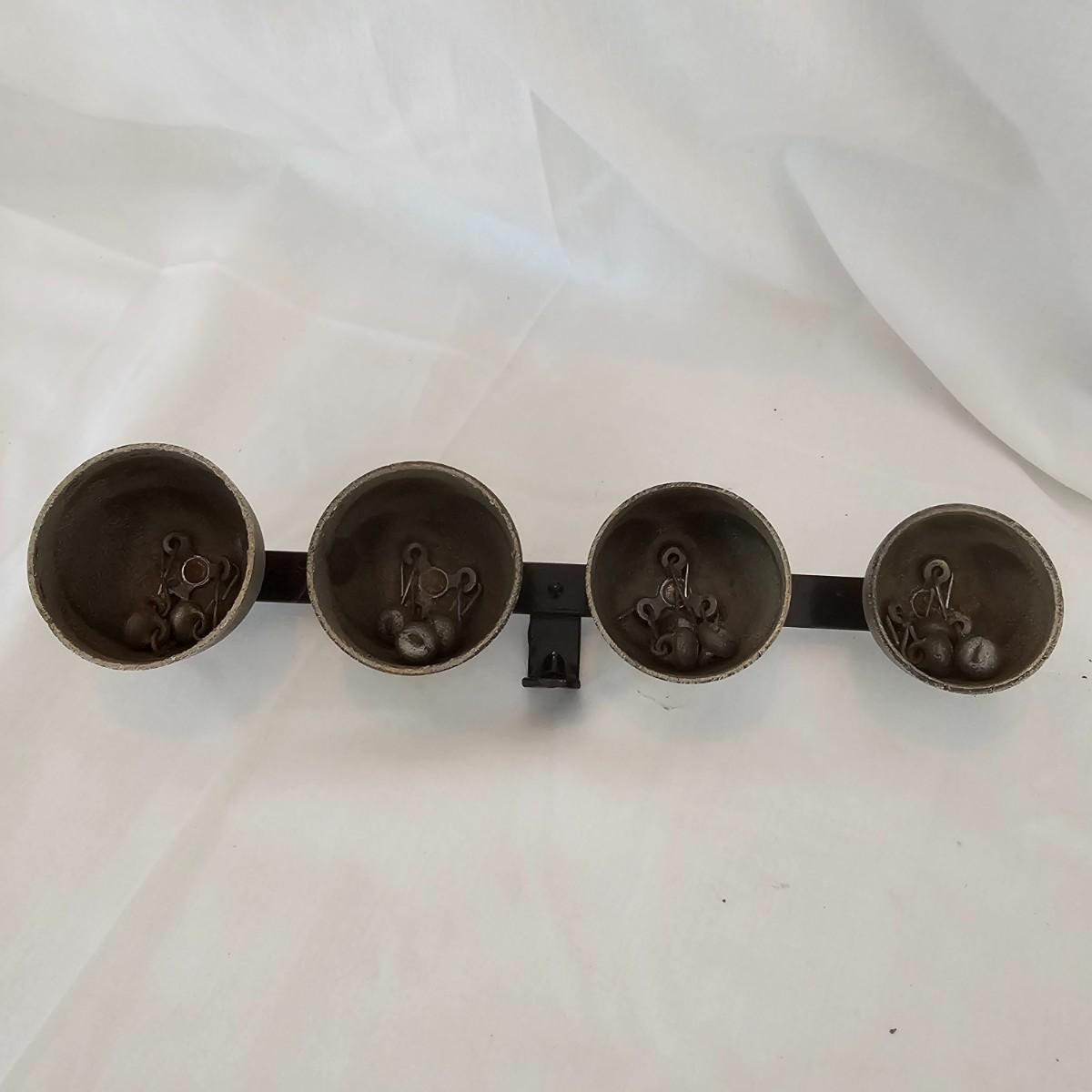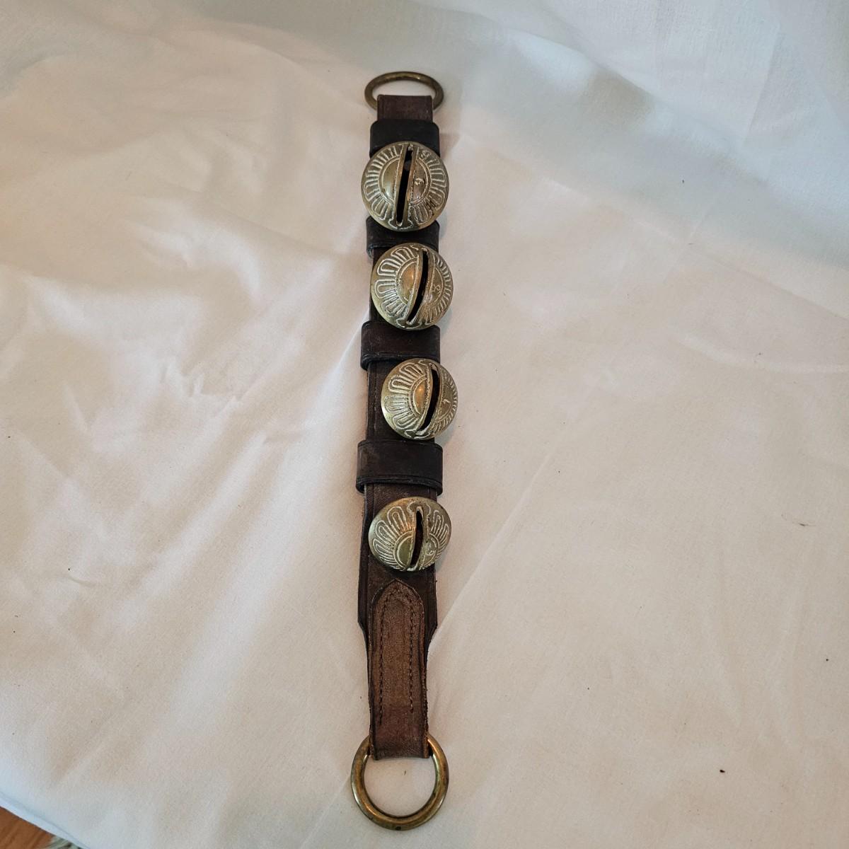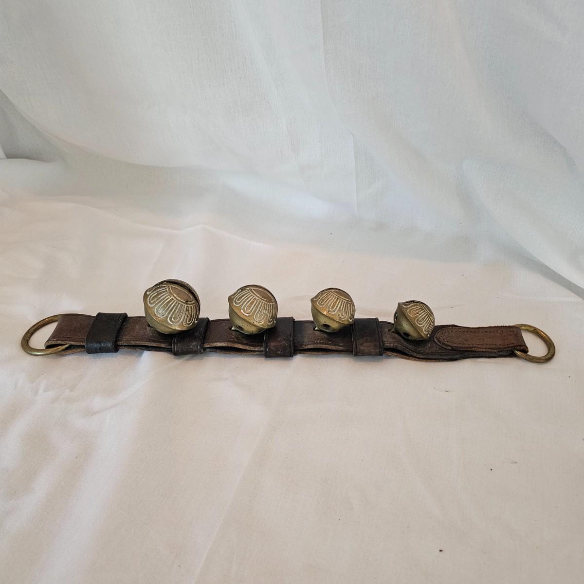 A pair of vintage sleigh bell sets, one a four bell strap and one to mount on a sleigh or other conveyance. Four bell strap has highlighted decorations on bells, single slot in front and round holes in back. Bells are mounted on leather strap which measures 18"L x 2"W x 3"H. Round rings at either end for hanging. Cart or sleigh mount set has a bracket with a graduated set of four Bells. Each bell has a triple clapper for a nice rich tone. Item measures 13"W x 3"D x 3"H. Black frame has mounting holes on either end and on back. Third item has three ornate birds on a string with beads and a single bell at bottom. With hanging ring at top this piece is 5.5" W x 25"L. See photos for details. Shipping available.