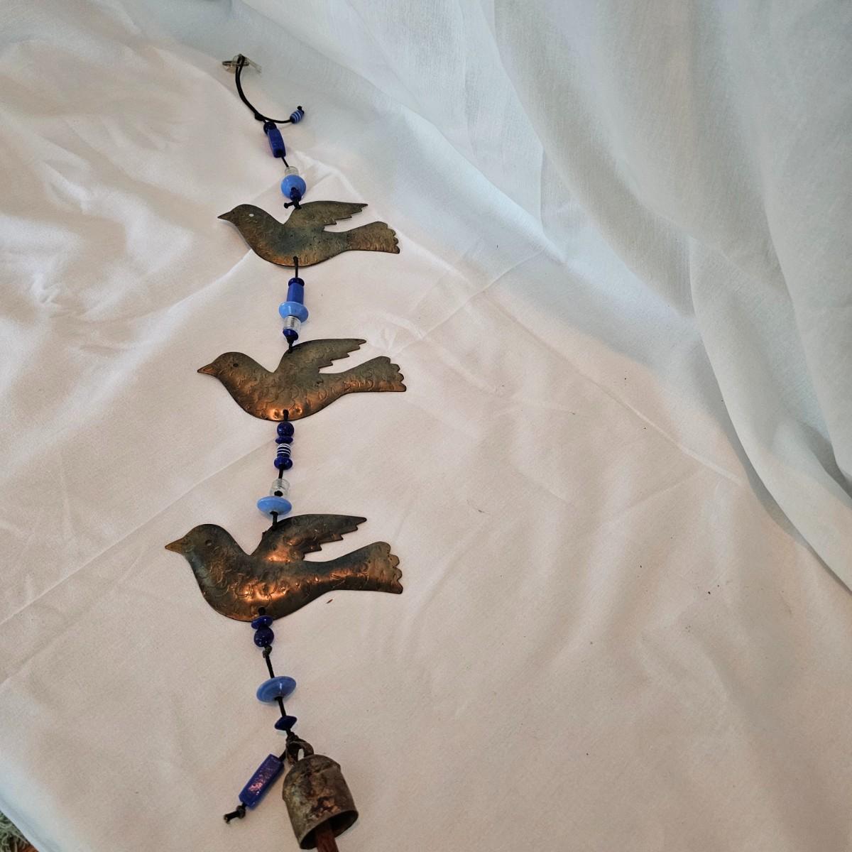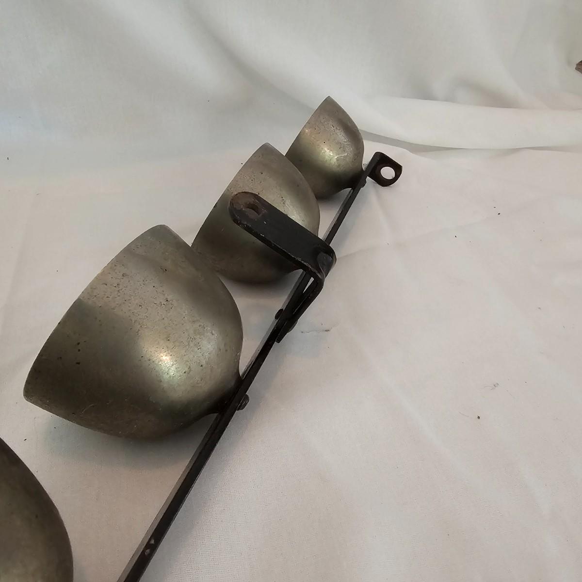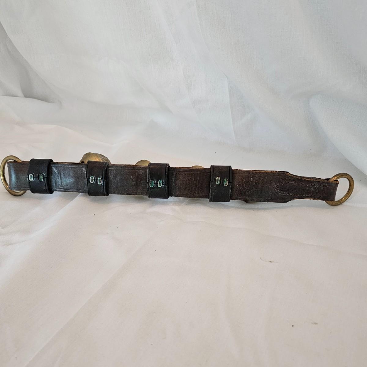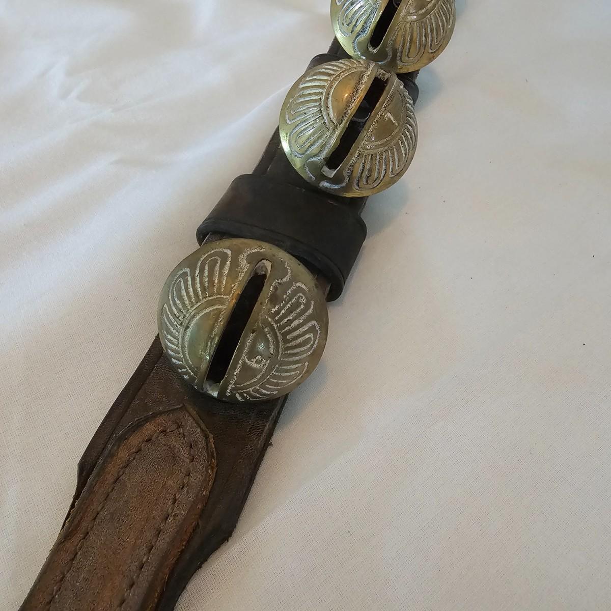 A pair of vintage sleigh bell sets, one a four bell strap and one to mount on a sleigh or other conveyance. Four bell strap has highlighted decorations on bells, single slot in front and round holes in back. Bells are mounted on leather strap which measures 18"L x 2"W x 3"H. Round rings at either end for hanging. Cart or sleigh mount set has a bracket with a graduated set of four Bells. Each bell has a triple clapper for a nice rich tone. Item measures 13"W x 3"D x 3"H. Black frame has mounting holes on either end and on back. Third item has three ornate birds on a string with beads and a single bell at bottom. With hanging ring at top this piece is 5.5" W x 25"L. See photos for details. Shipping available.