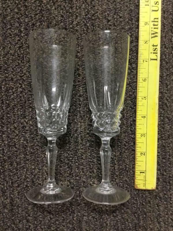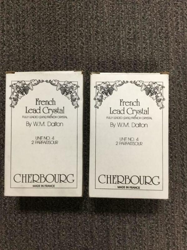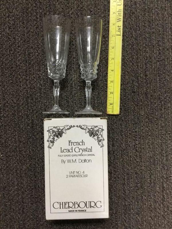 Two sets of Cherbourg Champagne Flutes. 4 glasses total. French lead crystal. Boxed. Good Condition.