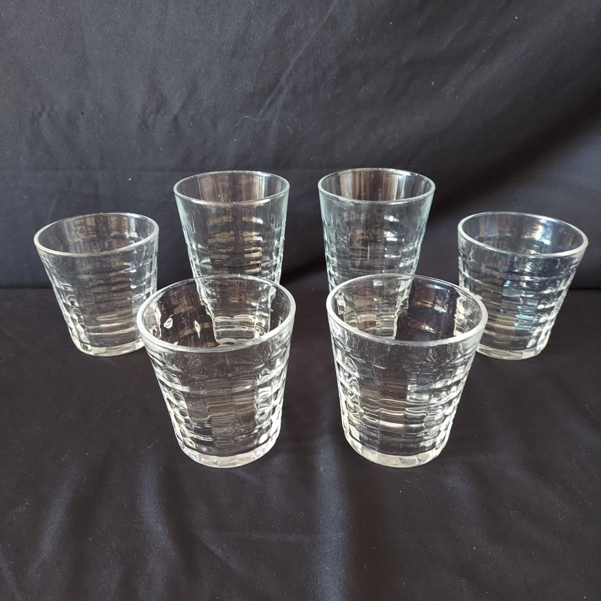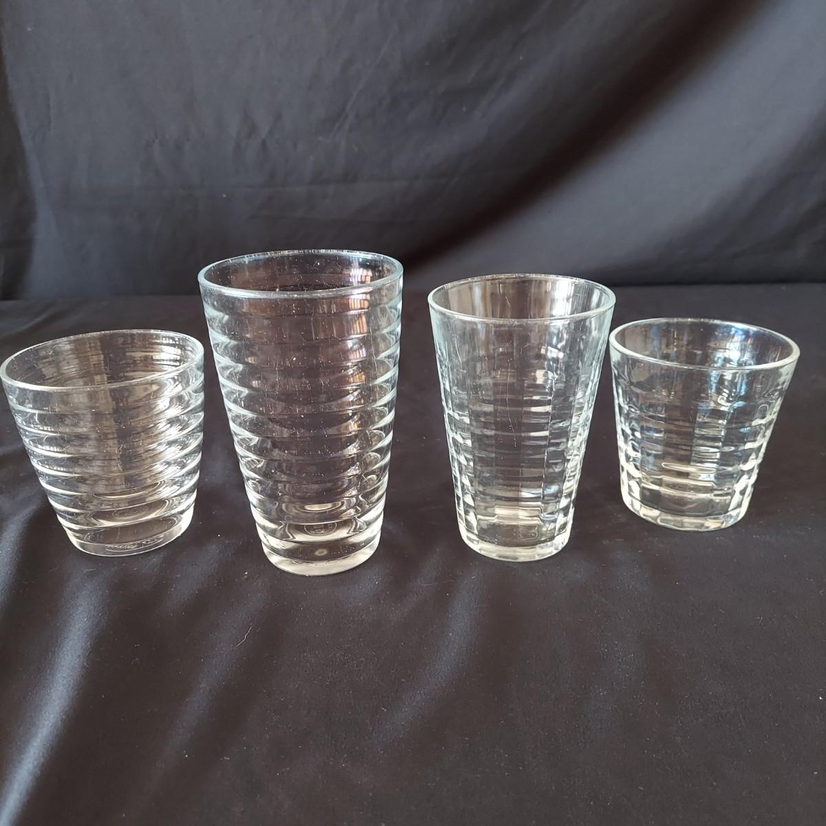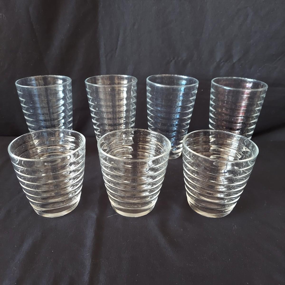 Checkered glasses include two water glasses and four juice glasses. The ribbed set includes four water glasses and three juice glasses. Both sets are marked Duralex on bottom. Glasses have some lights scratches. Please see photos for details. Shipping available