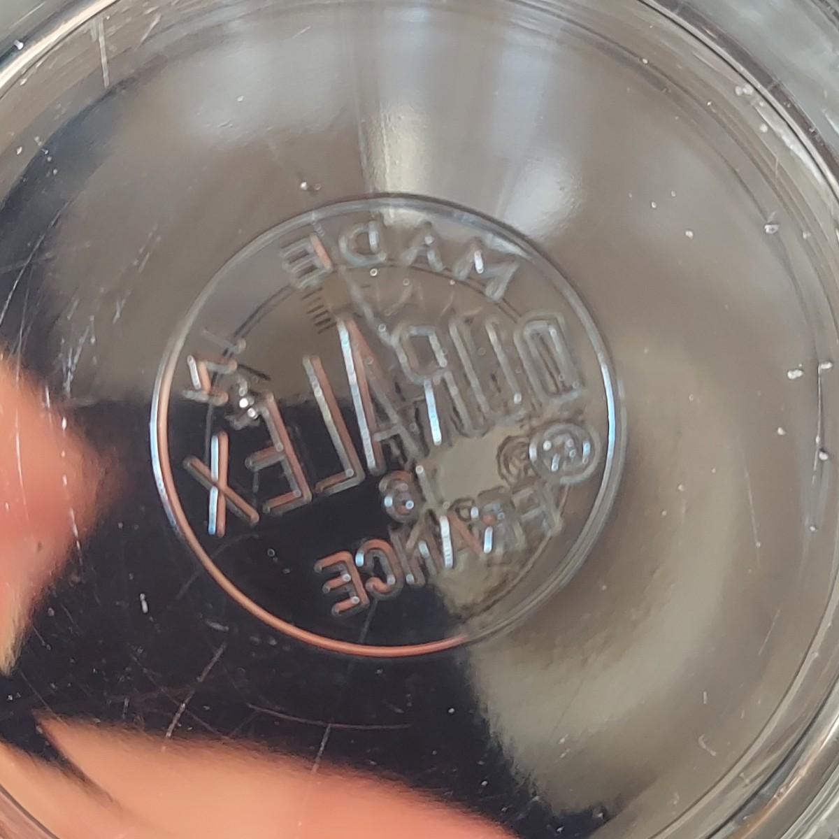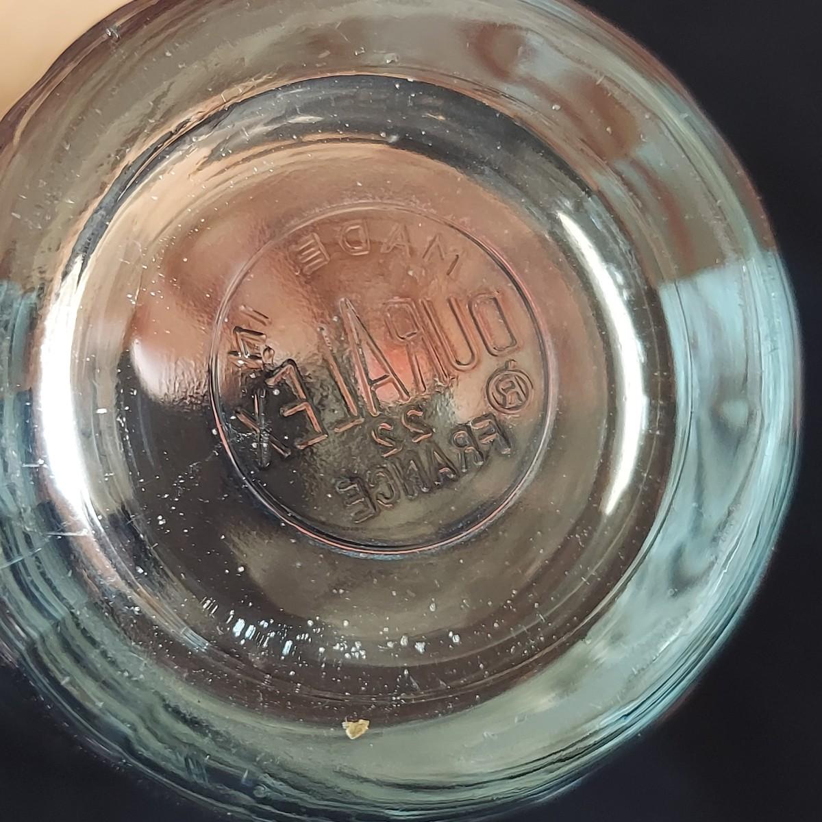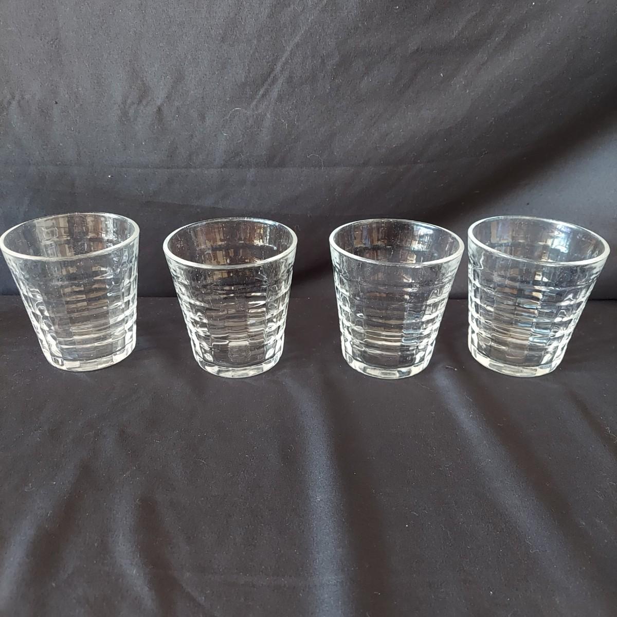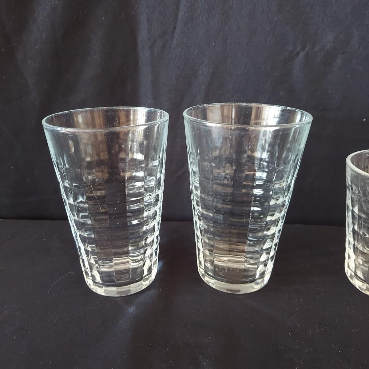 Checkered glasses include two water glasses and four juice glasses. The ribbed set includes four water glasses and three juice glasses. Both sets are marked Duralex on bottom. Glasses have some lights scratches. Please see photos for details. Shipping available