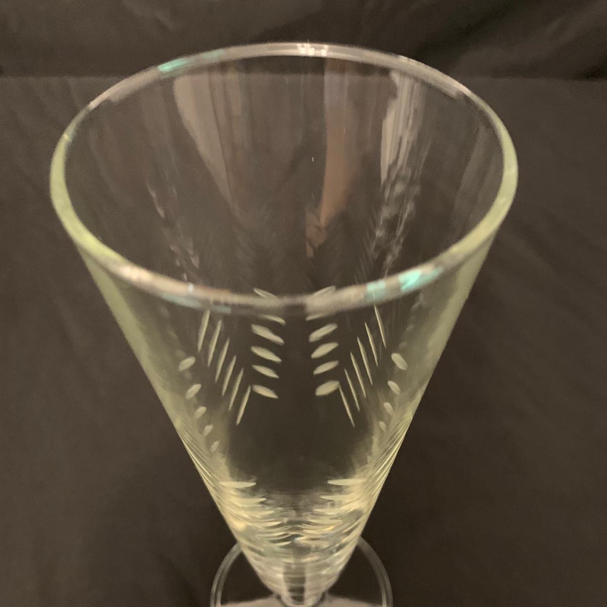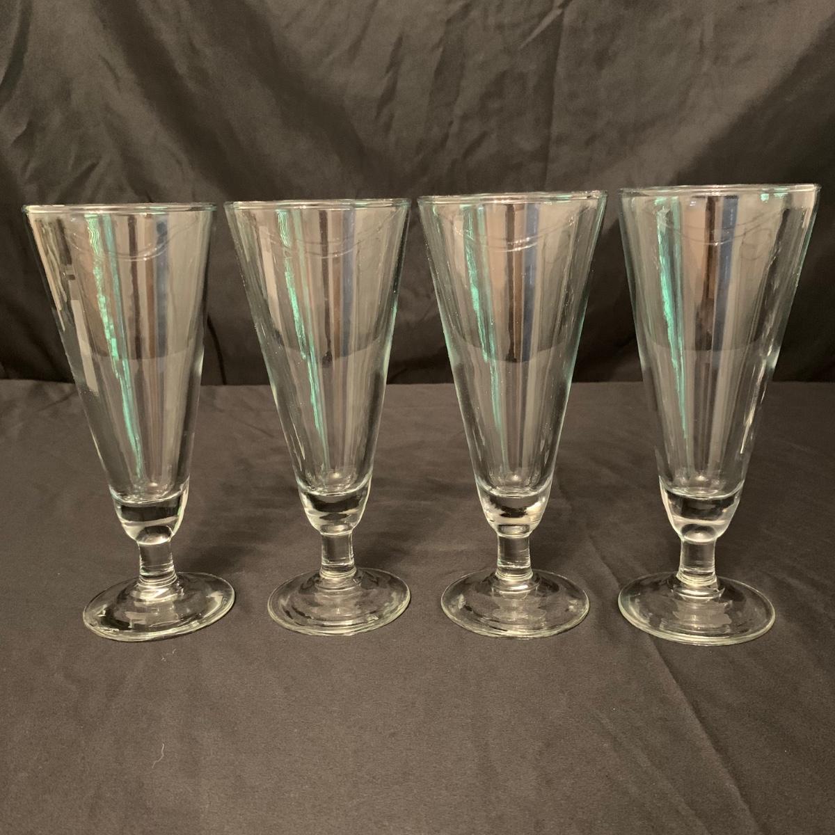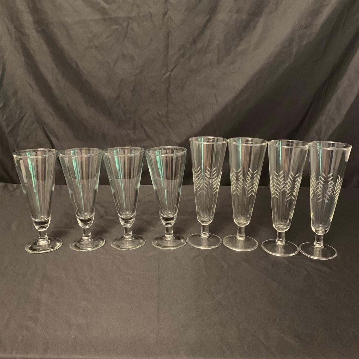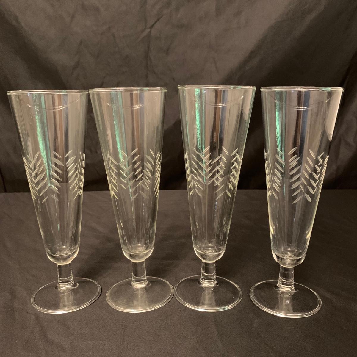 Two sets of Pilsner glasses. One set with an etched design. All glasses are in very good condition. The etched glasses are 8.25” tall. Shipping available.