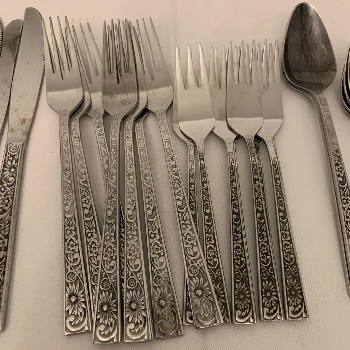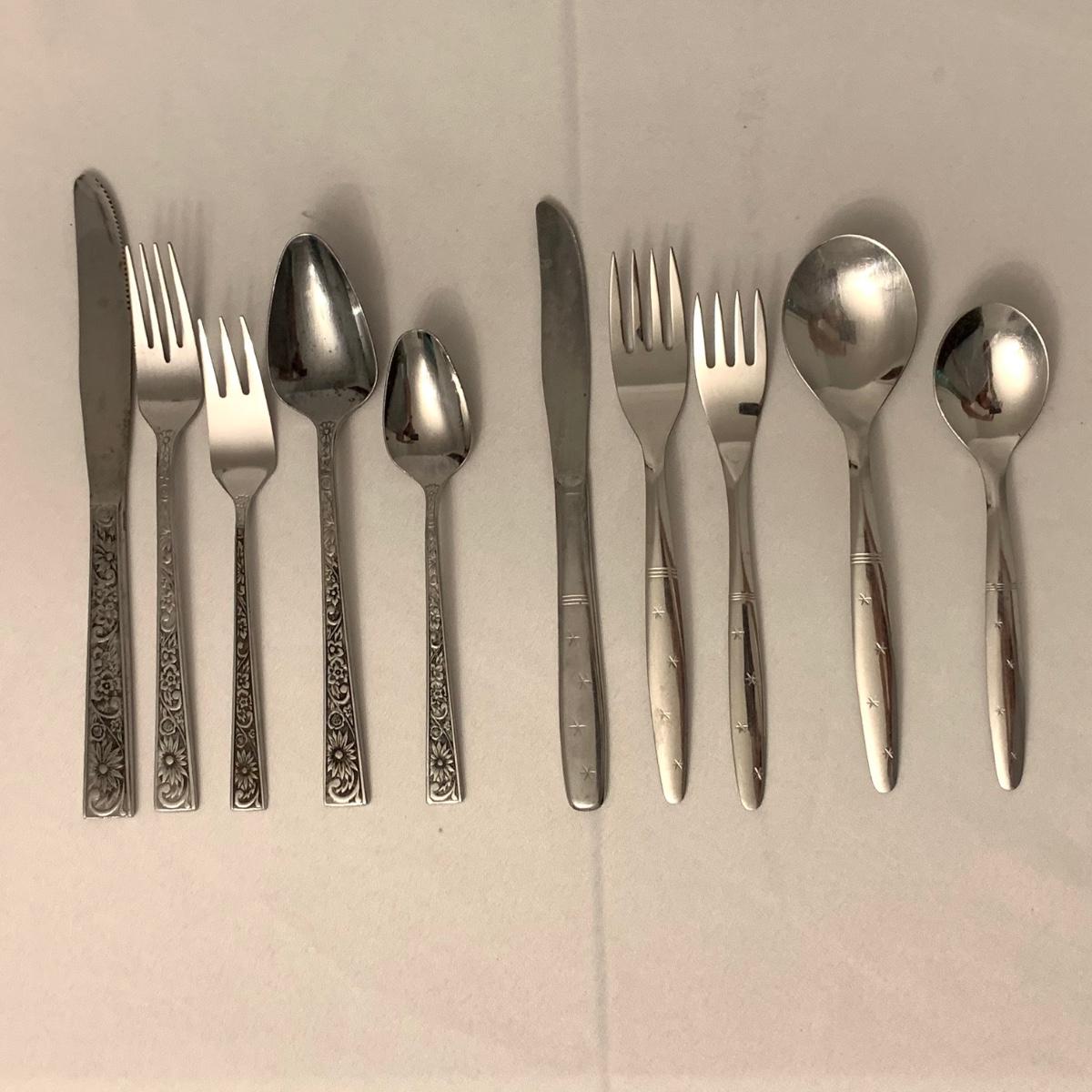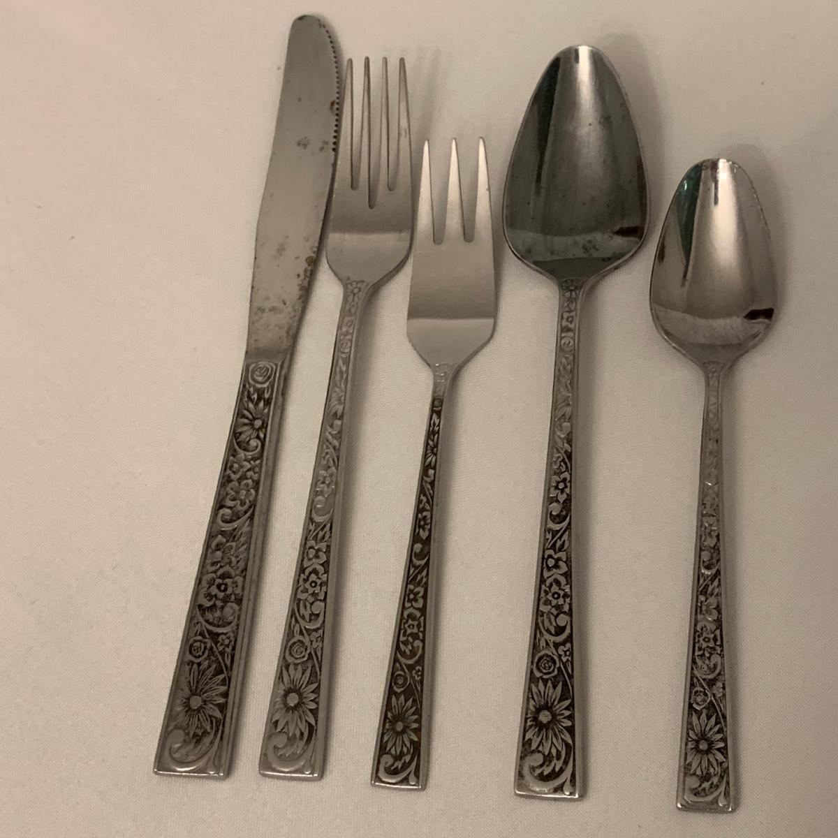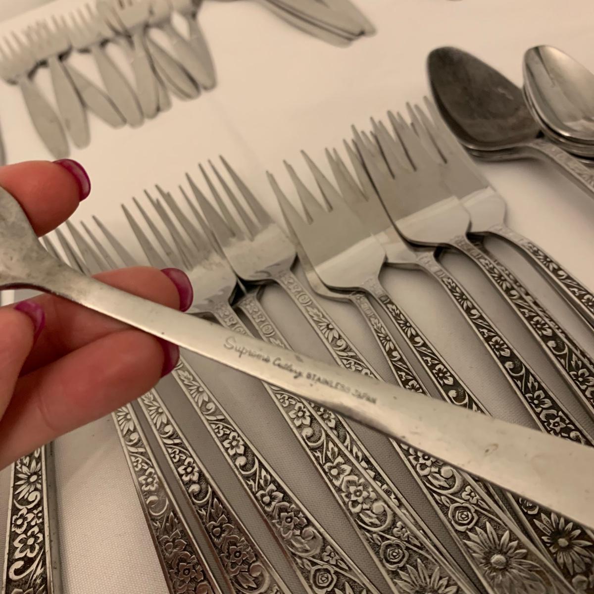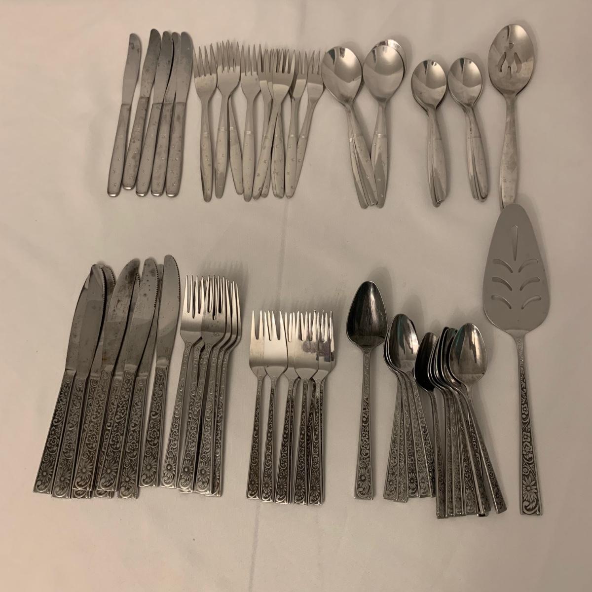 Two sets of stainless steel flatware with ornate handles. The Supreme Cutlery set features a floral design on the bottom of each utensil. Included in this set are: eight knives, seven dinner forks, eight salad forks, two soup spoons, thirteen dessert spoons, and a pie server. The other set doesn’t have a brand name, but is marked “Stainless USA”. In this set there are five knives, four dinner forks, six salad forks, five soup spoons, five dessert spoons, and two serving spoons. Both sets are in good to fair condition, with some stains (possibly cleanable) and nicks on the back of a few of the Supreme Cutlery spoons. See photos. Shipping available.