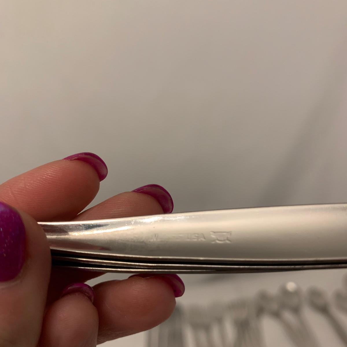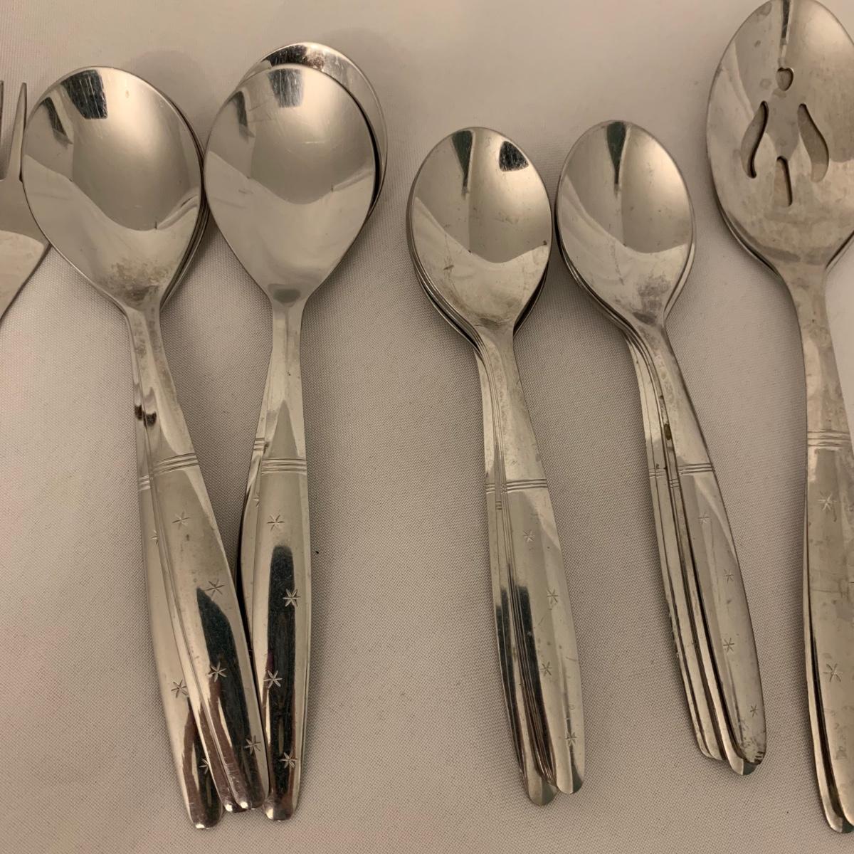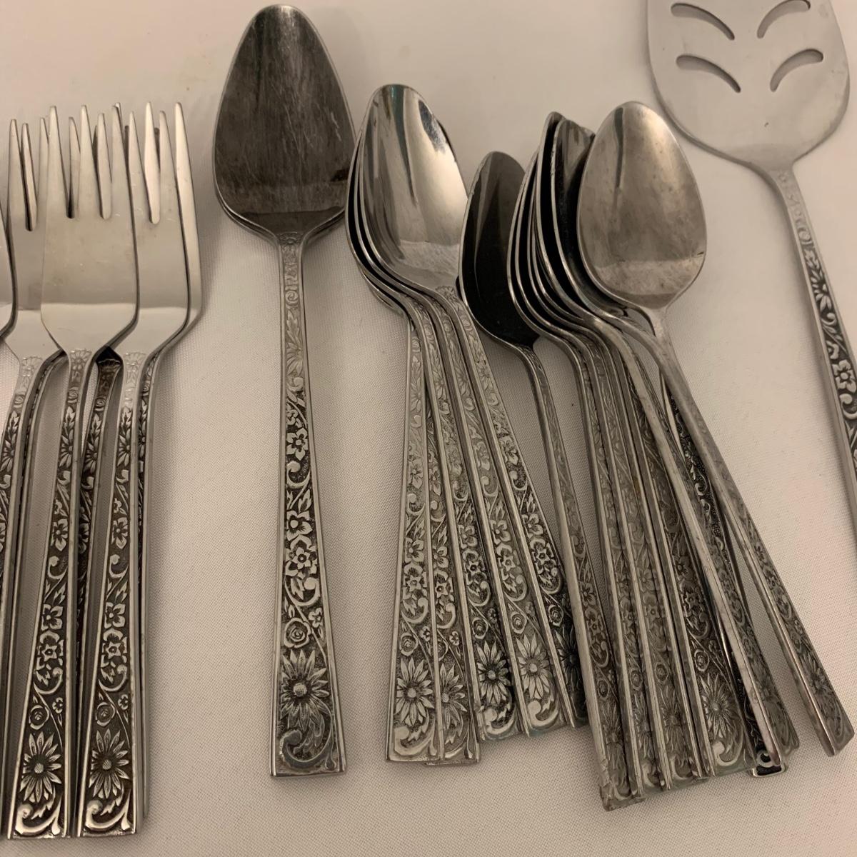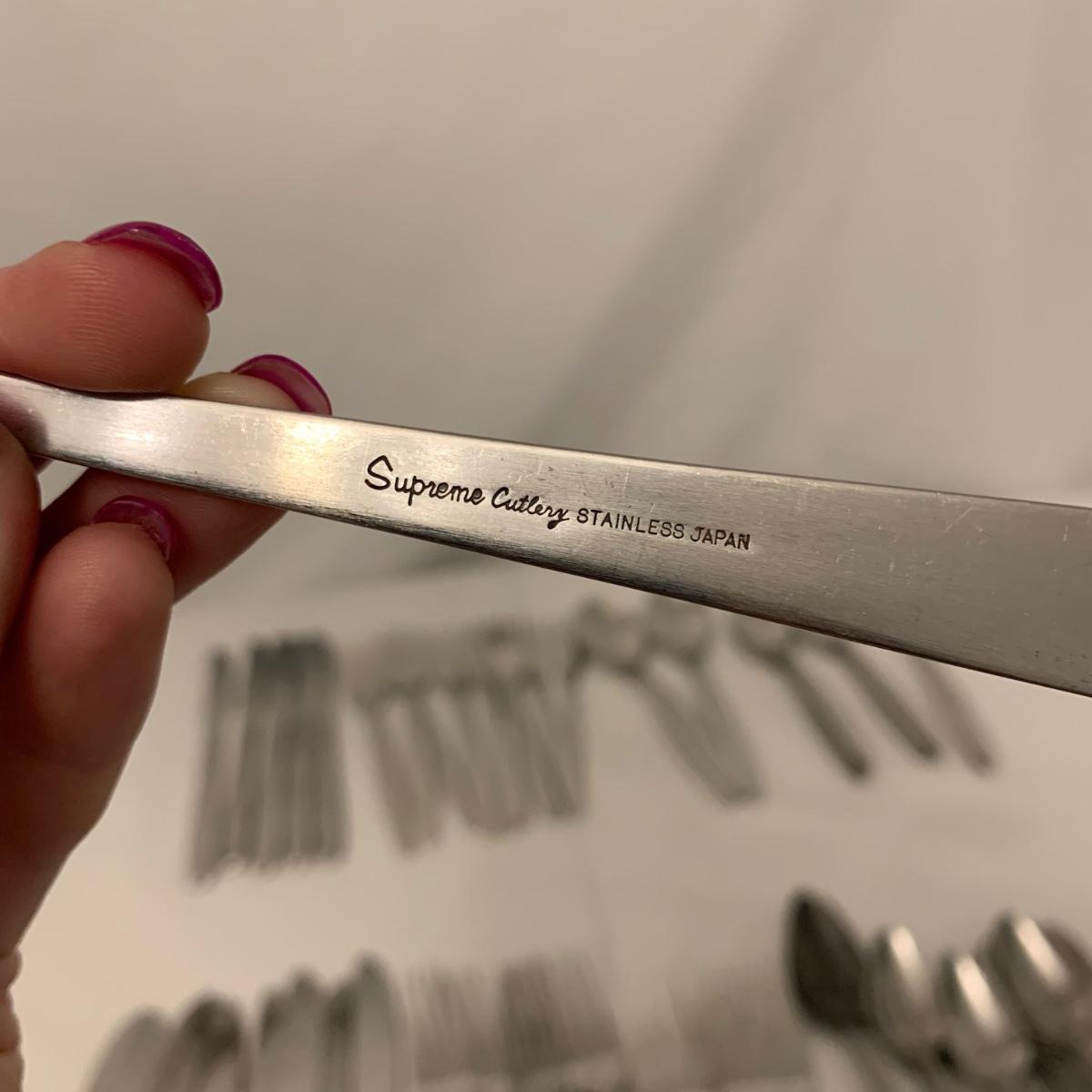Two sets of stainless steel flatware with ornate handles. The Supreme Cutlery set features a floral design on the bottom of each utensil. Included in this set are: eight knives, seven dinner forks, eight salad forks, two soup spoons, thirteen dessert spoons, and a pie server. The other set doesn’t have a brand name, but is marked “Stainless USA”. In this set there are five knives, four dinner forks, six salad forks, five soup spoons, five dessert spoons, and two serving spoons. Both sets are in good to fair condition, with some stains (possibly cleanable) and nicks on the back of a few of the Supreme Cutlery spoons. See photos. Shipping available.