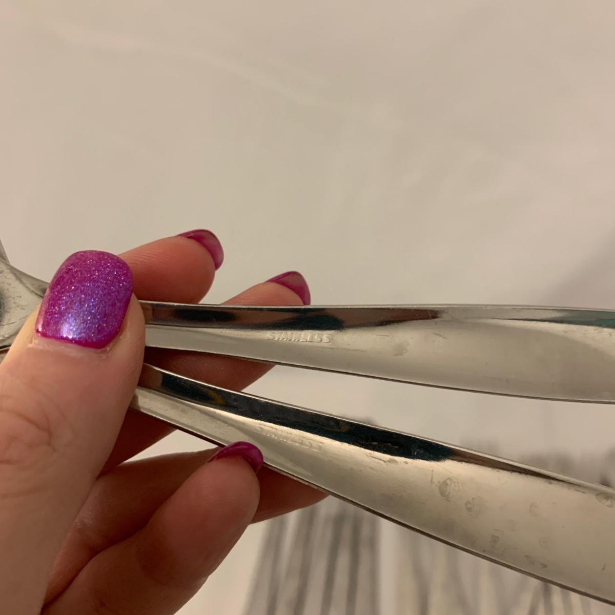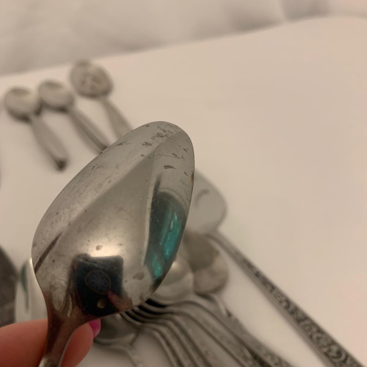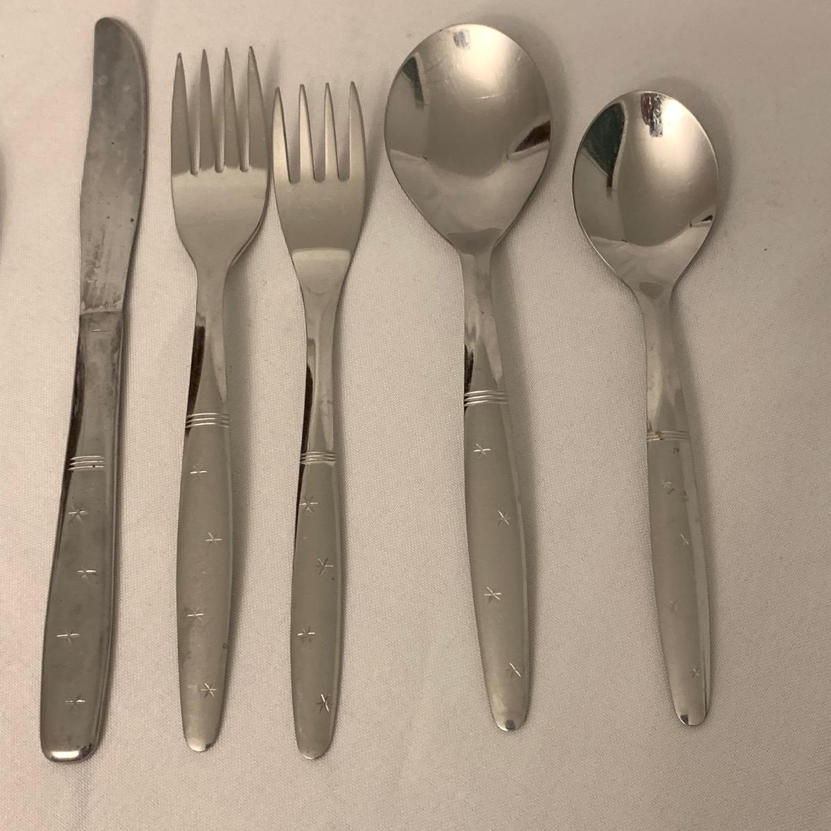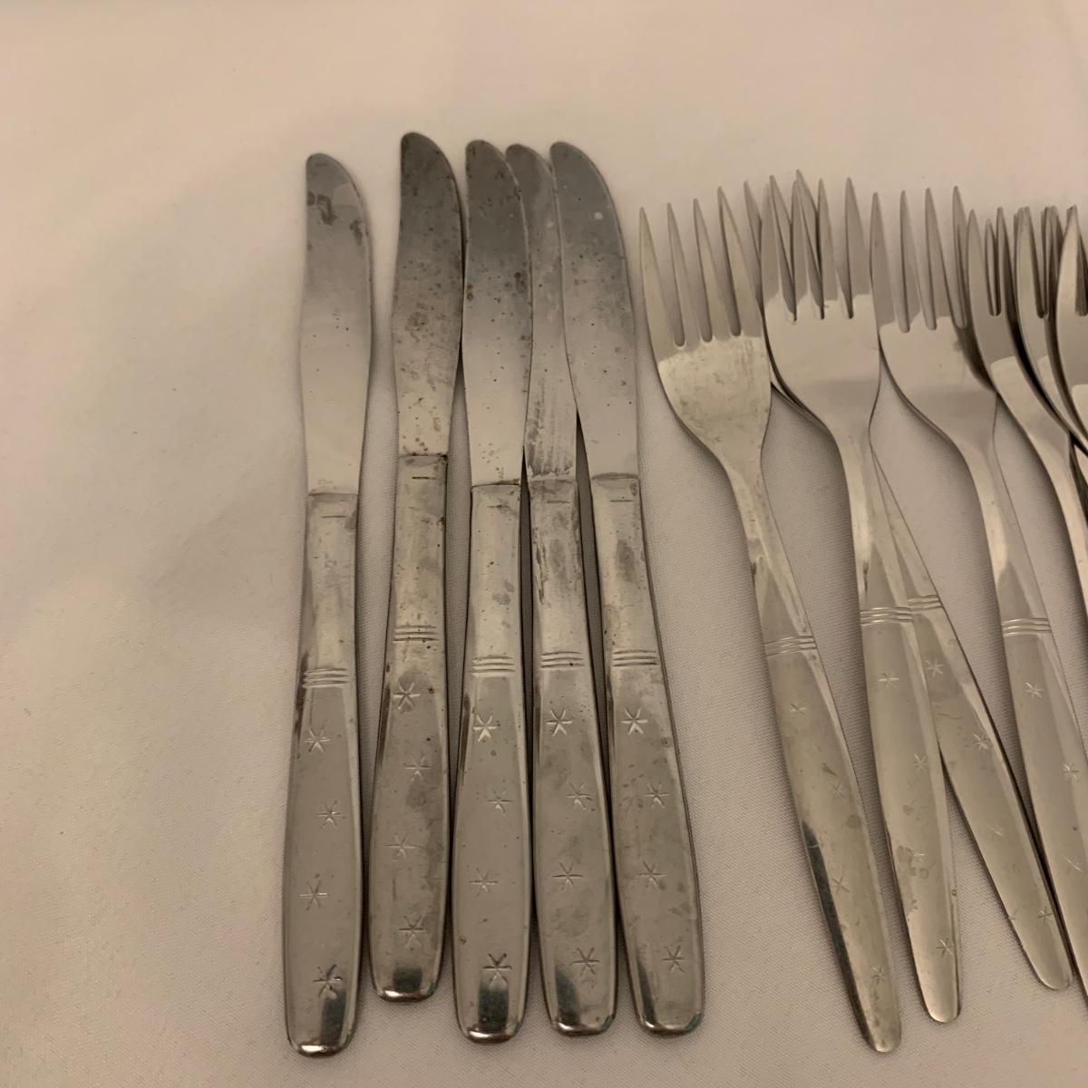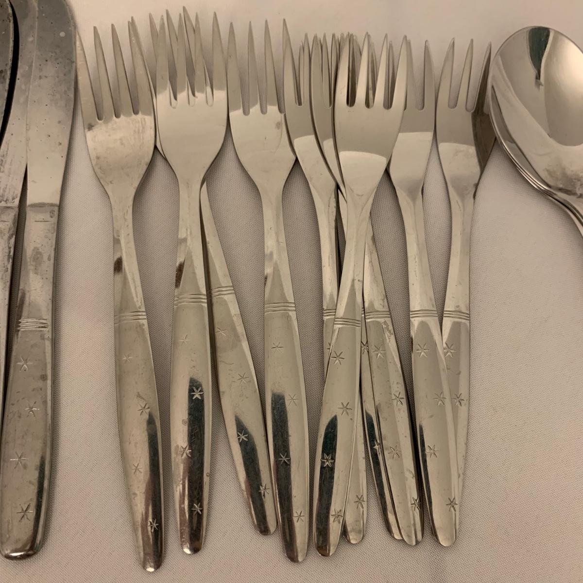 Two sets of stainless steel flatware with ornate handles. The Supreme Cutlery set features a floral design on the bottom of each utensil. Included in this set are: eight knives, seven dinner forks, eight salad forks, two soup spoons, thirteen dessert spoons, and a pie server. The other set doesn’t have a brand name, but is marked “Stainless USA”. In this set there are five knives, four dinner forks, six salad forks, five soup spoons, five dessert spoons, and two serving spoons. Both sets are in good to fair condition, with some stains (possibly cleanable) and nicks on the back of a few of the Supreme Cutlery spoons. See photos. Shipping available.