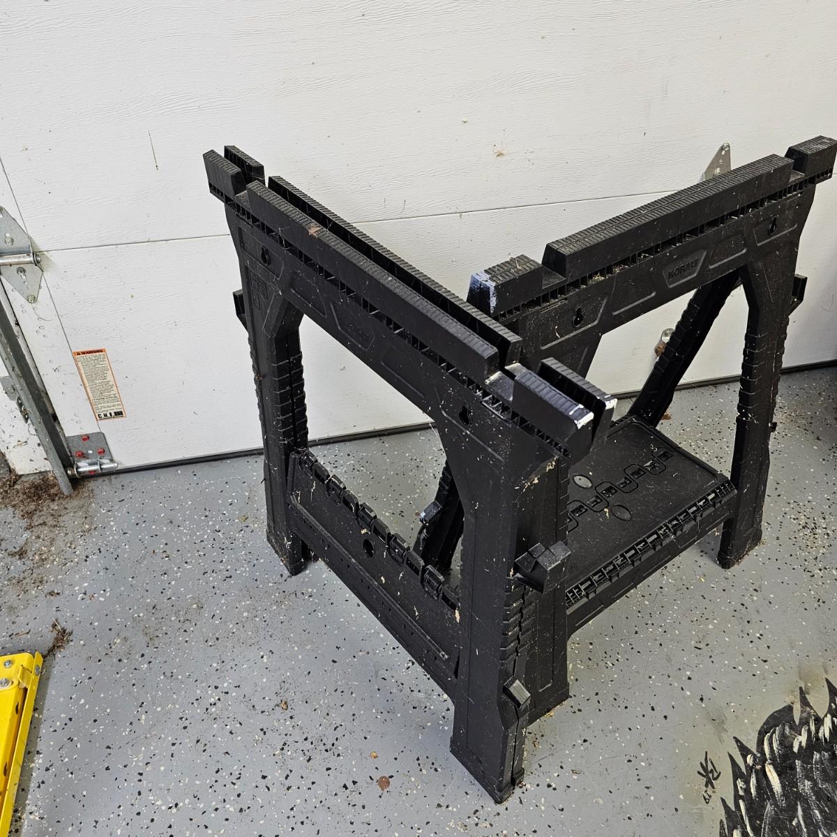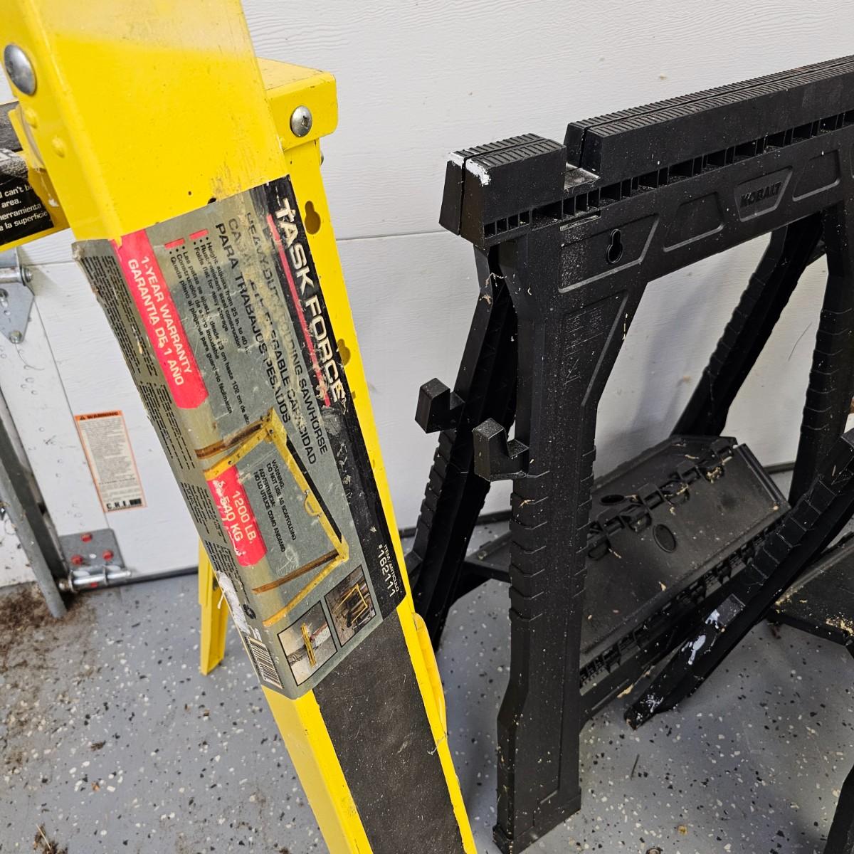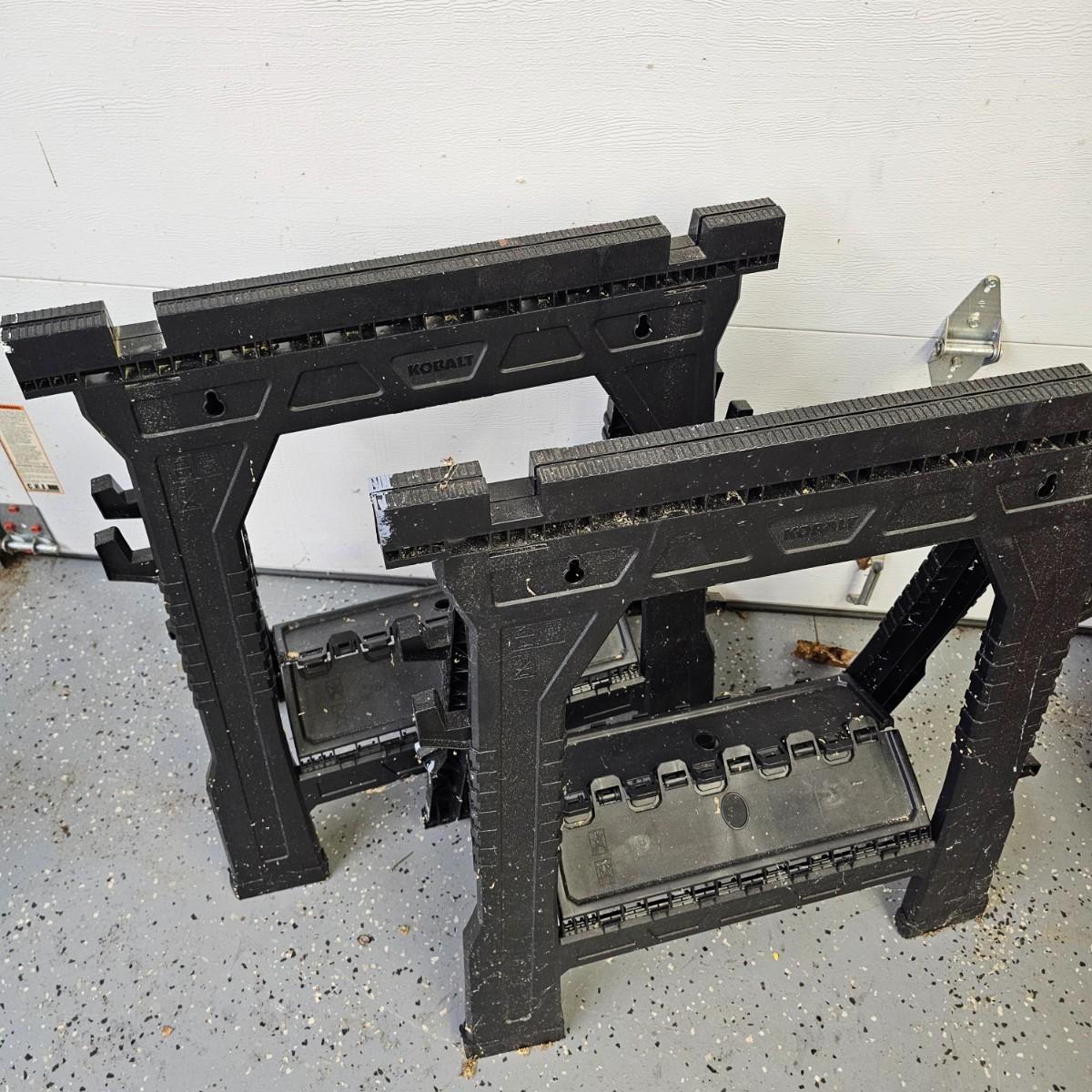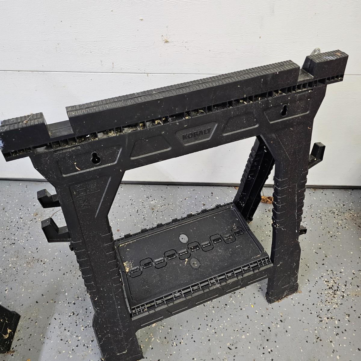 One set Kobalt brand and one set Task Force brand folding sawhorses. Kobalt items are all plastic, measure 26" x 12" x 31.5"H. Task Force pair are all metal, have handles to carry when folded and measure 16" x 38.5" x 33.5"H. All items used, see photos for details. Local pickup only.